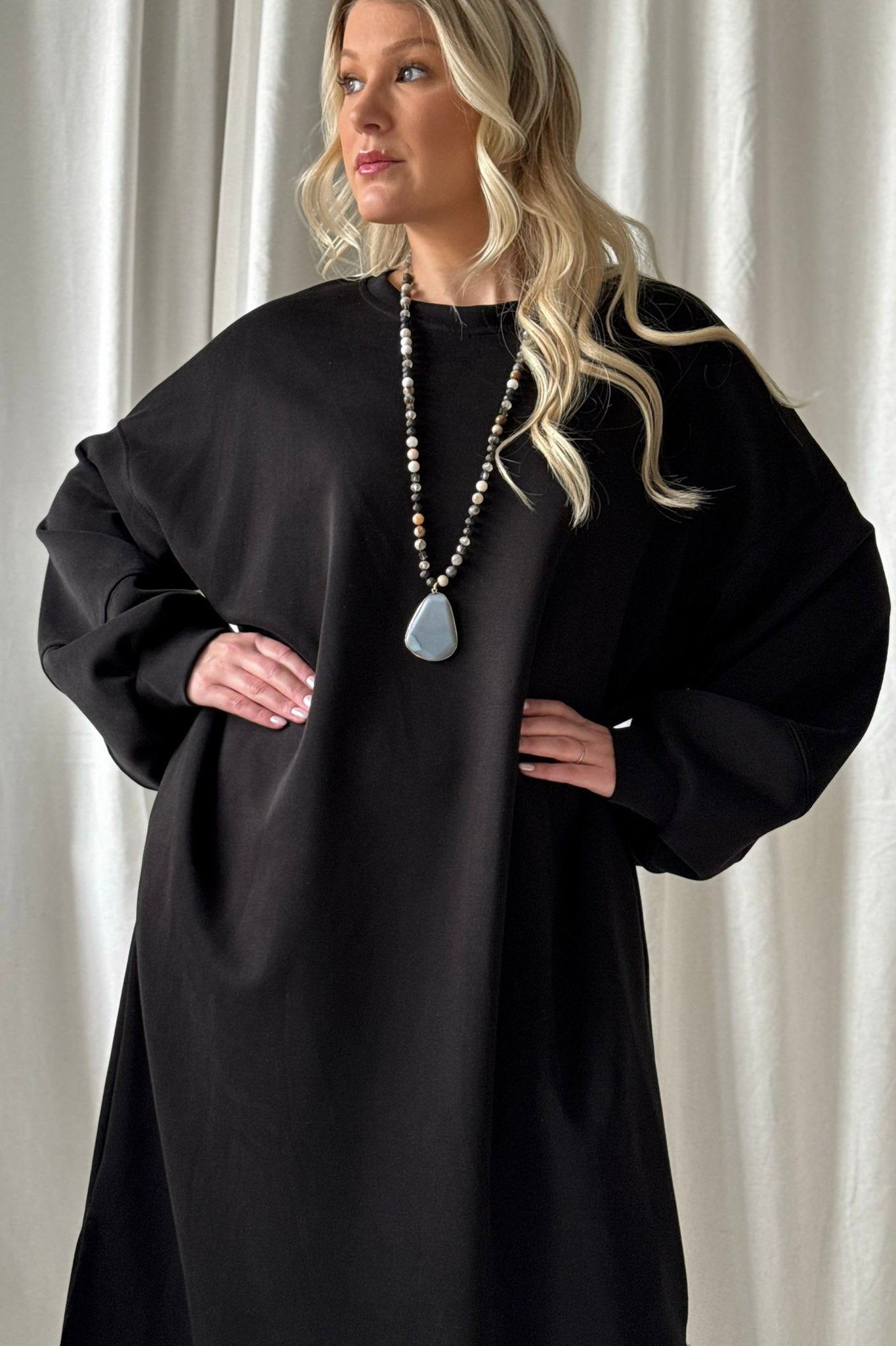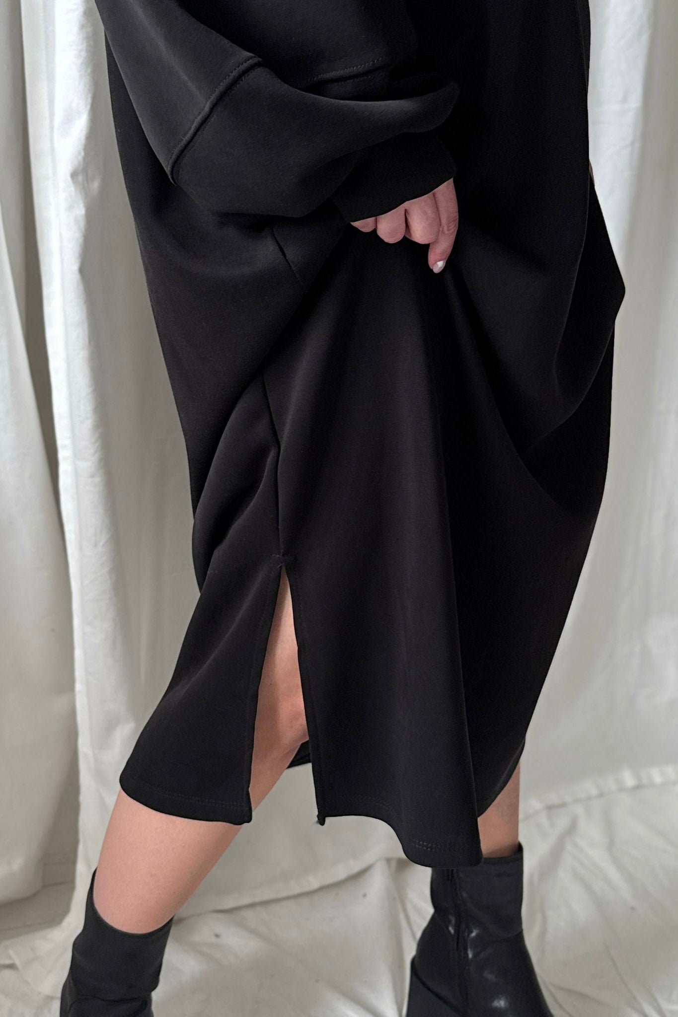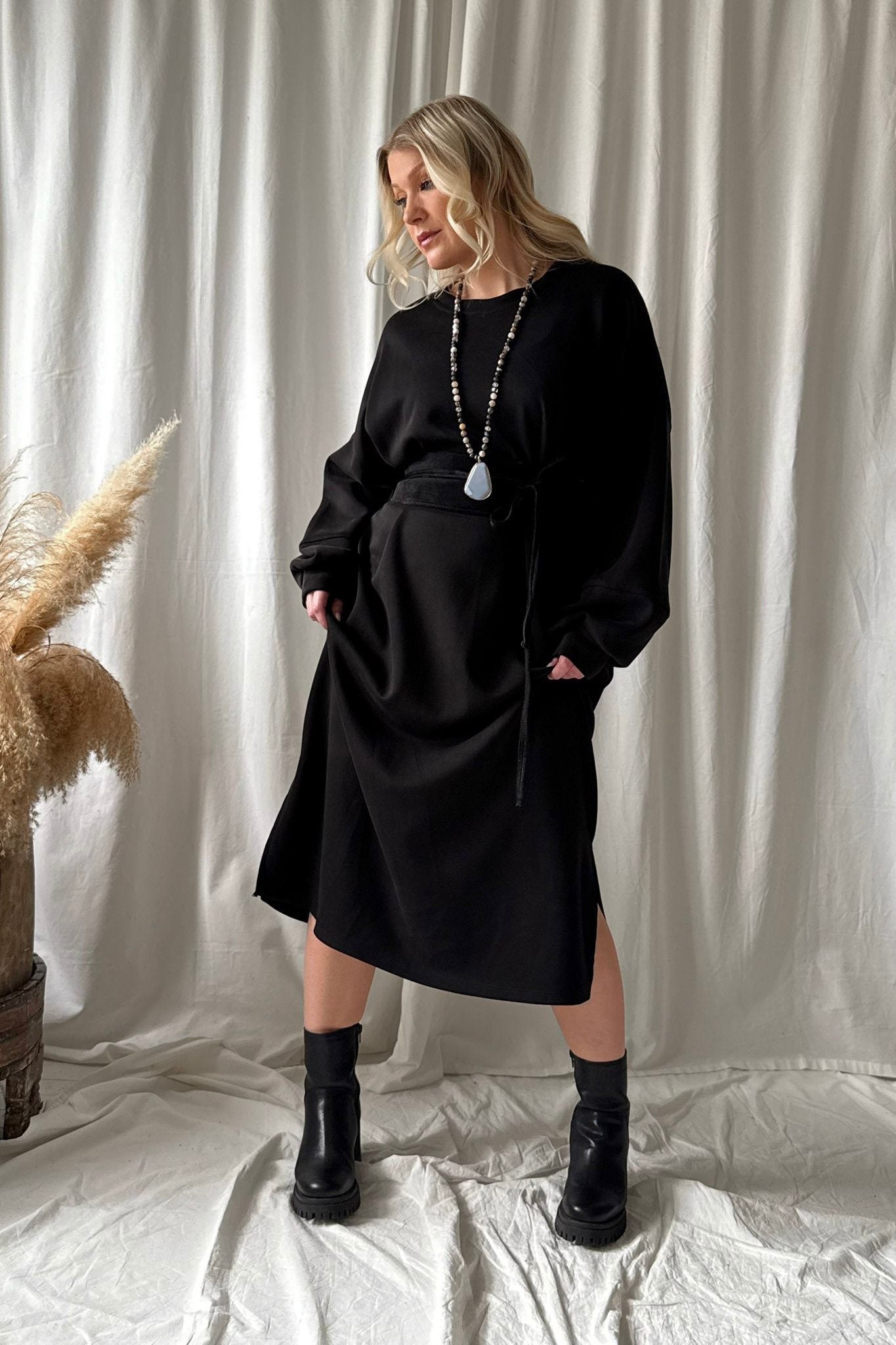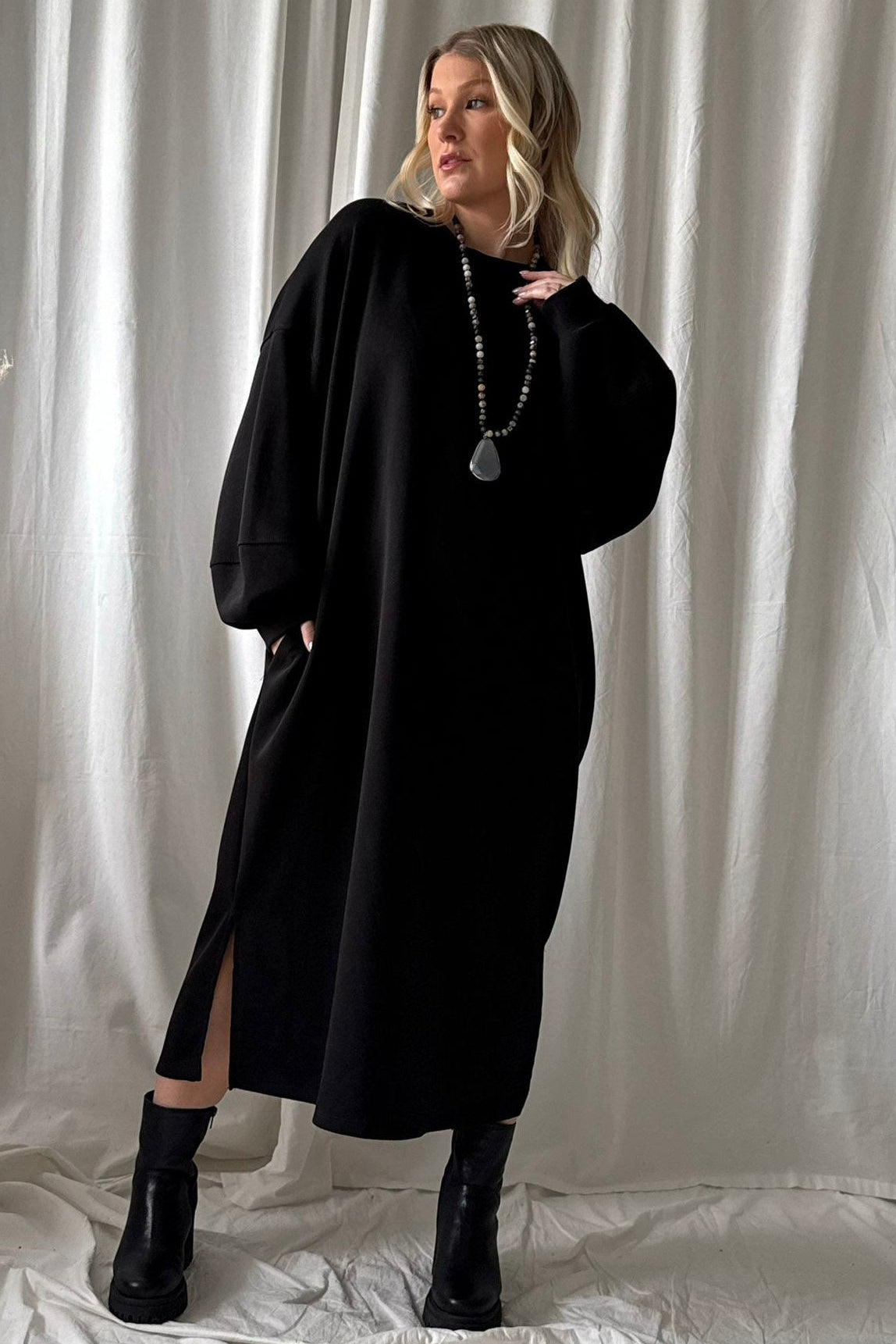 Rento ja pehmeäntuntuinen collegemekko taskuilla. Mekossa on pyöreä pääntie, sivutaskut ja hihoissa resorit. Sivuilla on halkiot.