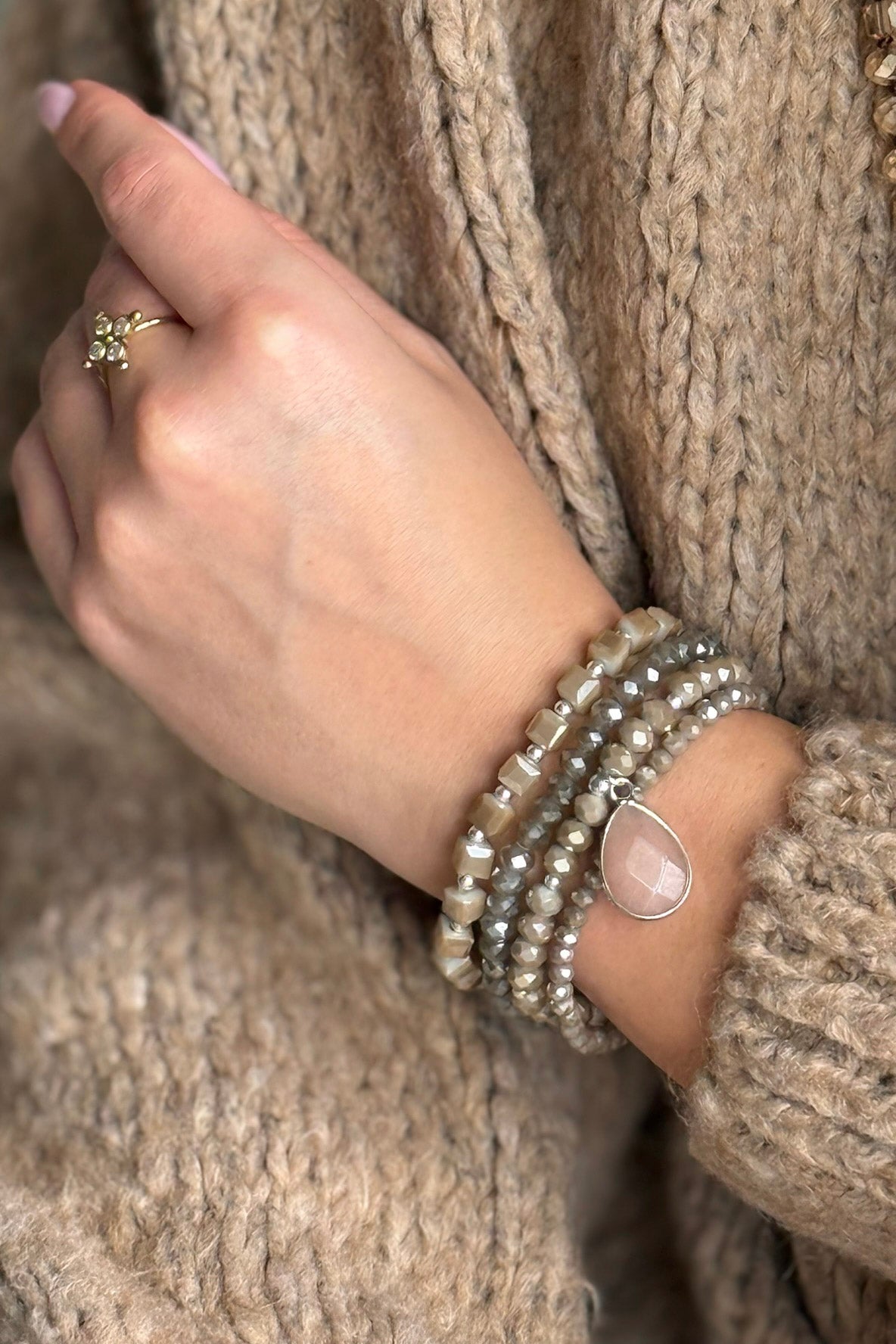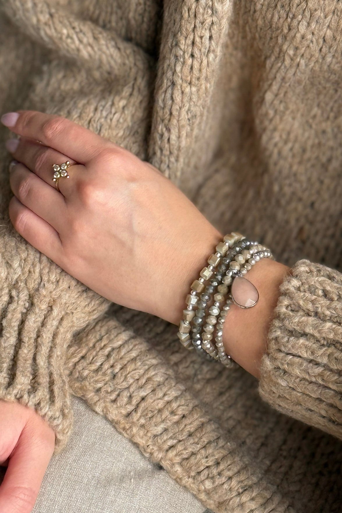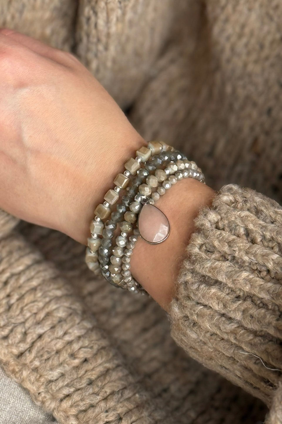 Kimalteleva ja tyylikäs neljän rannekorun yhdistelmä. Korussa on pieniä helmiä ja yksi pisaran muotoinen vaaleanpunainen riipus.