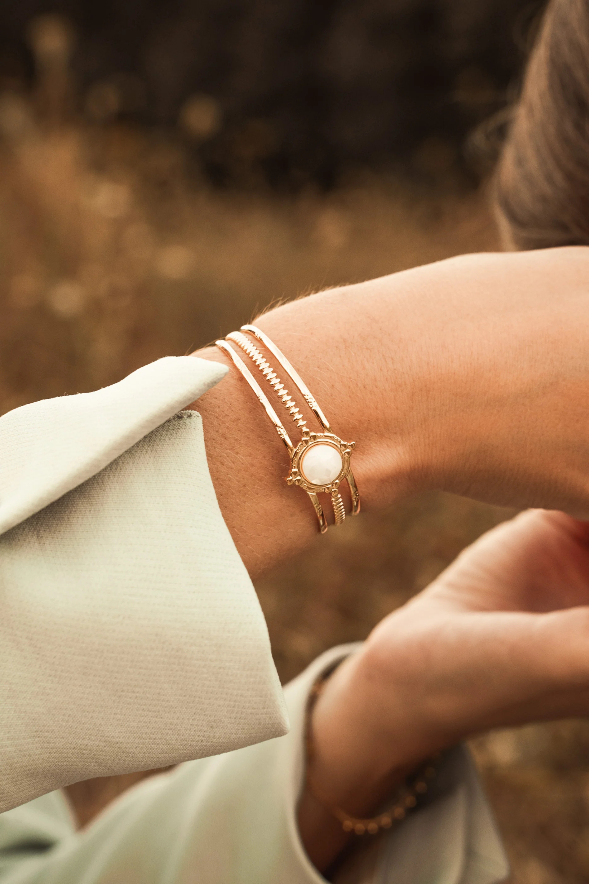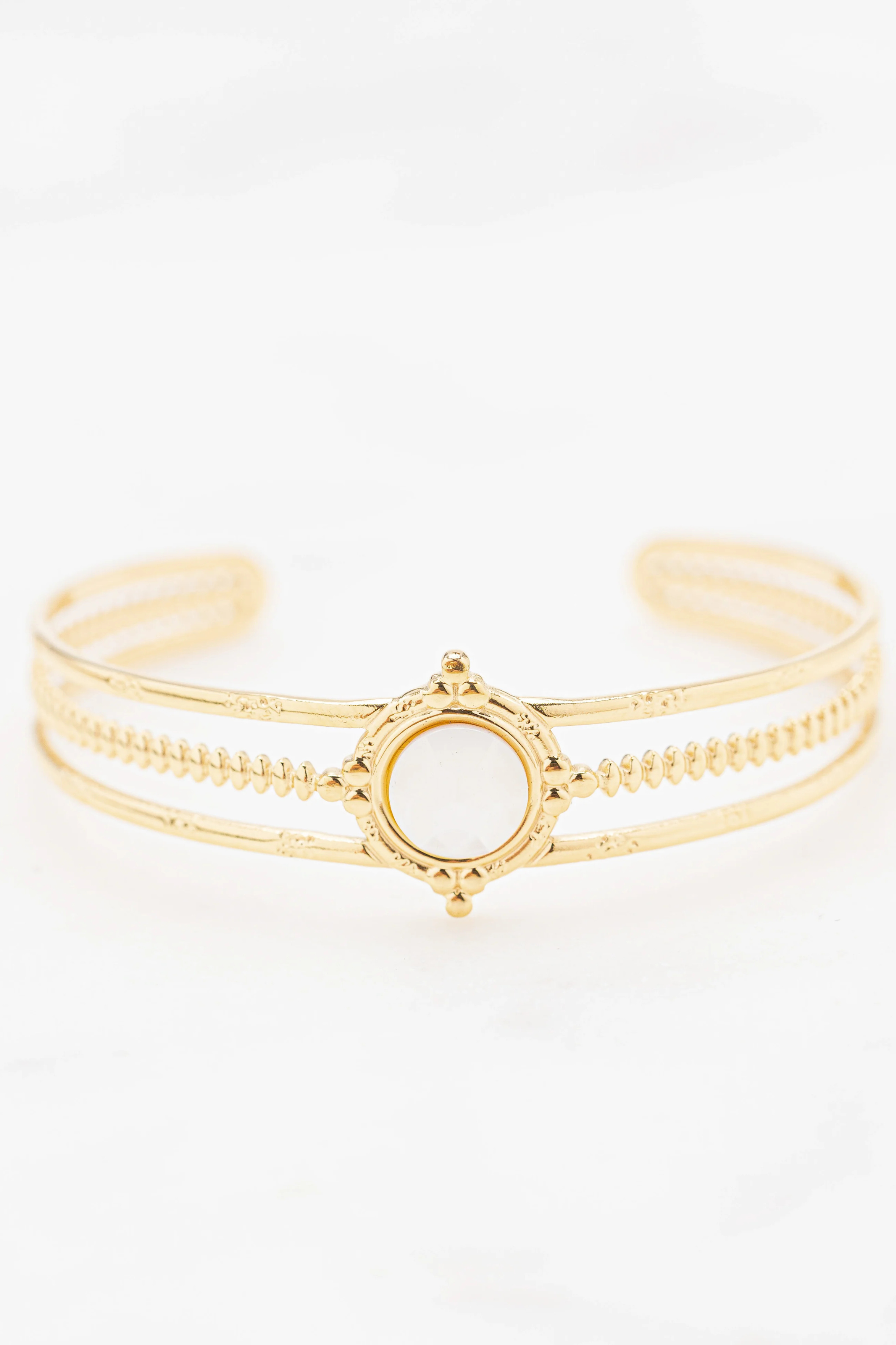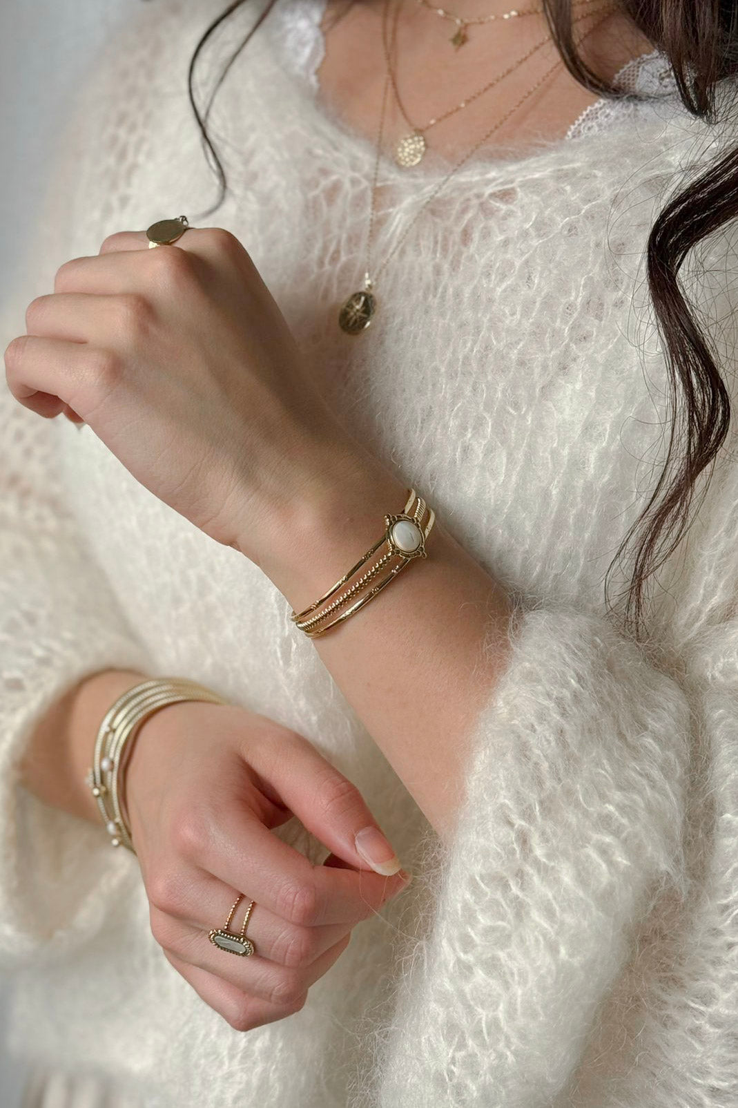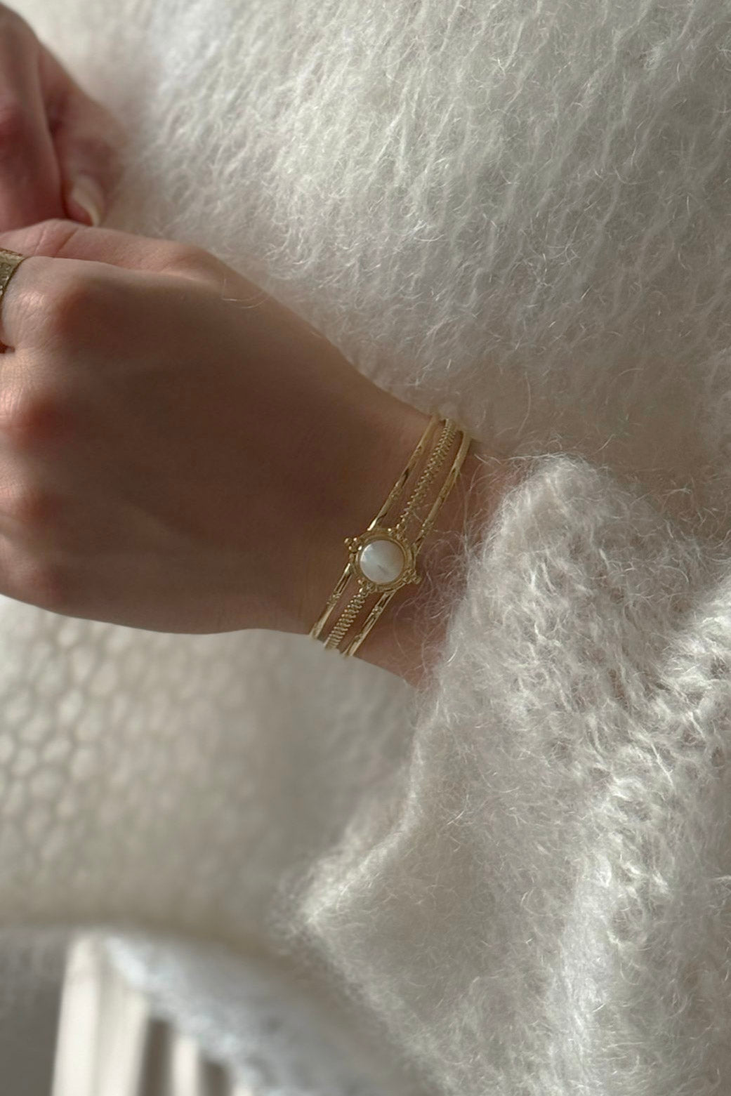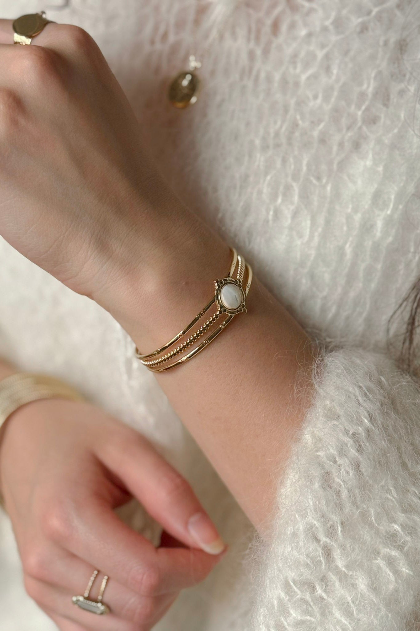 Kaunis säädettävä rannerengas kolmella renkaalla ja ihastuttavalla valkoisella helmiäisyksityiskohdalla.