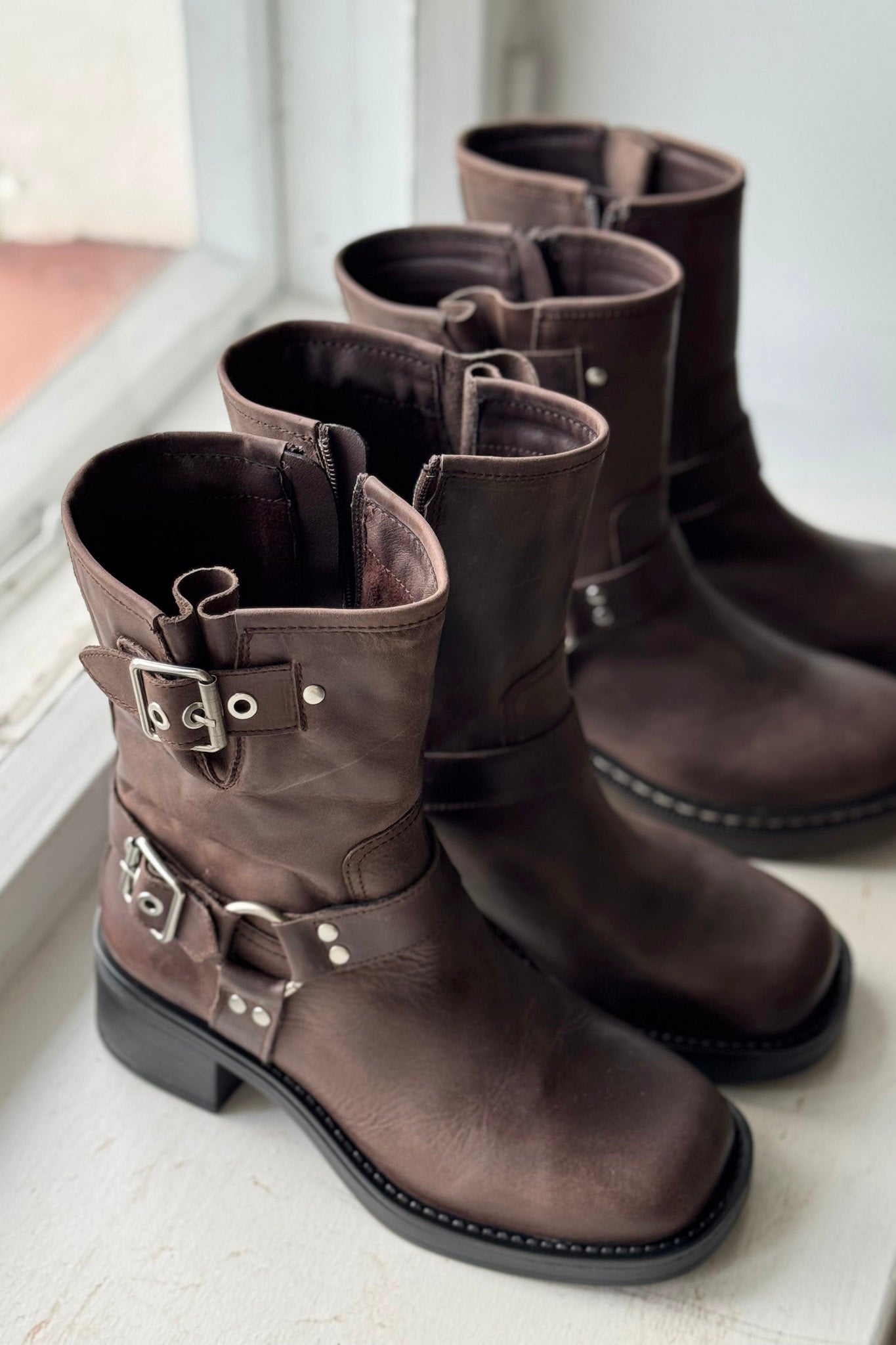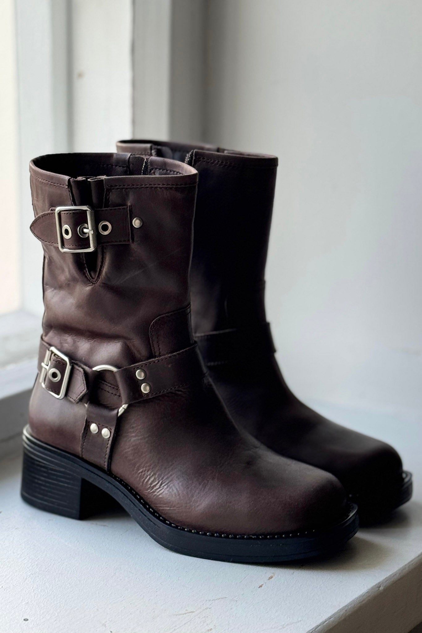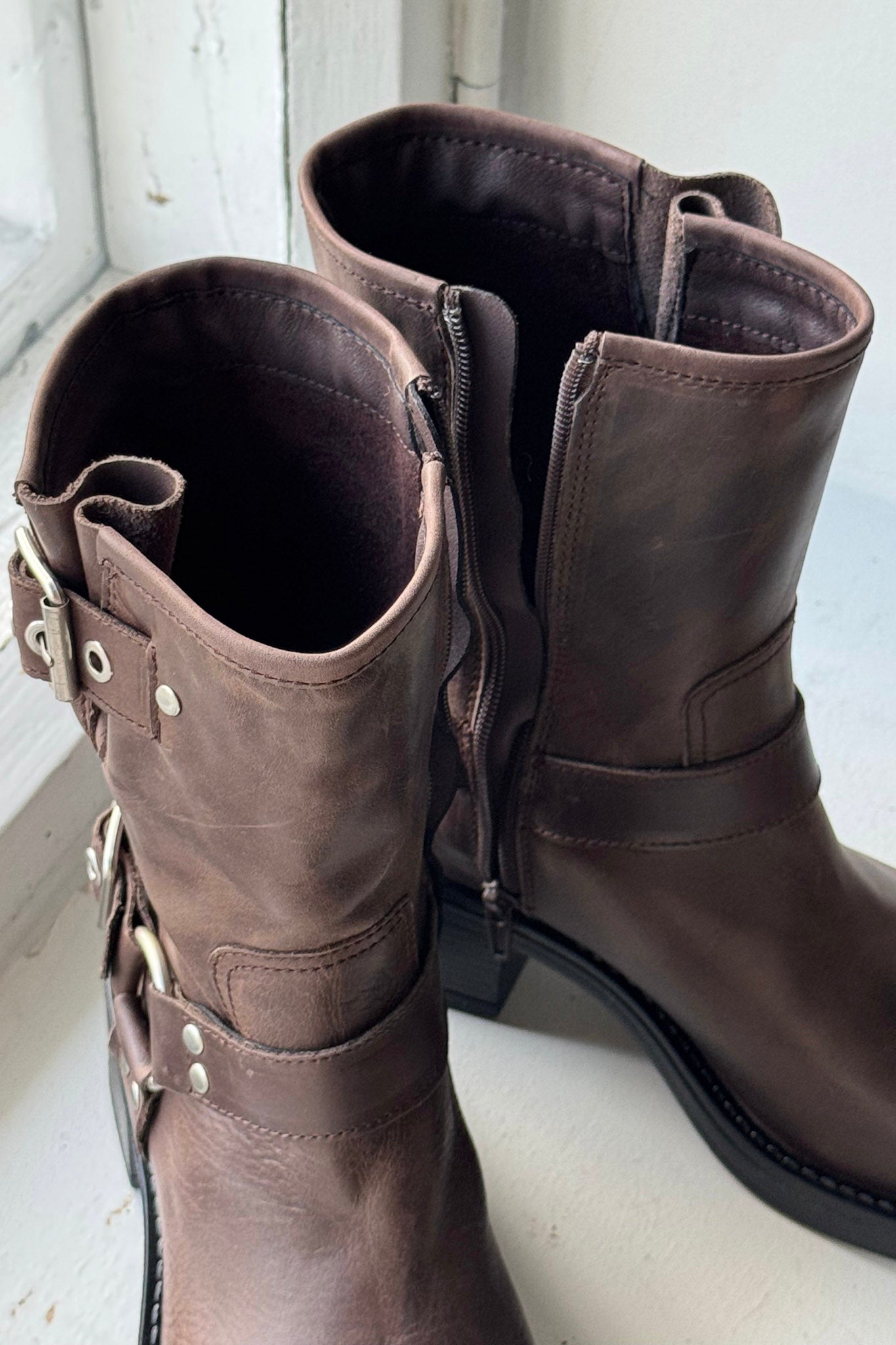 Ruskeat biker bootsit solkikoristeilla ja puolikorkealla varrella. Vetoketjukiinnitys. Sisällä lämmin tekstiilivuori.