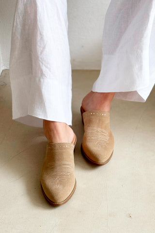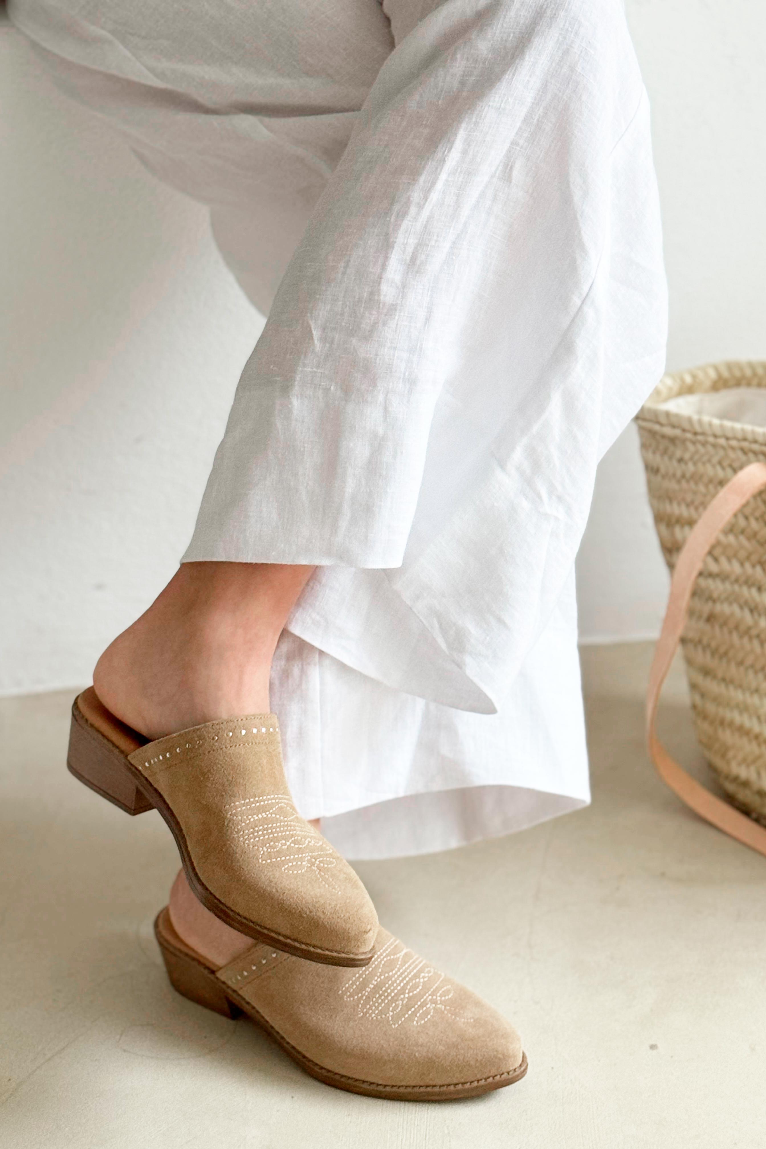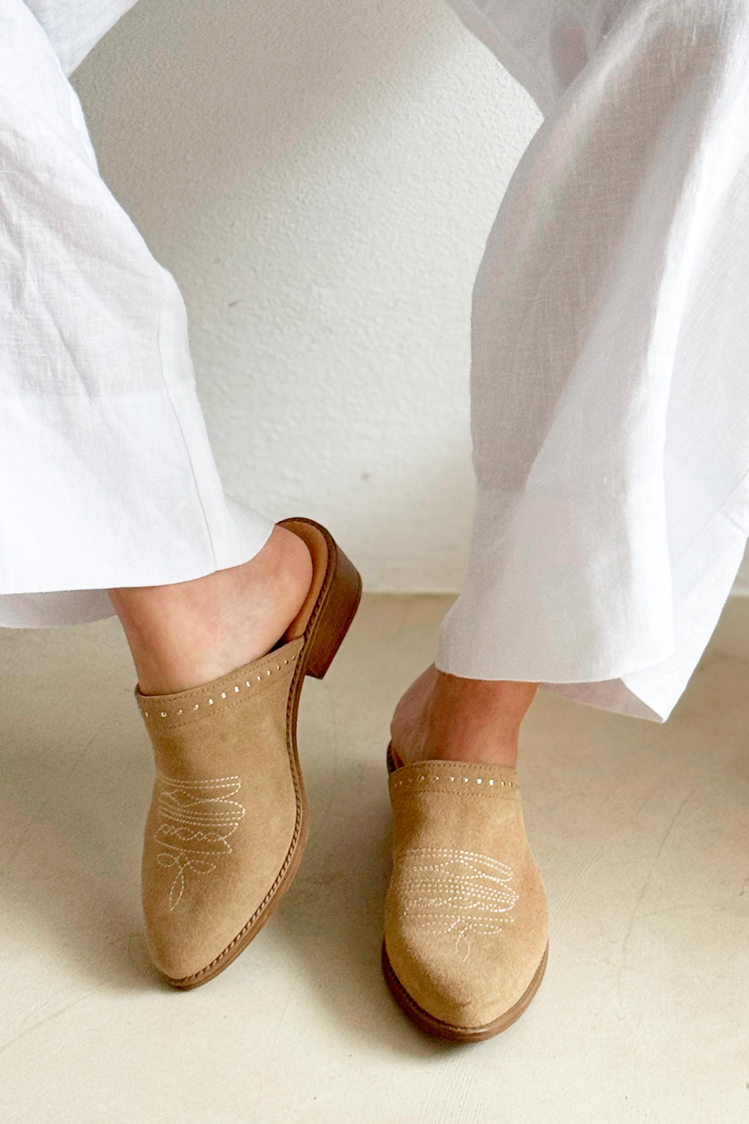 Ajattoman trendikäs mokkanahkainen cowboy pistokas vaaleilla tehostetikkauksella ja hopeanvärisillä niittiyksityoskohdilla. Kengässä on pehmustettu nahkapohjallinen. Ulkopohja ja korko synteettistä materiaalia, sisäpohja ja päällinen nahkaa.