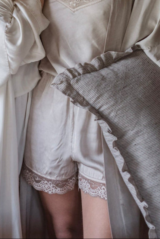 Elegantit ja ylelliset satiinishortsit on suunniteltu täydelliseksi osaksi yöpukeutumista. Fleur satiinishortsit hurmaavat keveydellään, silkkimäisellä pinnallaan ja kauniilla pitsiyksityiskohdillaan. Shortseissa on mukavan joustava resori ja materiaali tuntuu iholla viileältä ja pehmeältä – täydellinen valinta rauhallisiin iltahetkiin ja rentoihin aamuhetkiin.