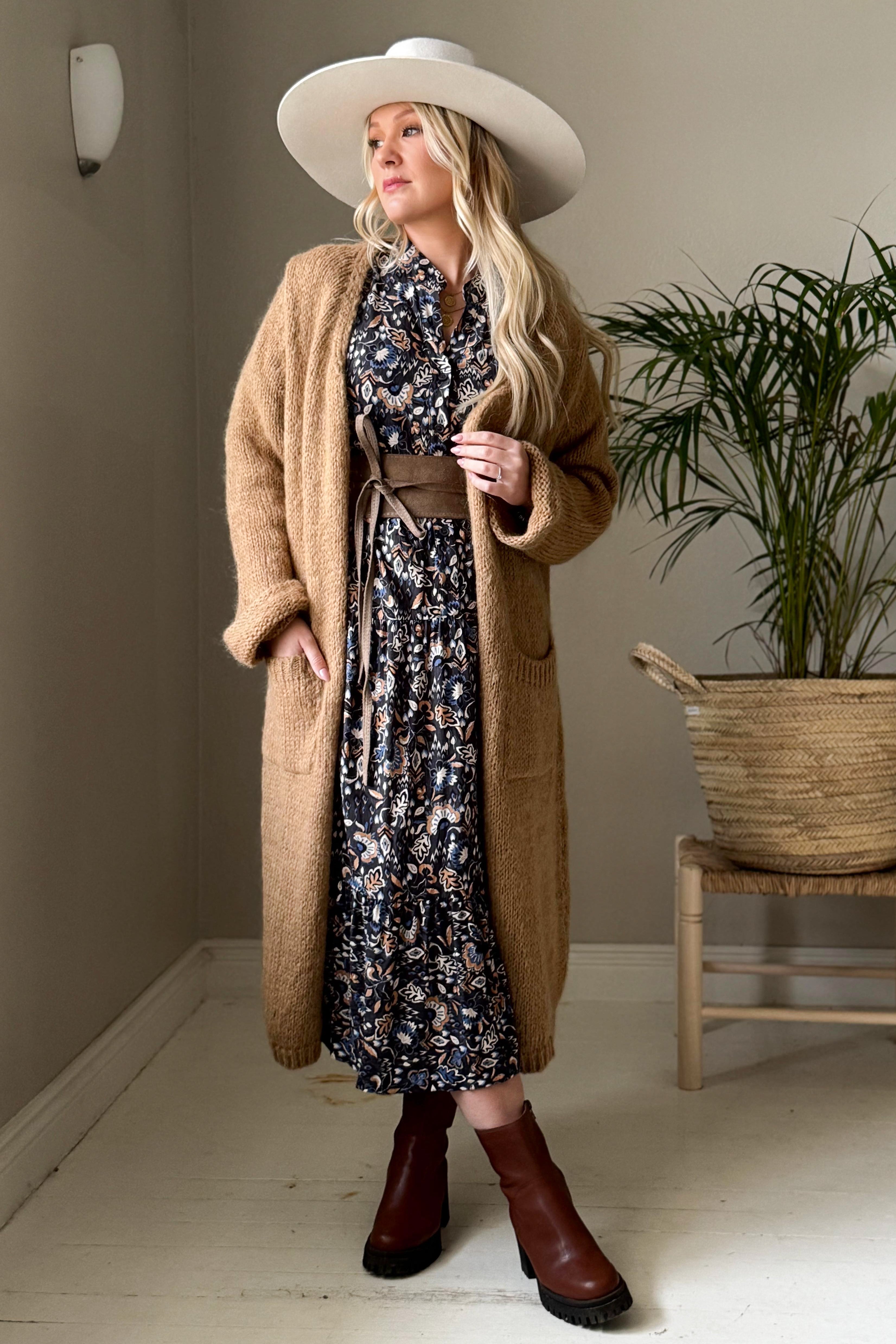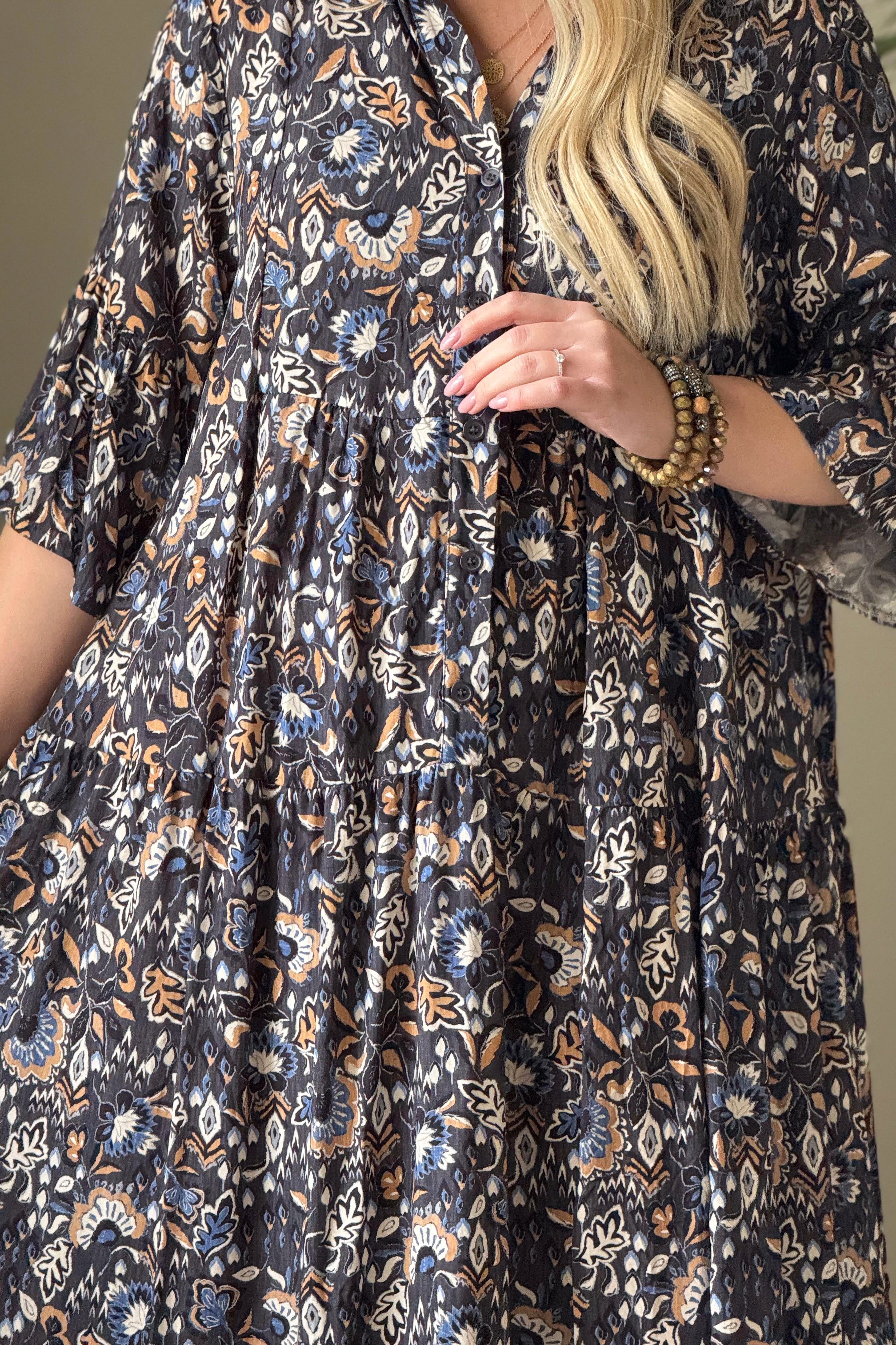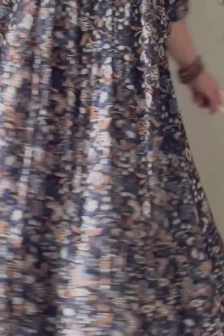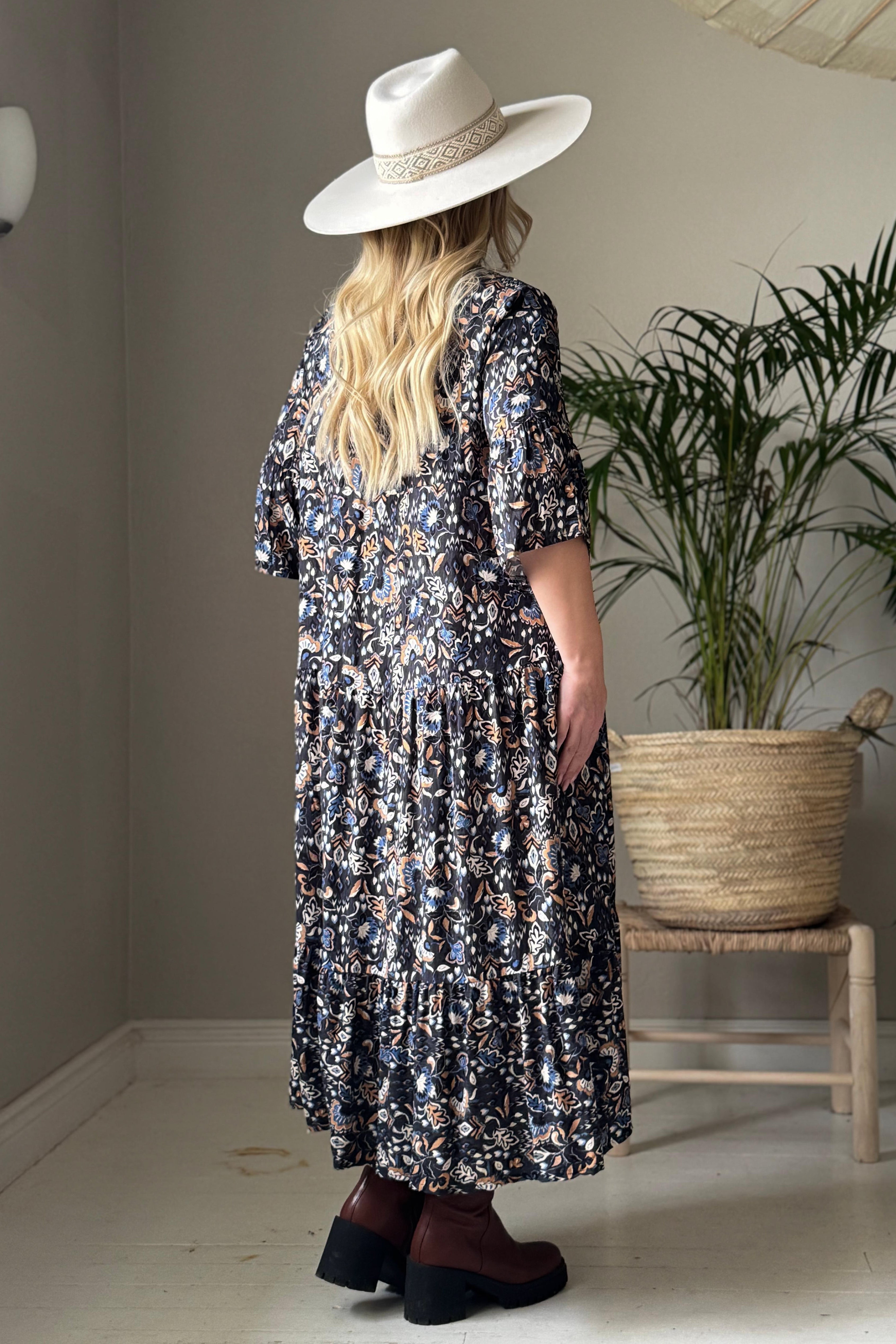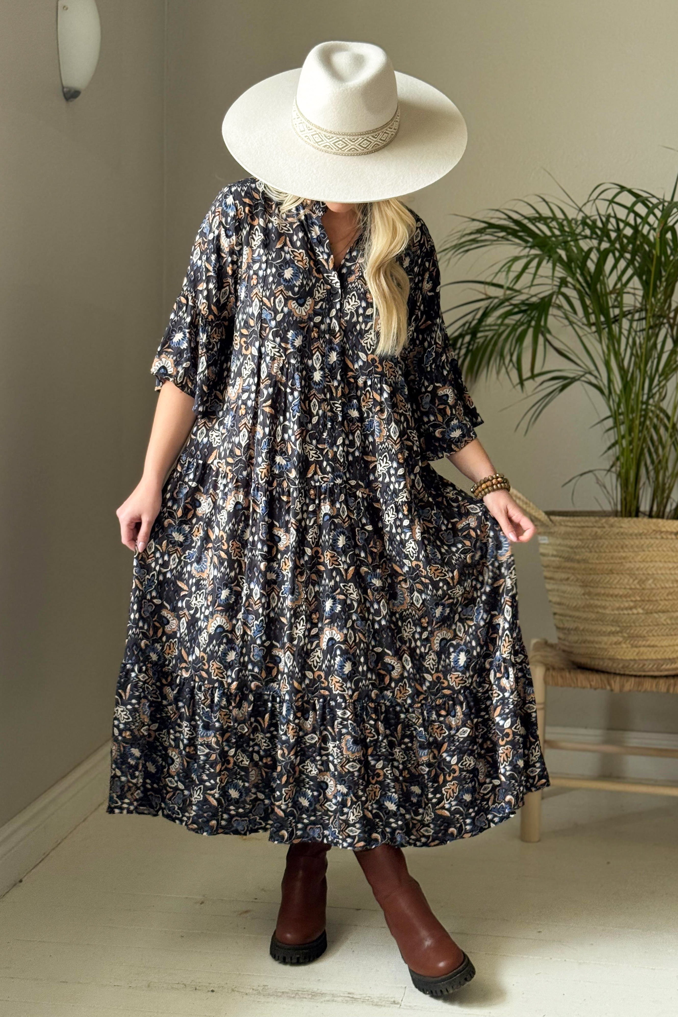 Midi pituinen viskoosimekko kauniilla kuosilla. V-mallinen pääntie ja mekon yläosassa edessä napit. Poikkileikkaus rinnan alla. A-linjainen helma ja levenevät hihansuut.