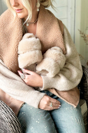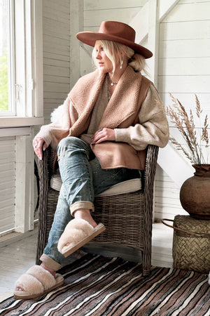 Shepherd of Swedenin ihanat Tessan tossut. Tossuissa leveä kaulus pitkäkarvaisesta lampaannahasta. Ulkopohja EVA-materiaalia. Normaali lesti.