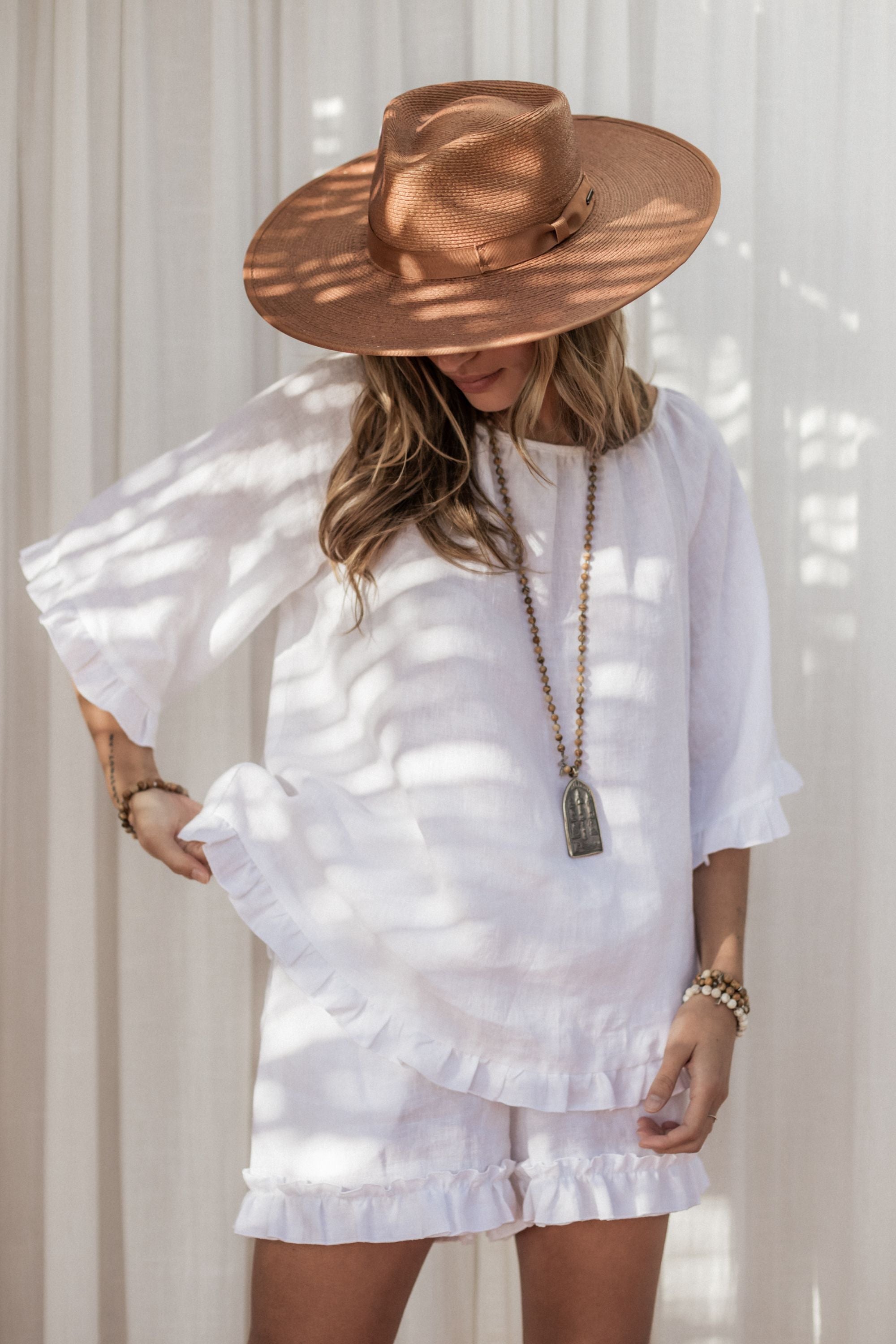 Täydellinen yhdistelmä mukavuutta ja naisellista keveyttä. Laadukas pellavakangas hengittää ja tuntuu ihanan ilmavalta iholla, tehden siitä täydellisen valinnan lämpimiin päiviin. Paidassa on avara pääntie sekä kauniit frillat helmassa ja hihoissa, jotka tuovat paidalle romanttisen ilmeen, kun taas väljä leikkaus antaa rennon ja huolettoman fiiliksen.