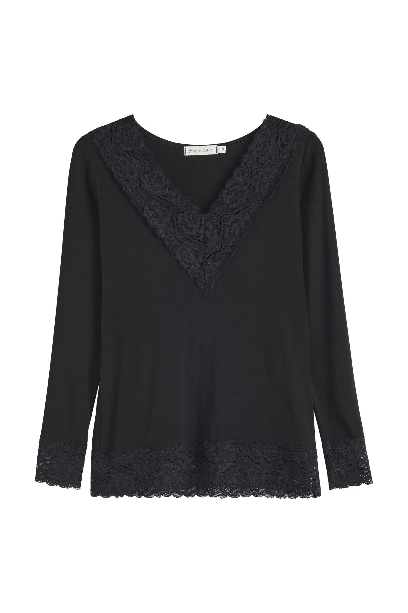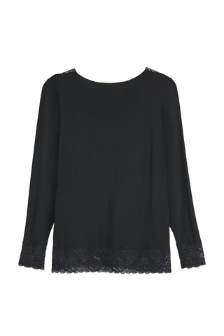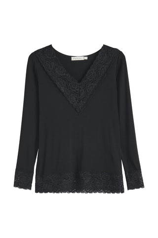 Bamboo Lace-malliston ylellinen paitakaunotar, jonka sensuelli leveä pitsi on etuosassa V-kaula-aukossa. XS/S kokoisella mallillamme on kuvassa päällään M. Sopii täydellisesti v-aukkoisten neuleiden alle.