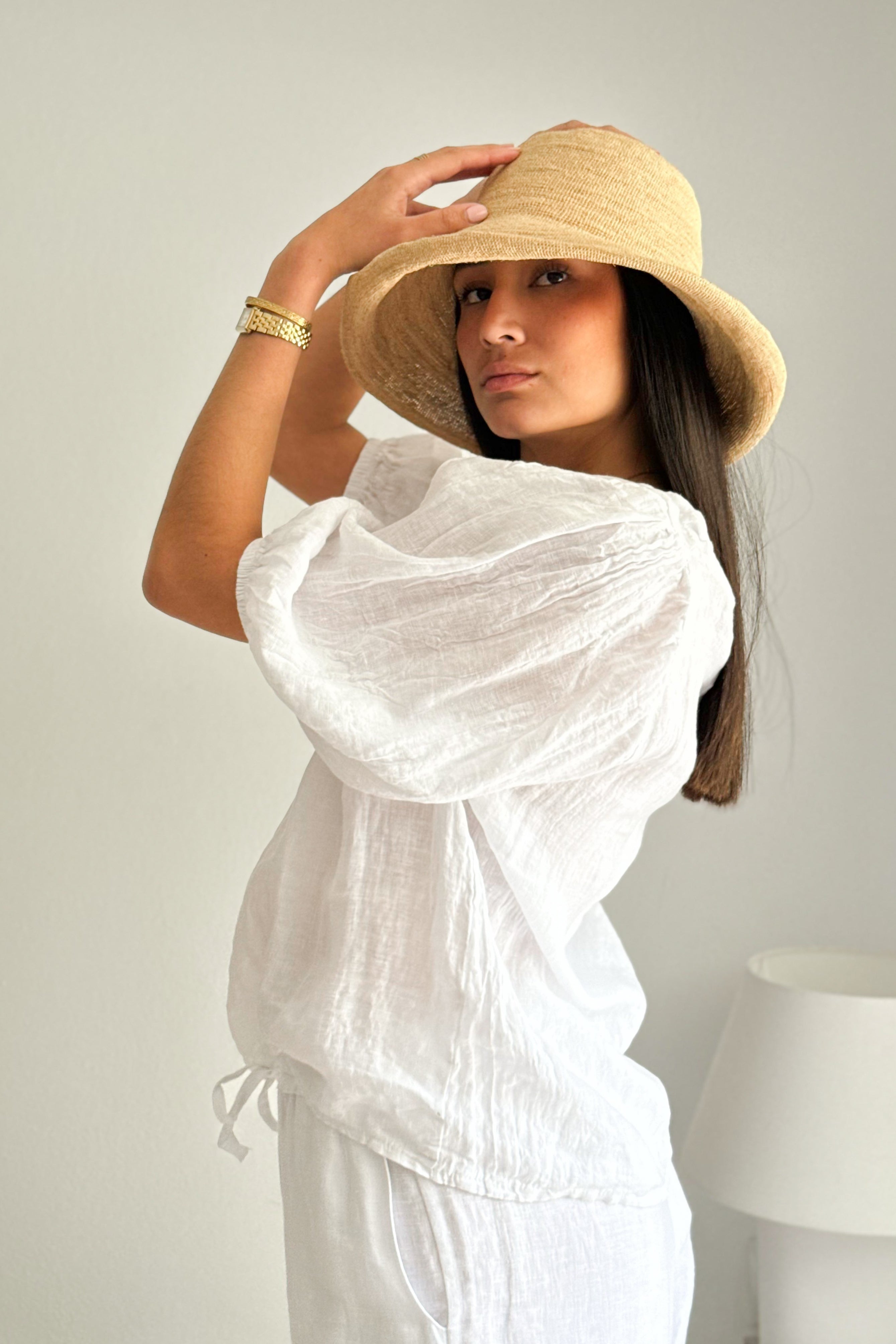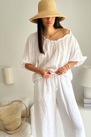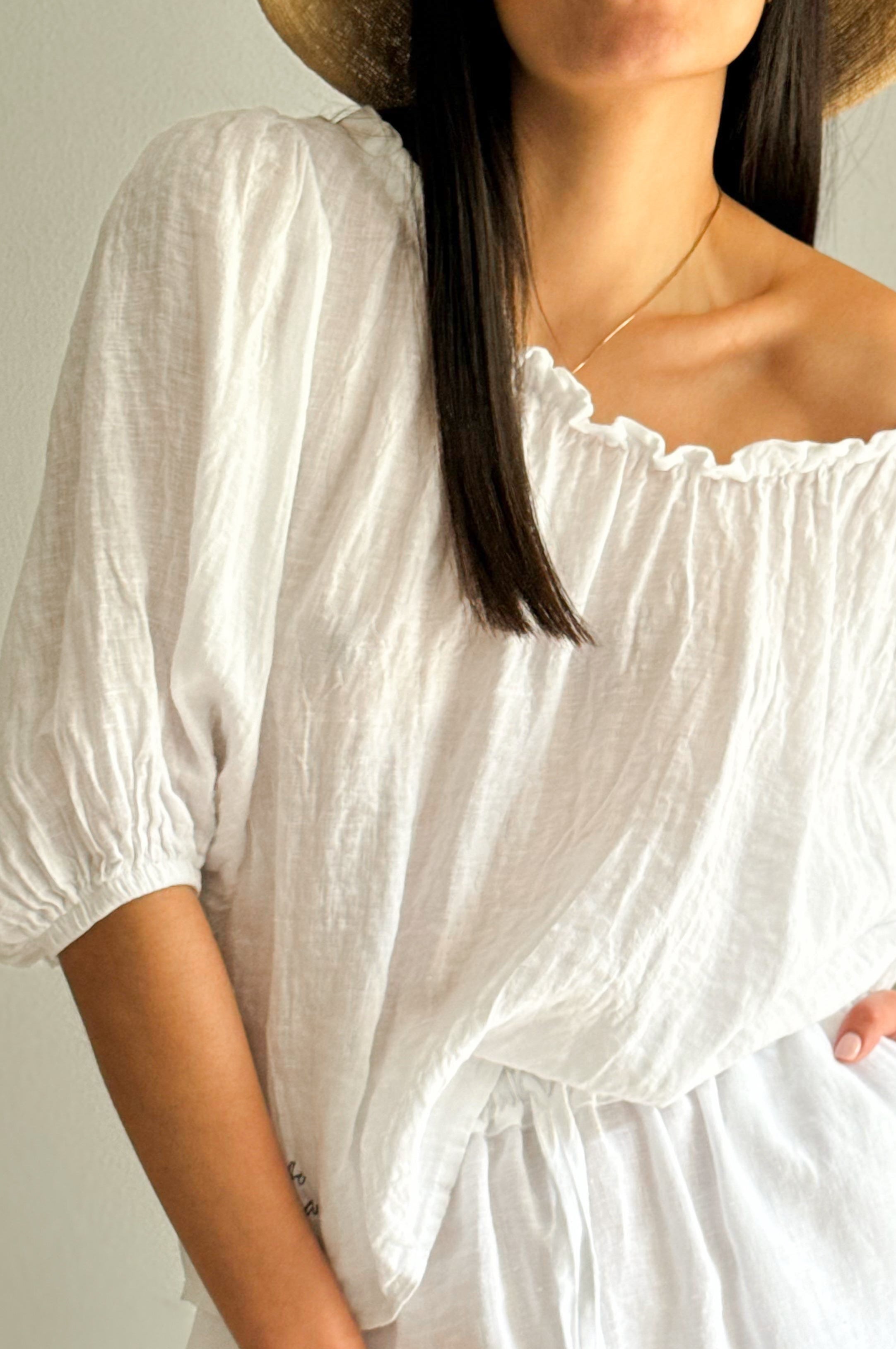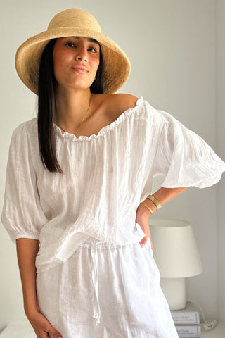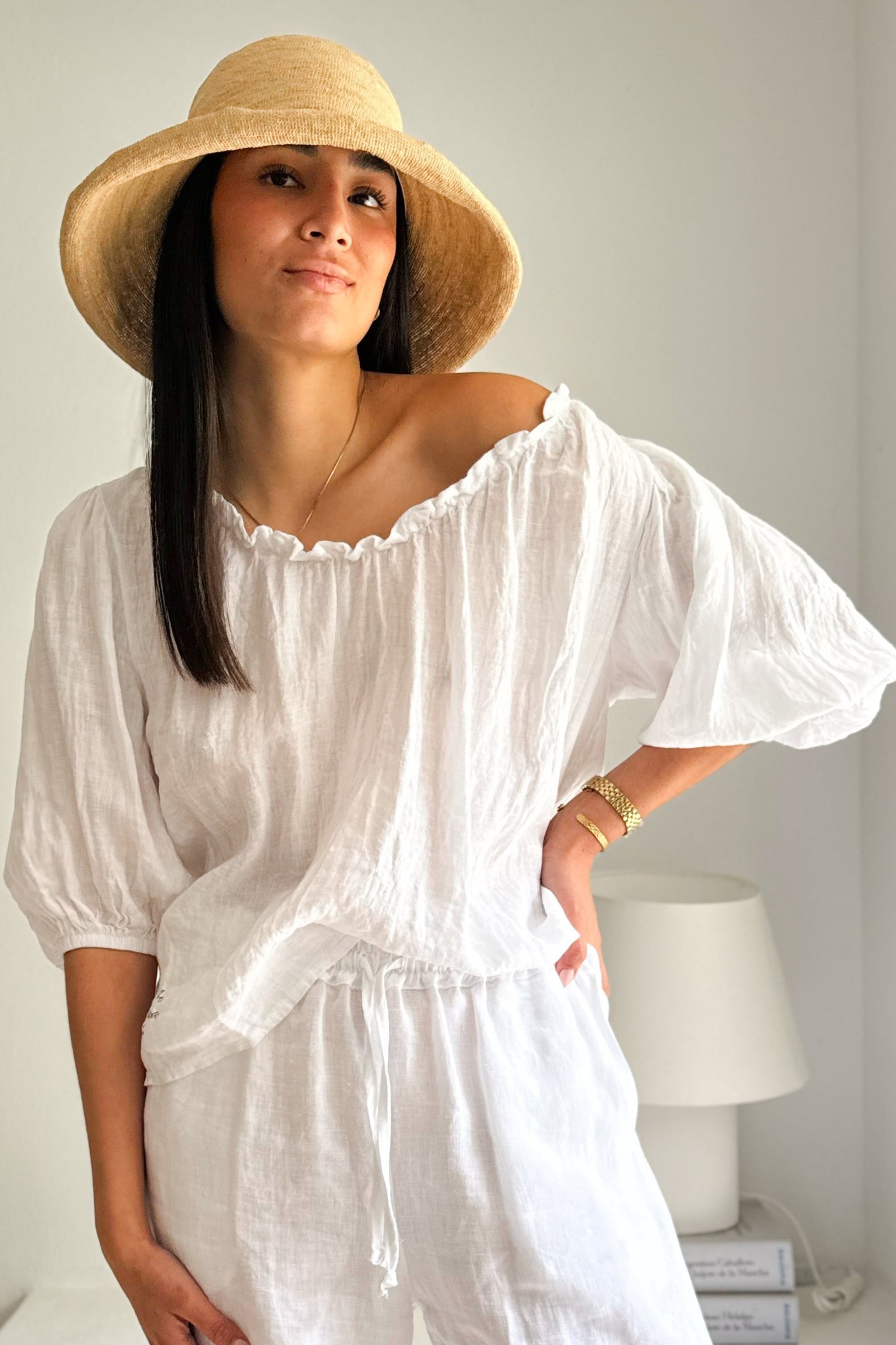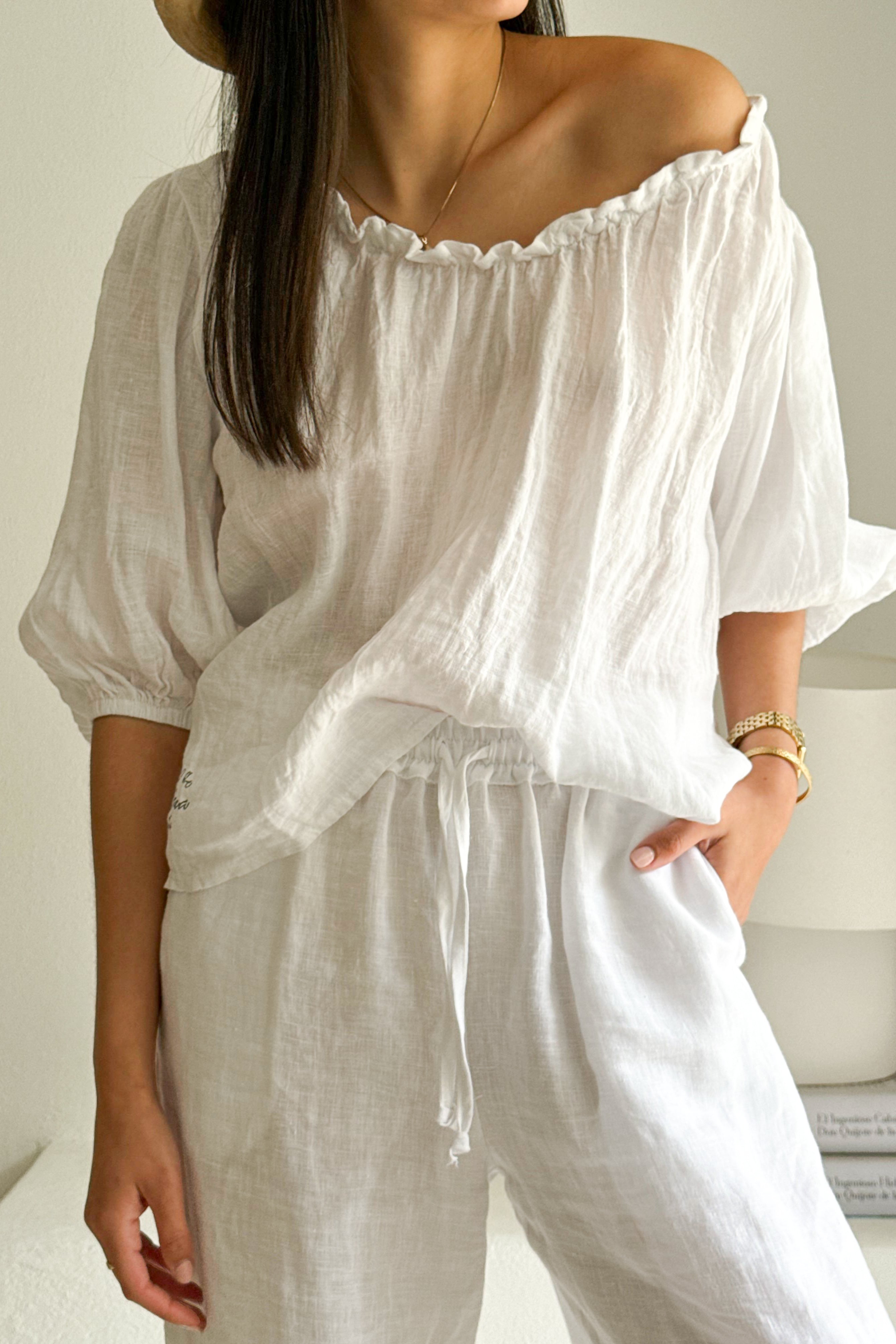 Naisellinen pellavapusero avaralla off shoulder -pääntiellä ja puolipitkillä hihoilla. Tämä paita yhdistää rennon tyylikkyyden ja ajattoman kauneuden ja on vaatekaapin monikäyttöinen suosikki. Pehmeä ja hengittävä kangas laskeutuu kauniisti, tarjoten kevyen ja ilmavan tunteen. Paidassa on avara off shoulder- pääntie ja kepeä röyhelökaulus ja runsaat puhvihihat tuovat asuun ripauksen romantiikkaa.