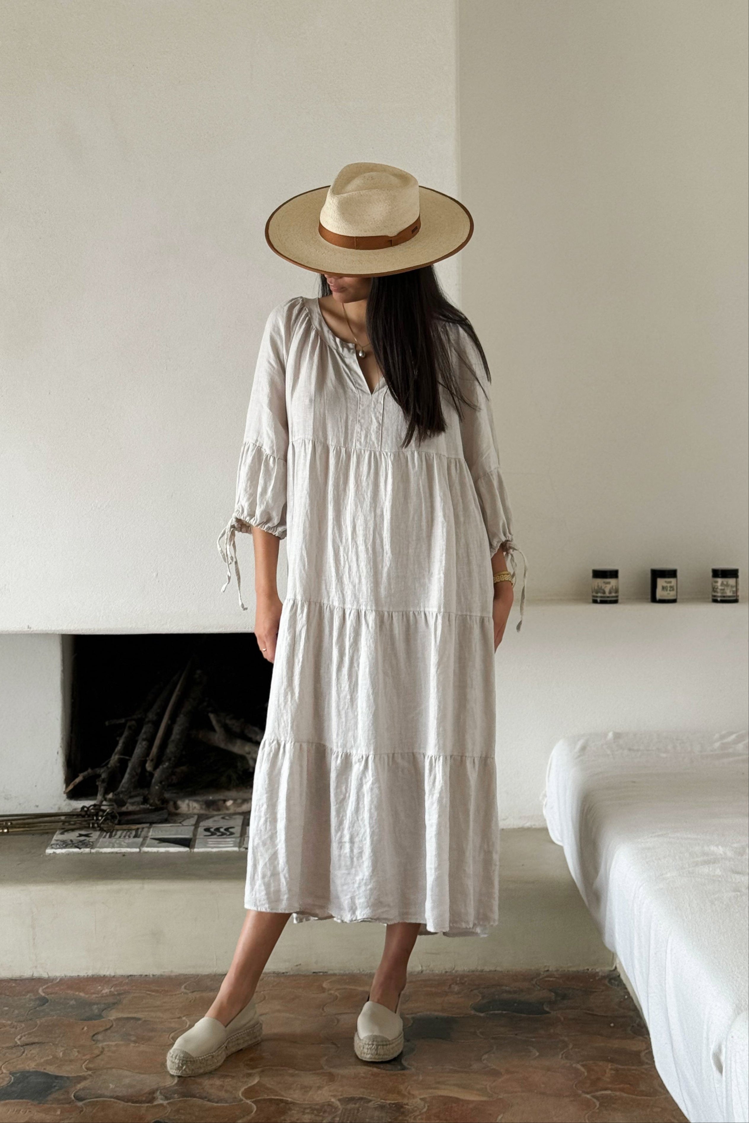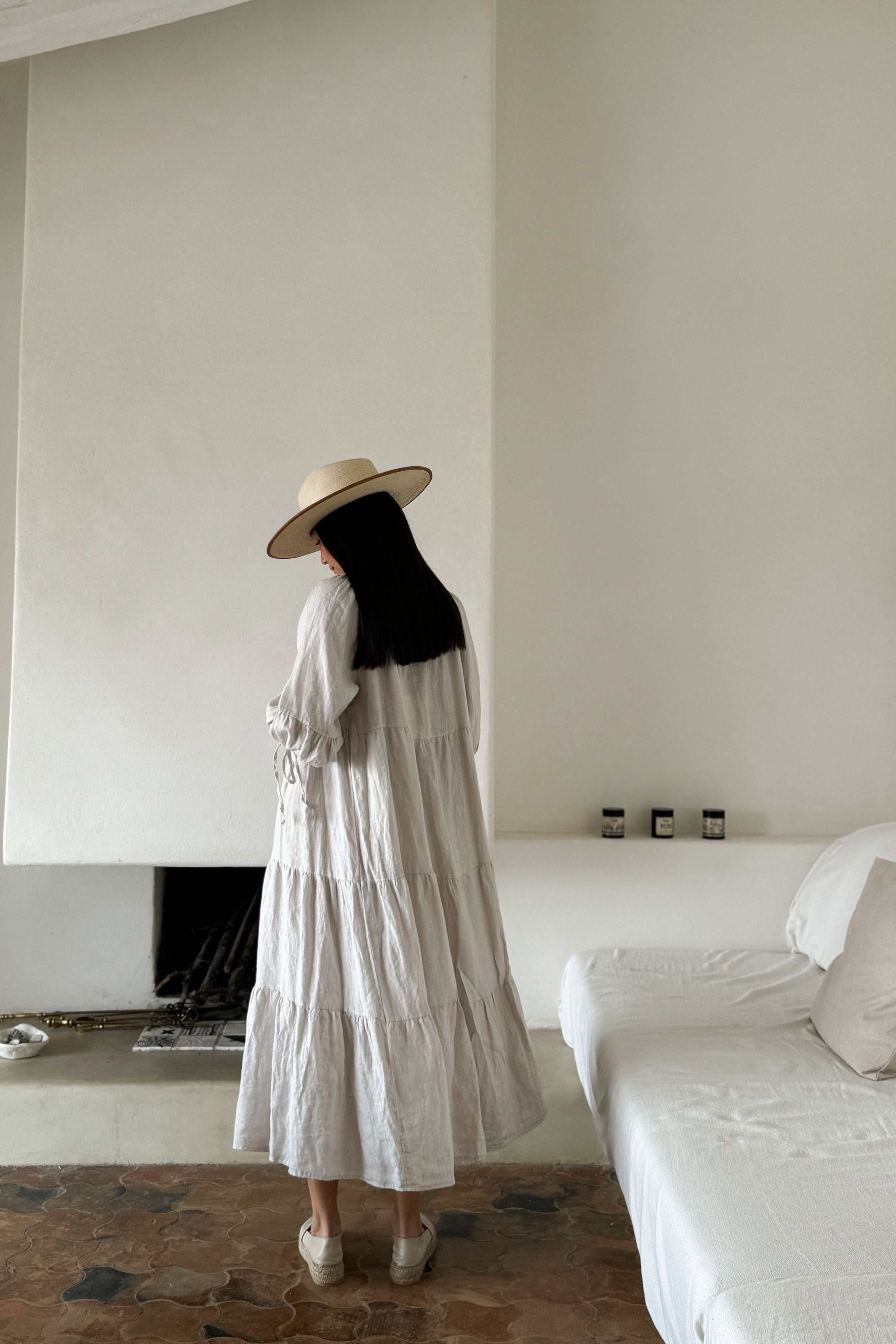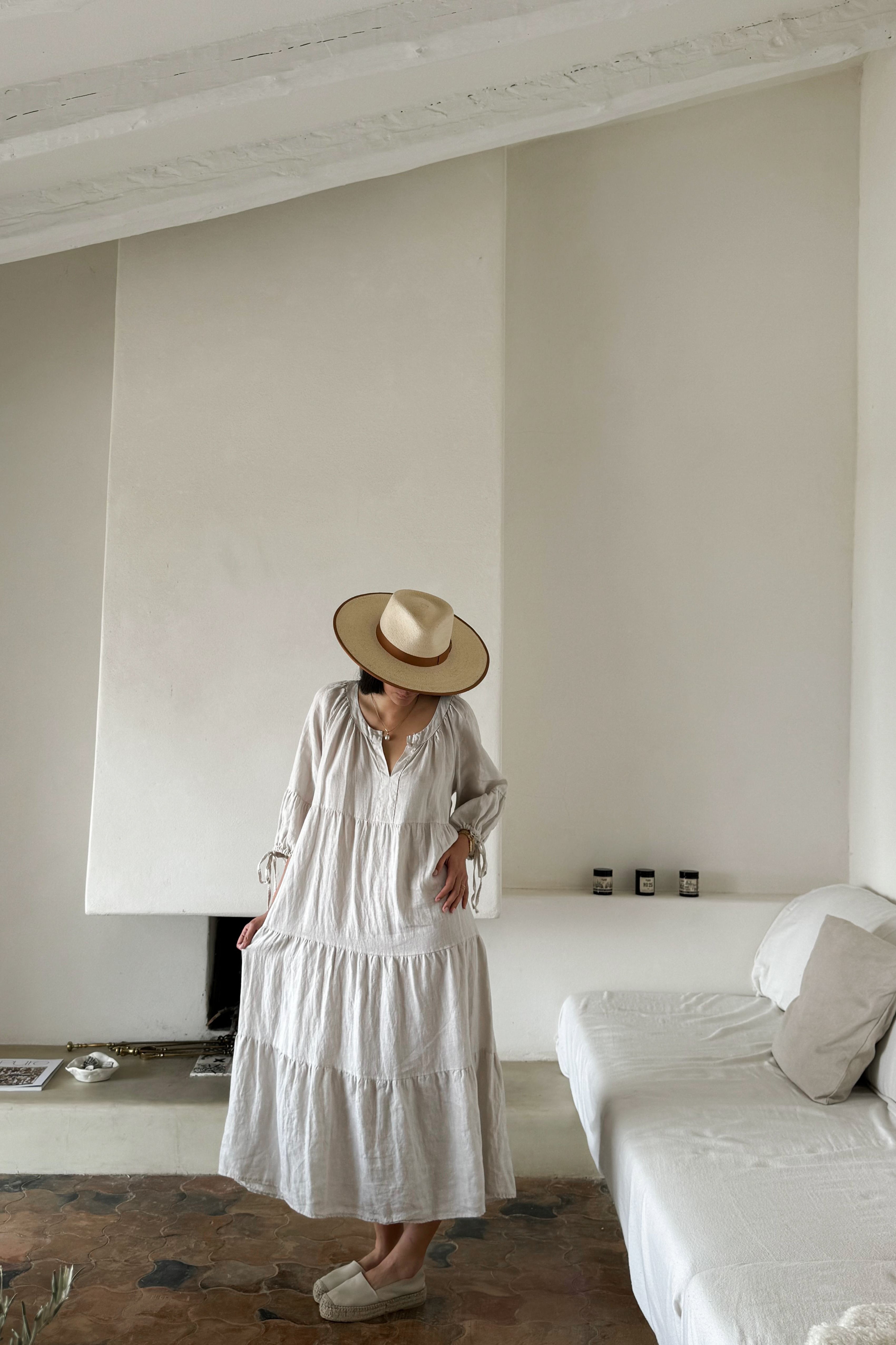 Hurmaava pellavamekko, jossa frillat kolmessa tasossa. Pyöreä pääntie, jossa imarteleva V-halkio. Hihansuissa rypytys ja solmittavat nauhat.