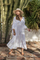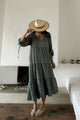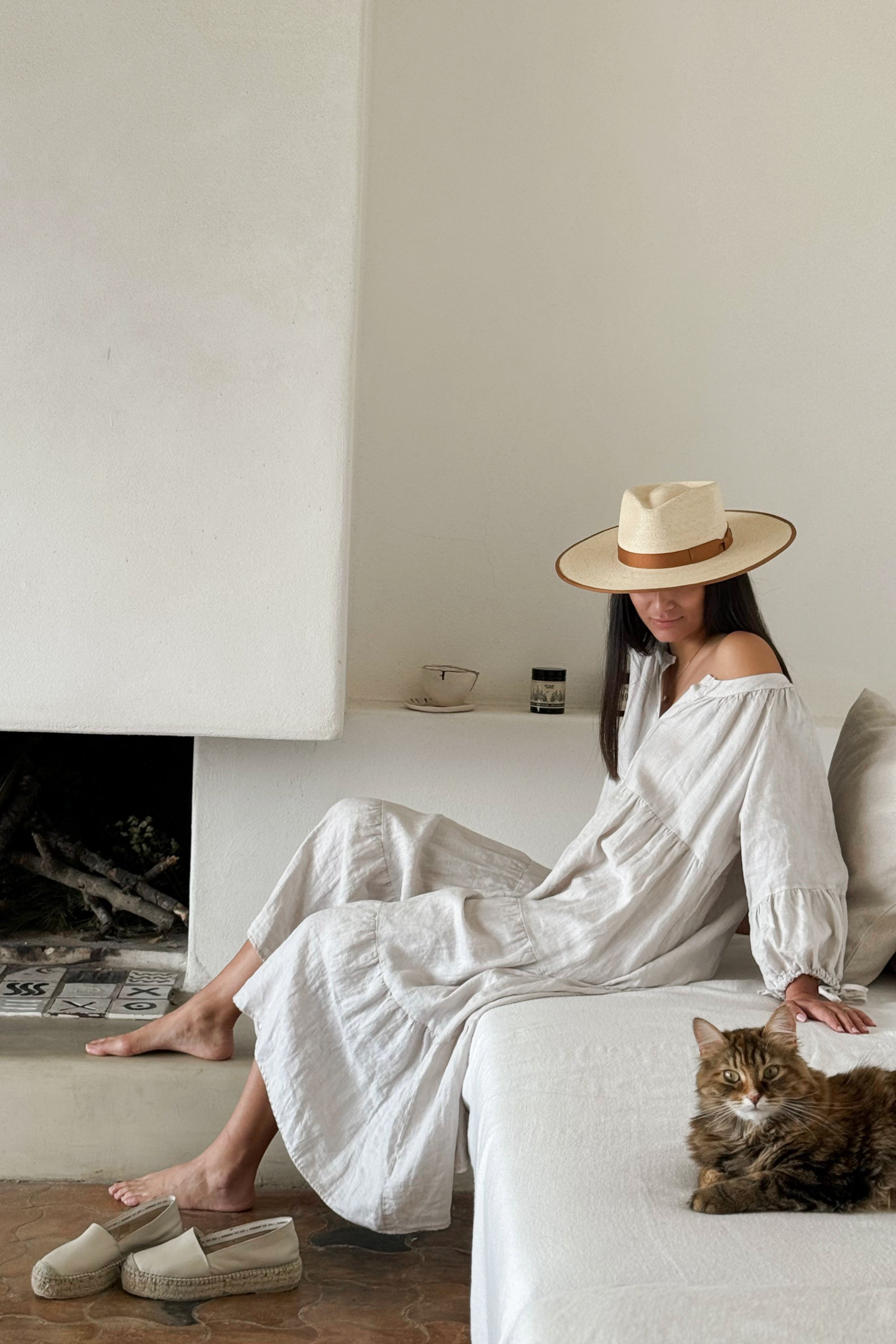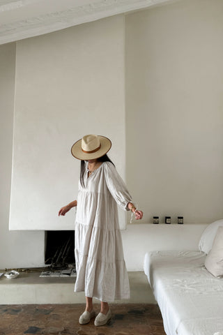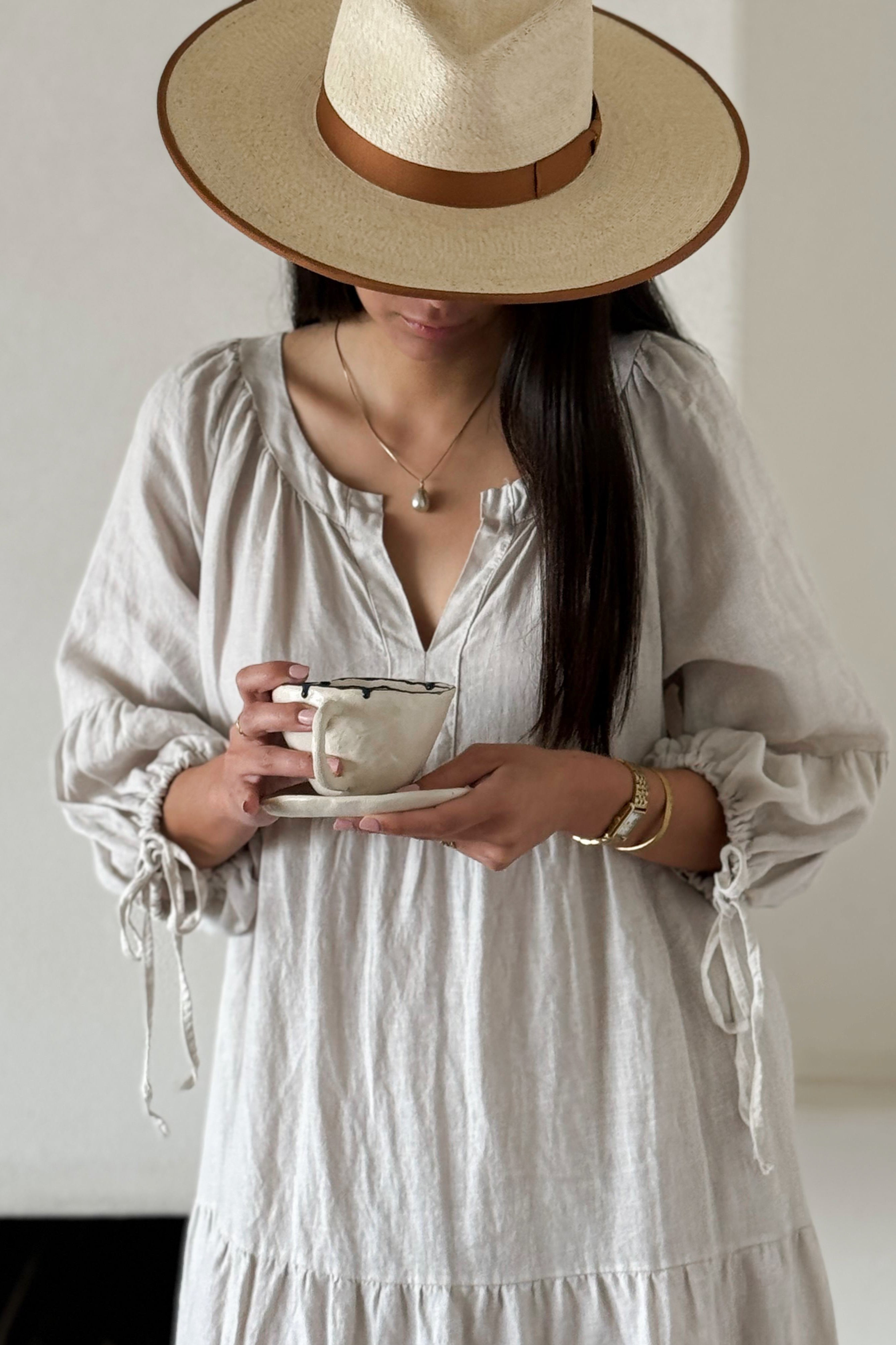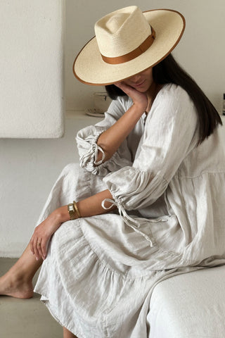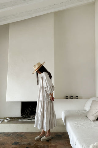Hurmaava pellavamekko, jossa frillat kolmessa tasossa. Pyöreä pääntie, jossa imarteleva V-halkio. Hihansuissa rypytys ja solmittavat nauhat.