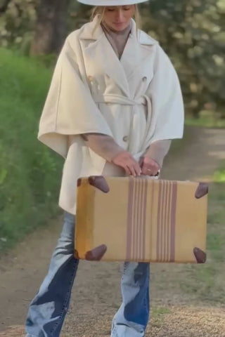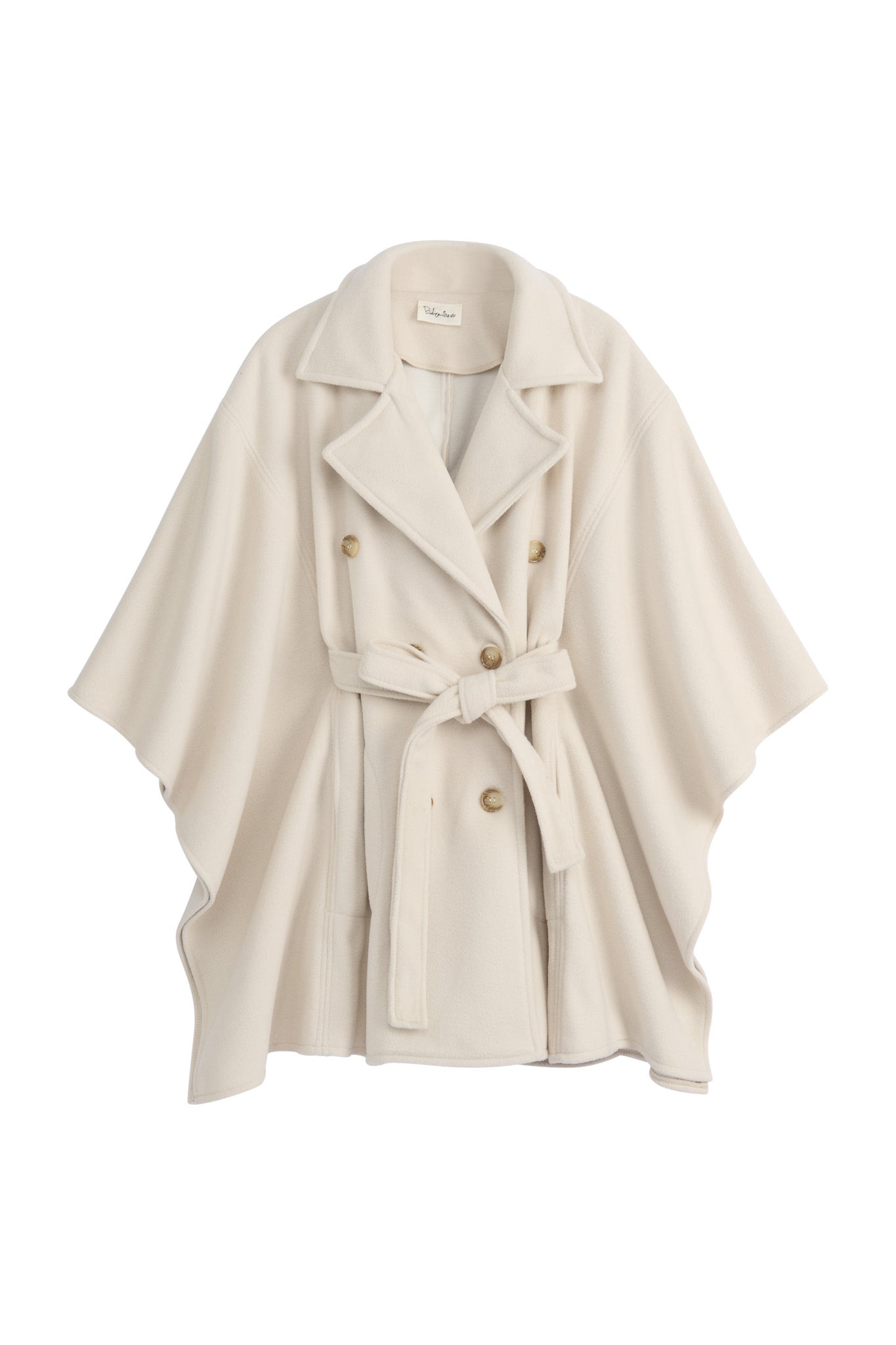 Ponchomainen takki, jossa nappikiinnitys ja takkiin kuuluva vyö. Edessä on avonaiset sivutaskut.