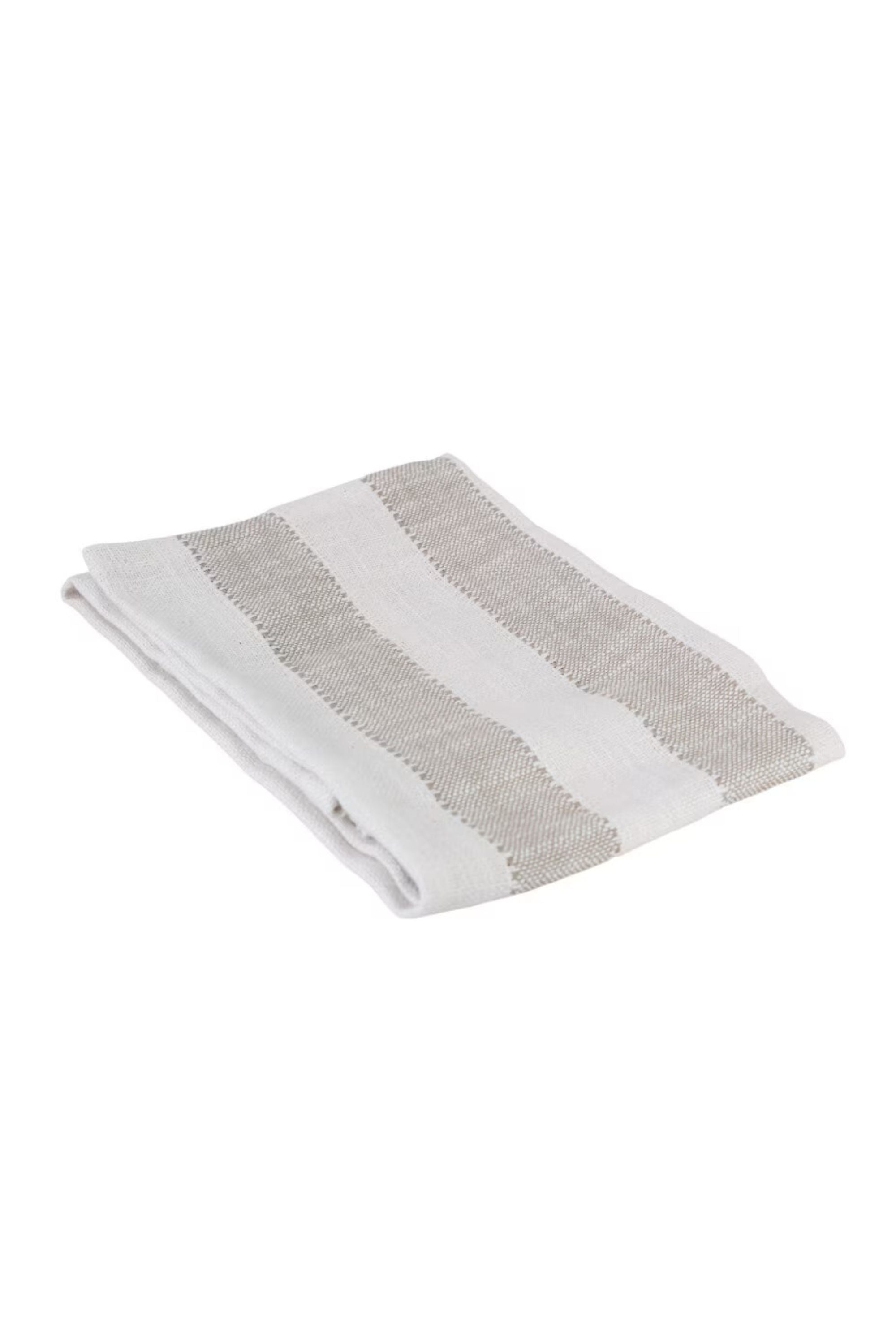 Ihastuttava ekologisesta puuvillasta valmistettu keittiöpyyhe klassisella leveäraitaisella kuviolla. Yhdessä kulmassa nauha ripustusta varten.