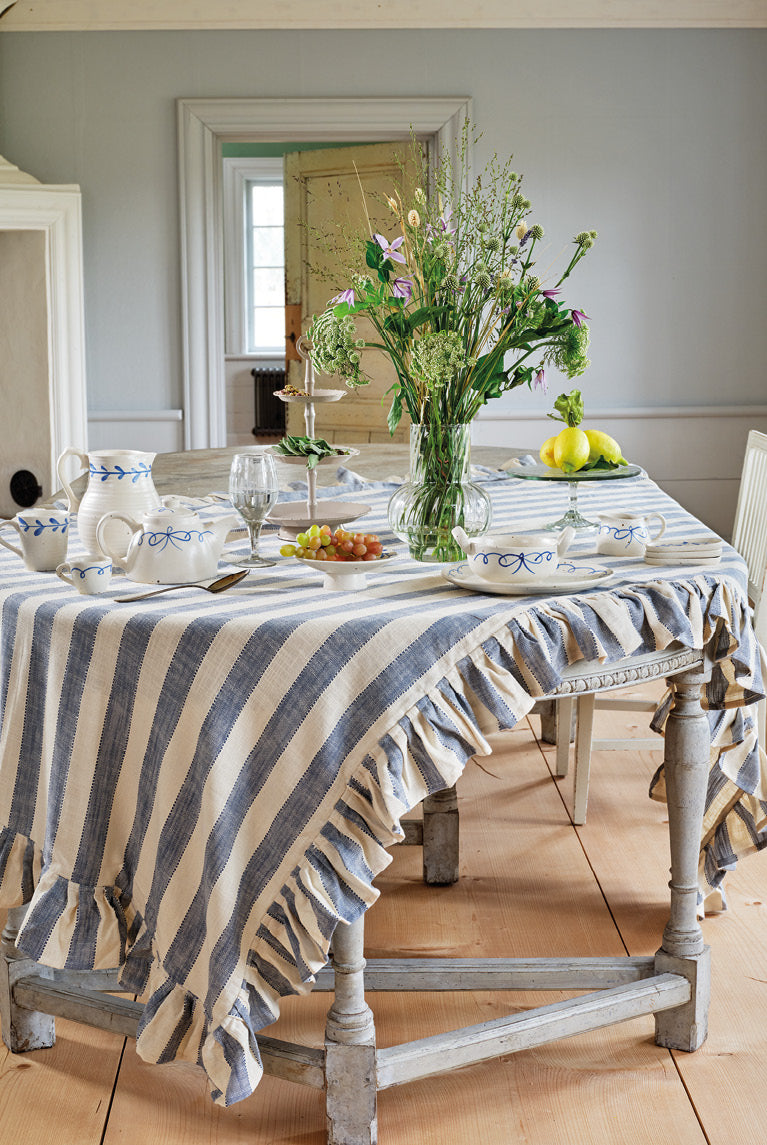 Ihanasta ekologisesta puuvillasta valmistettu pöytäliina klassisella ruudullisella kuviolla. Pöytäliinan reunoja somistaa kaunis frilla.
