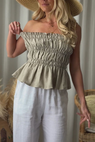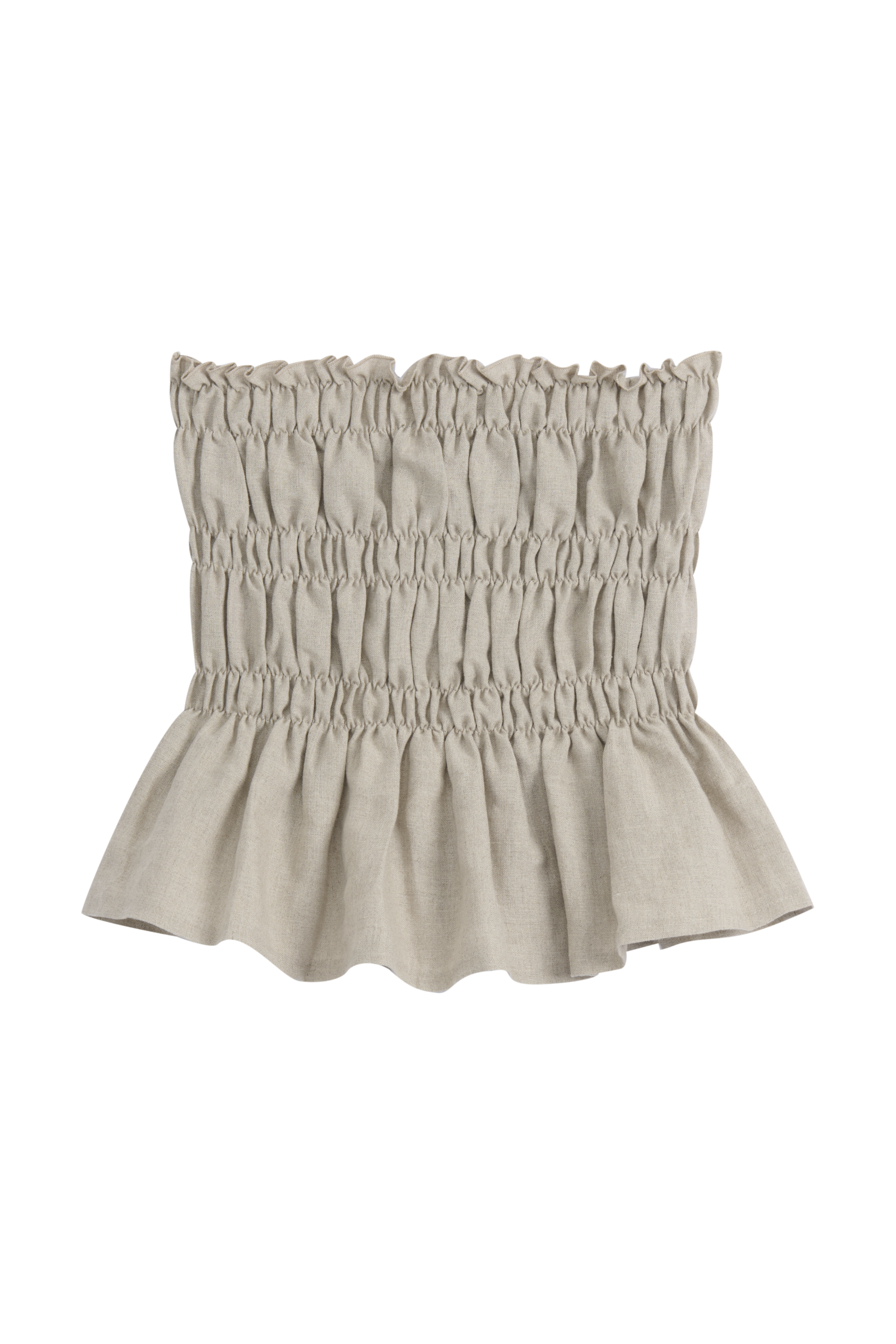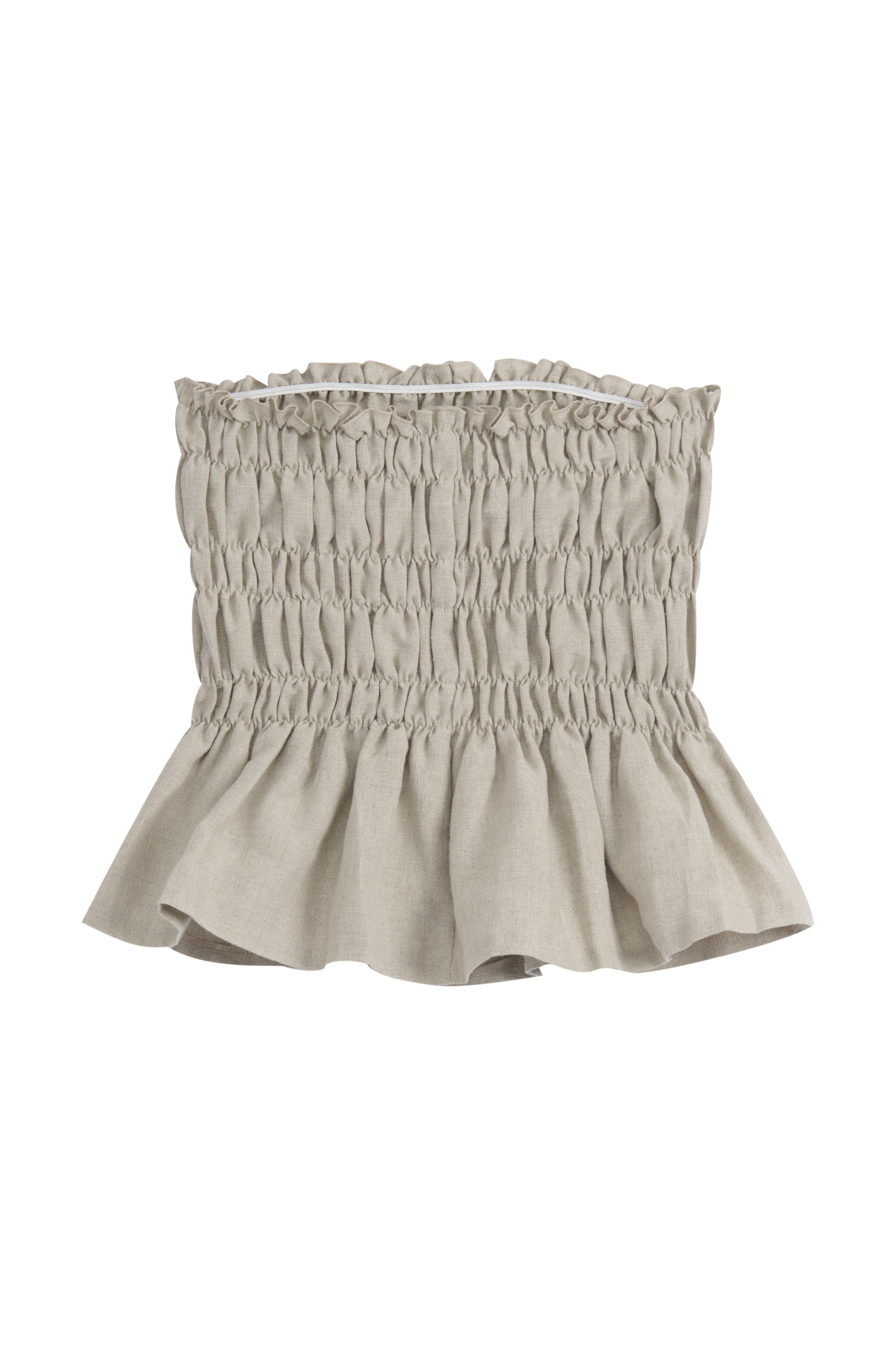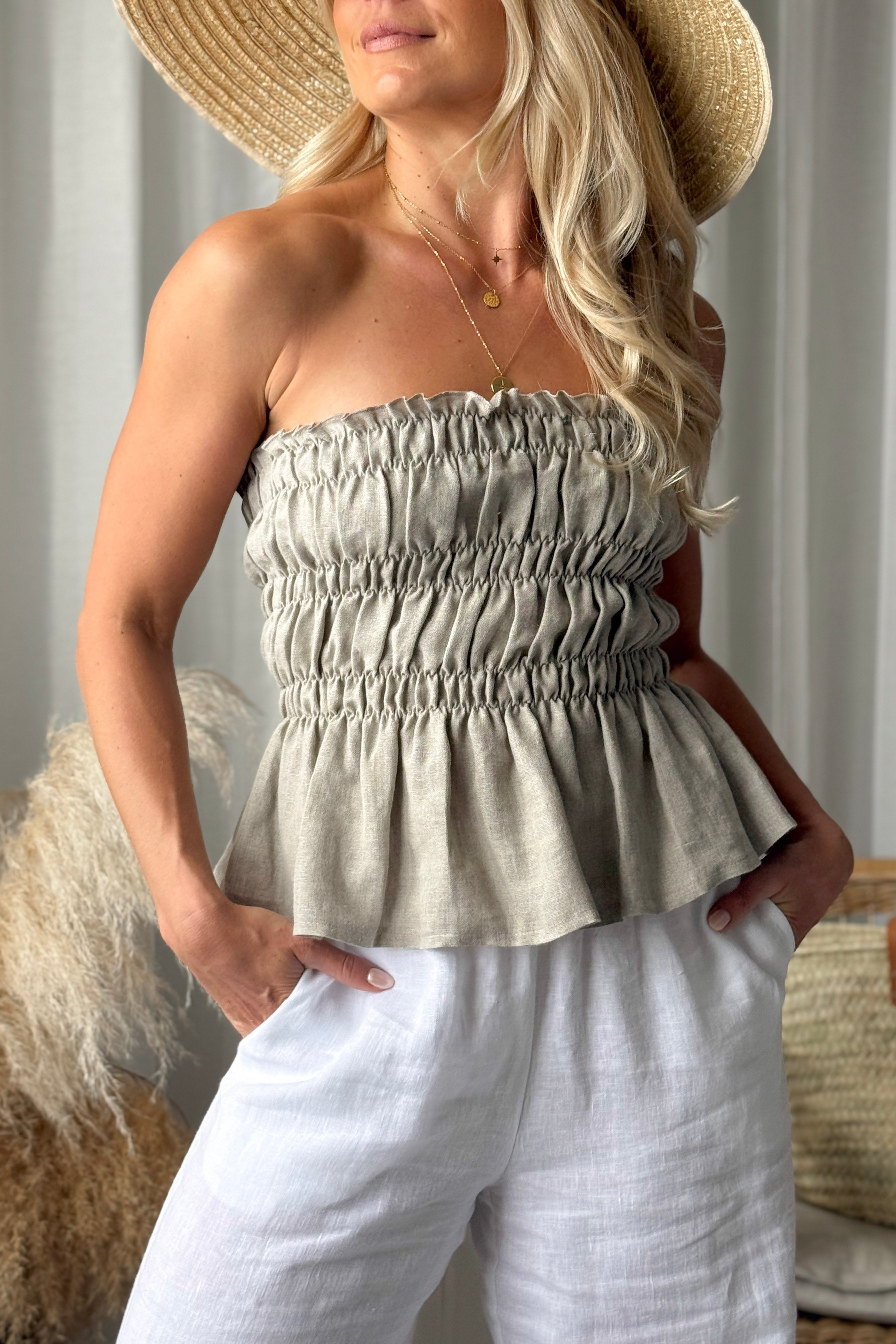 Kevyt ja ilmava bandeau-mallinen toppi, joka tuntuu miellyttävältä päällä ja laskeutuu kauniisti vartalon myötäisesti. Joustava smokkirypytys tuo toppiin istuvuutta ja mukavuutta, samalla kun hienosti aaltoileva helma antaa sille pehmeän ja huolettoman ilmeen. Rennon tyylinsä ansiosta toppi on helppo yhdistää monenlaisiin kesäasuihin, ja se sopii täydellisesti lämpimiin päiviin.