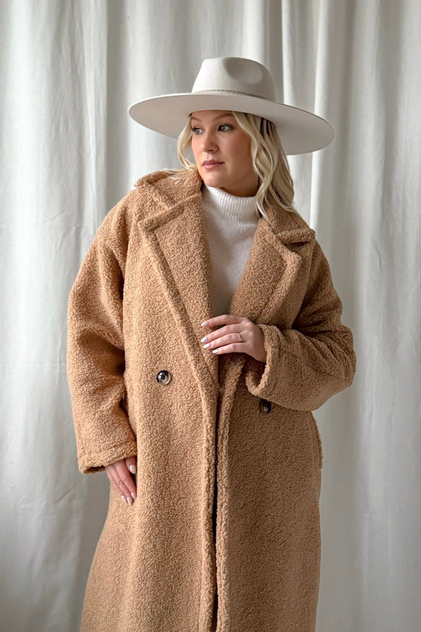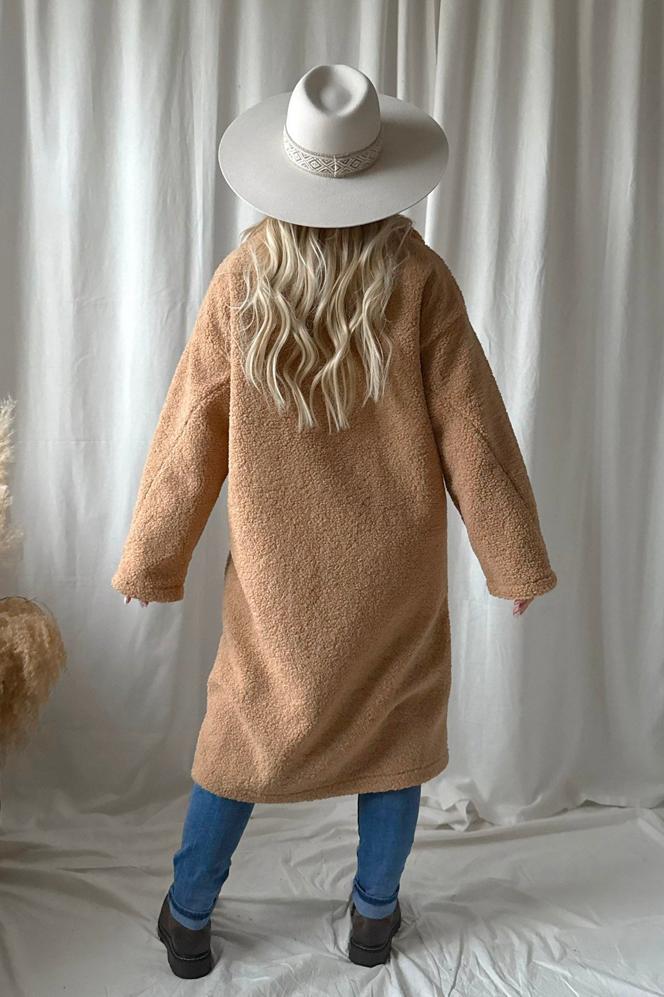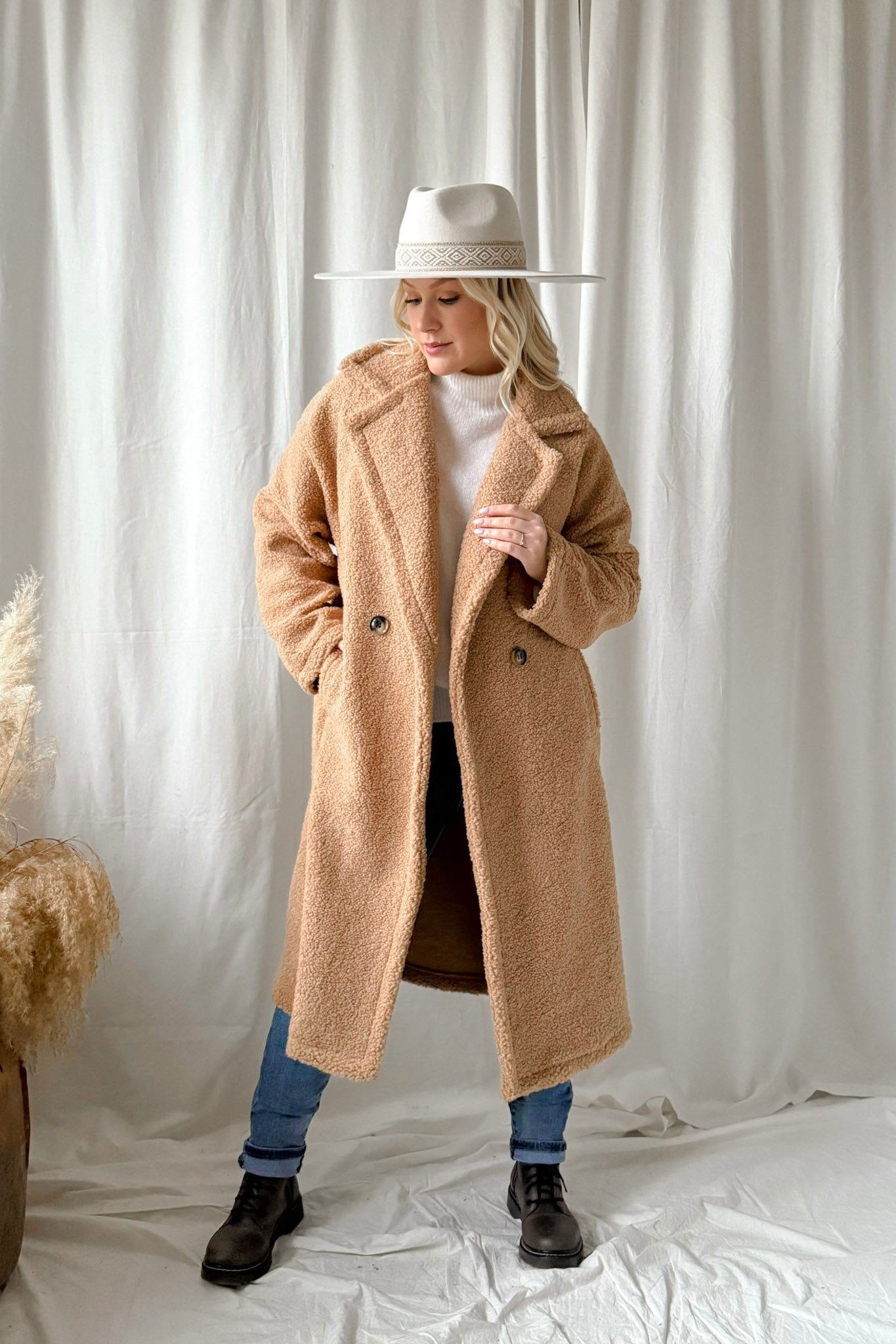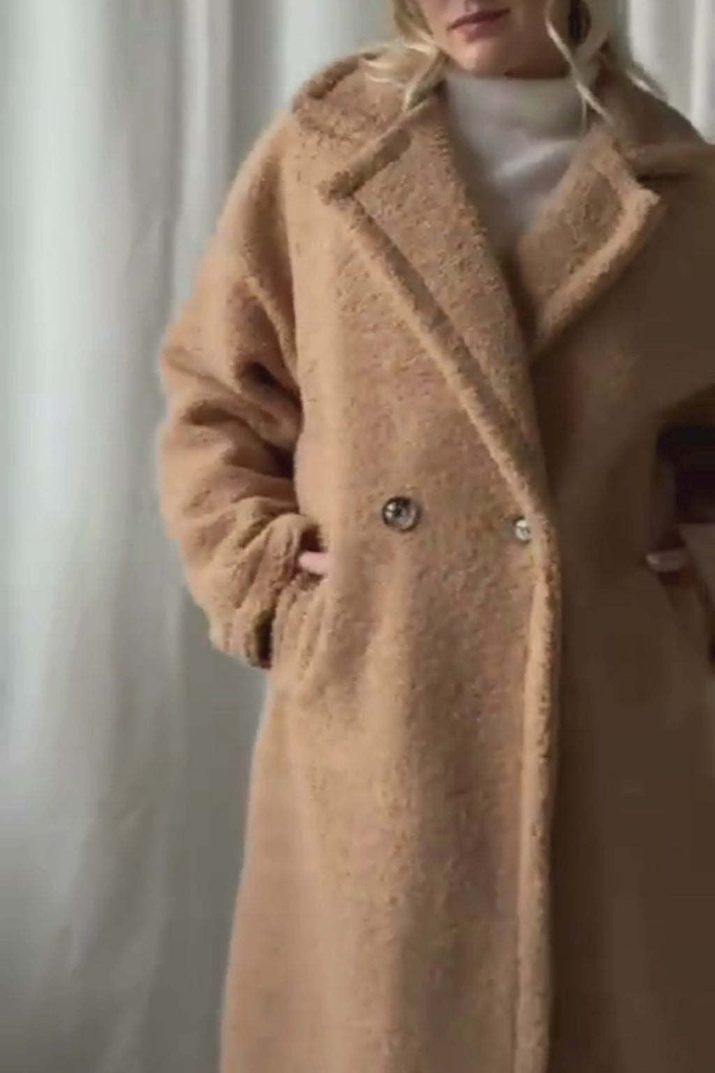 Pitkä, pehmeä ja muhkea Teddy takki lämmittää ja näyttää tyylikkäältä. Takissa on taskut ja klassinen kääntökaulus. Takissa on kaksi nappia rivissä, joista yksi on kiinnitystä varten ja toinen on koriste. Takki kapenee aavistuksen alaspäin. Takissa ei ole sisävuorta.