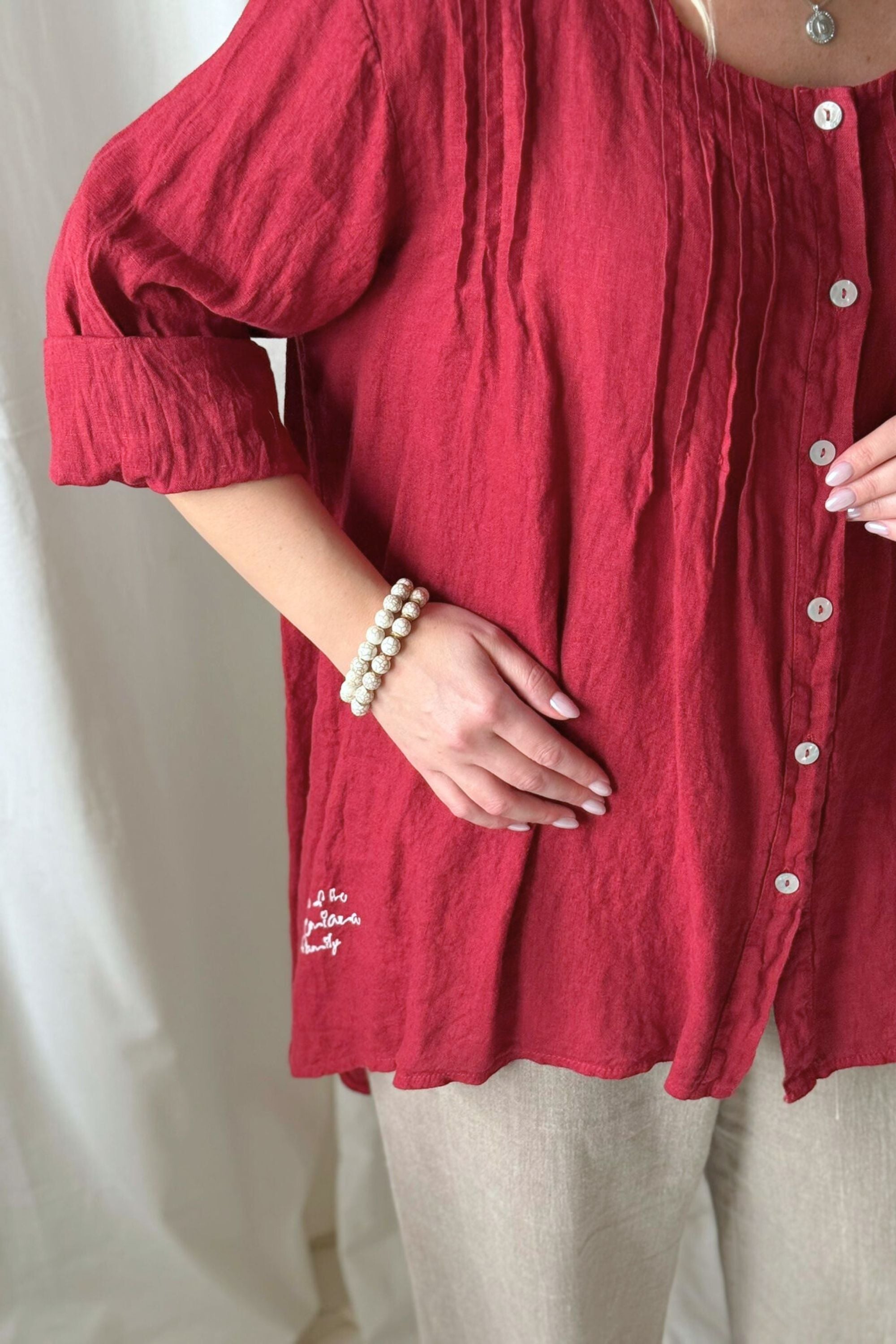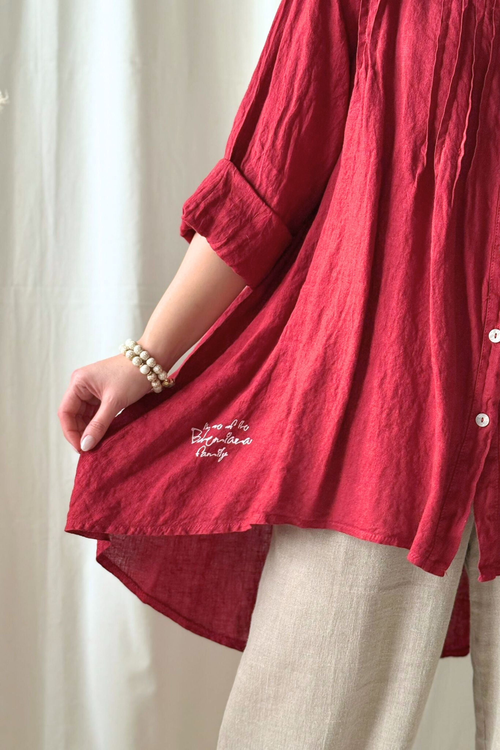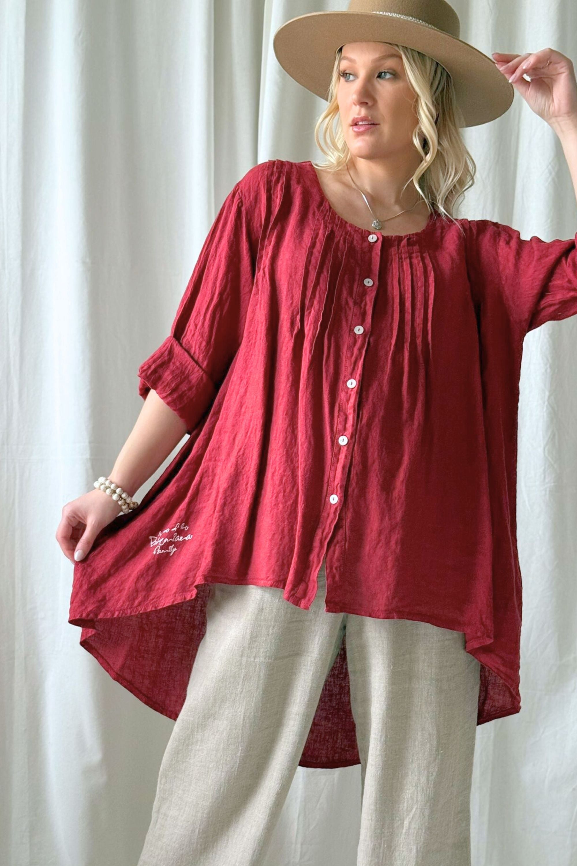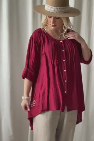 Leikkisä tunika pyöreällä pääntiellä ja ihanilla pystylaskoksilla tunikan yläosassa. Tunikassa on helmiäisnapitus. Tunika on pidempi takaa.