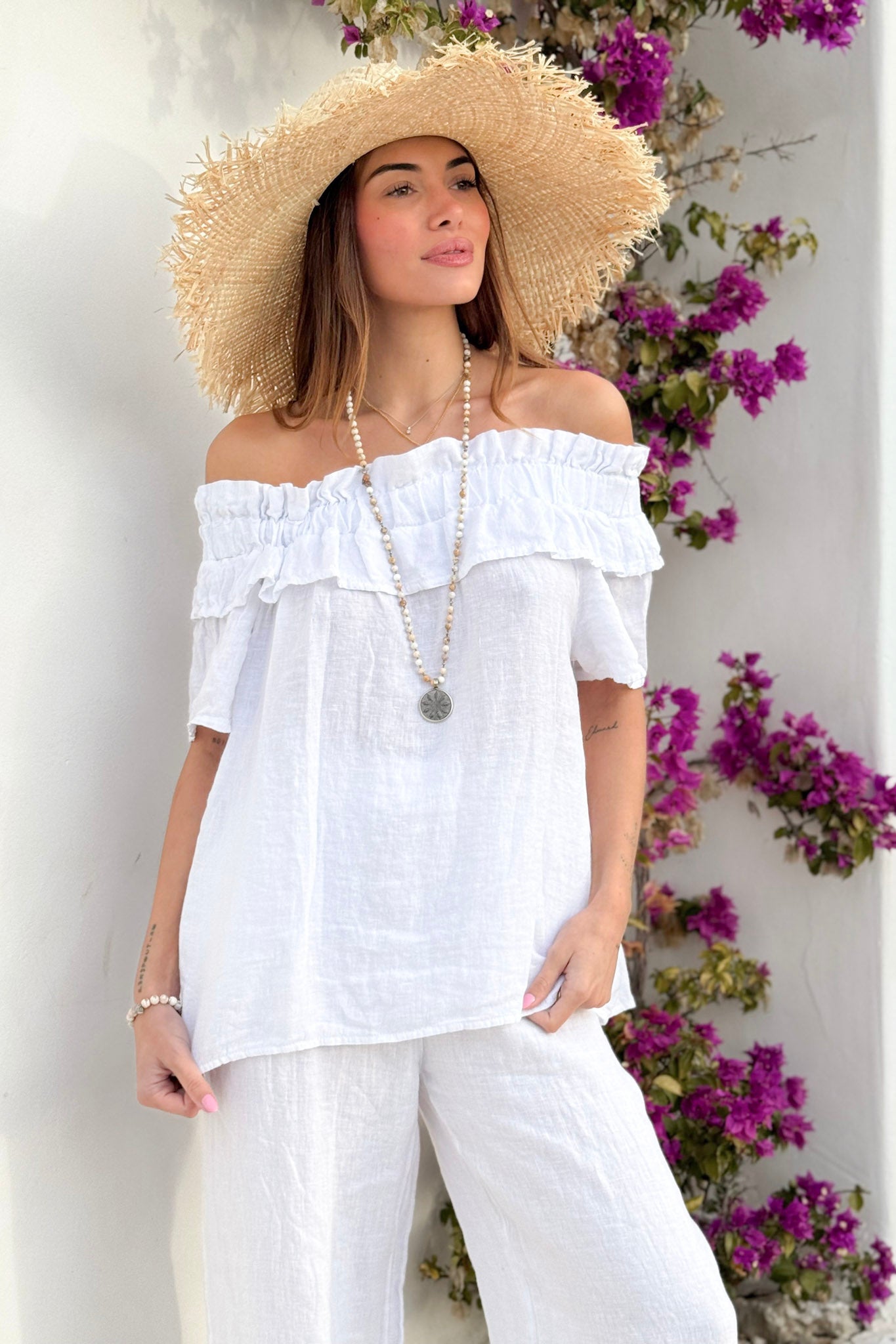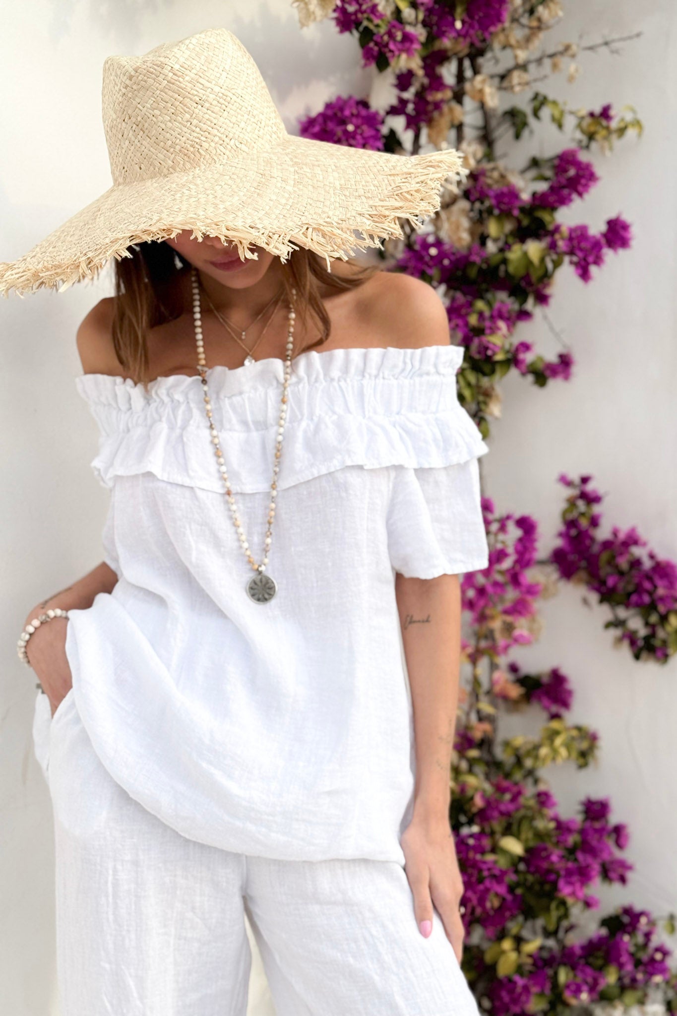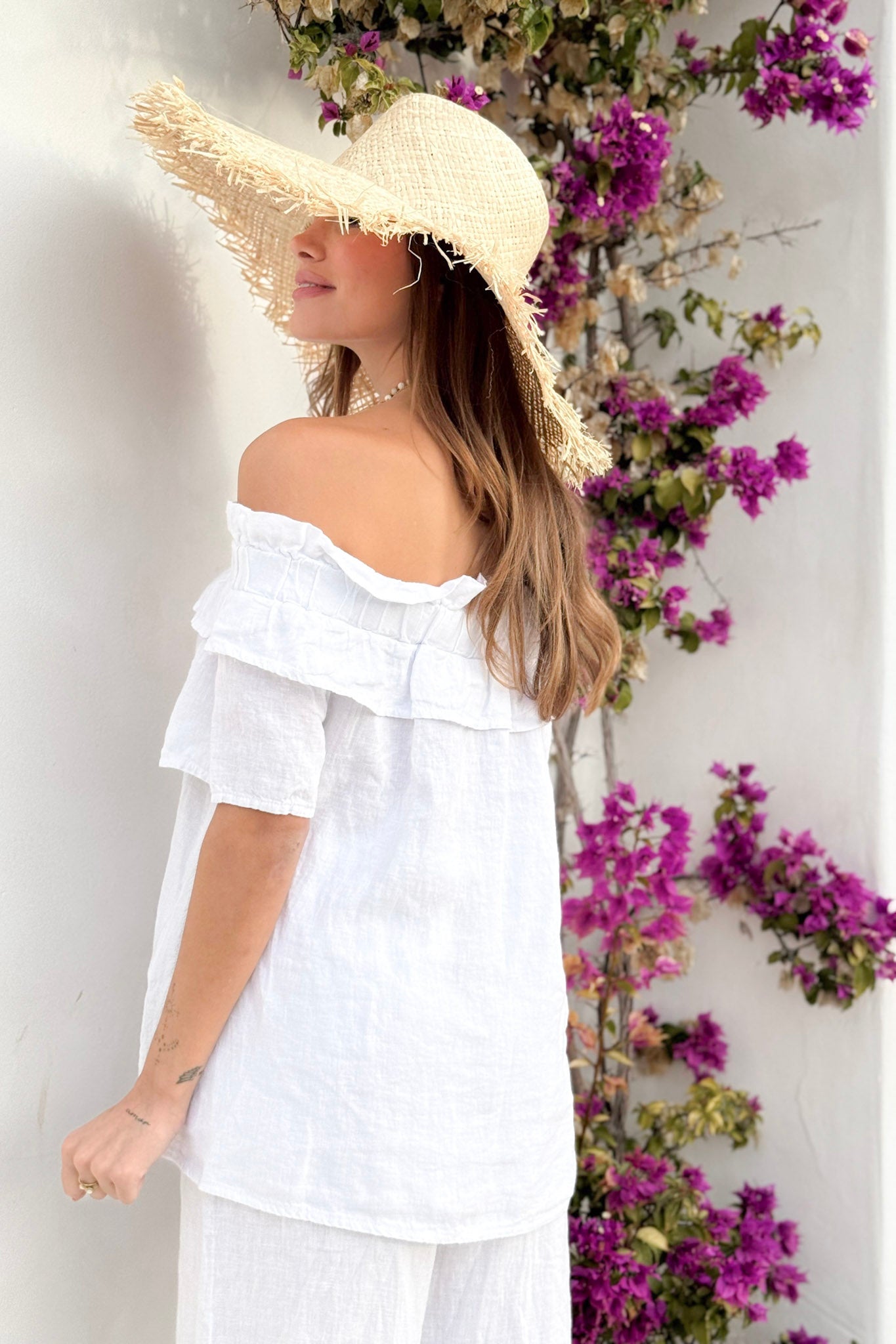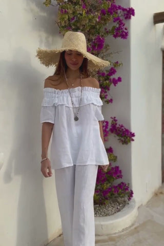 Näyttävä pellavapaita isolla röyhelökauluksella. Materiaali tuntuu miellyttävän kevyeltä ja hengittävältä iholla. Pehmeä ja joustava kaulus laskeutuu kauniisti ja mahdollistaa monipuolisen käytön. Paitaa voi käyttää sekä hartioilla että trendikkäästi off-shoulder-tyylillä. Rennon mukava mutta samalla katseenvangitseva malli sopii niin arkeen kuin juhlavampiinkin hetkiin.