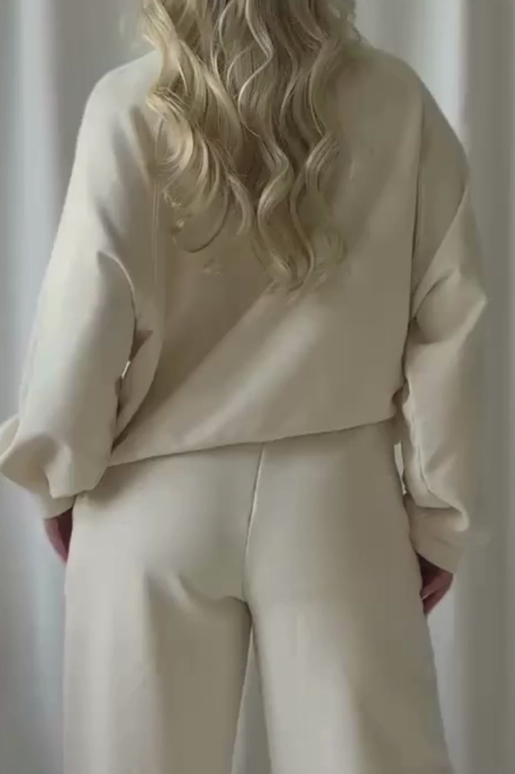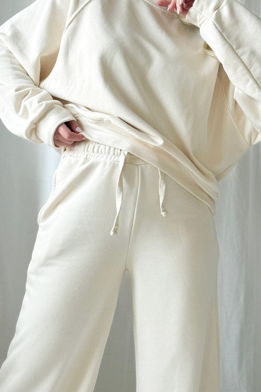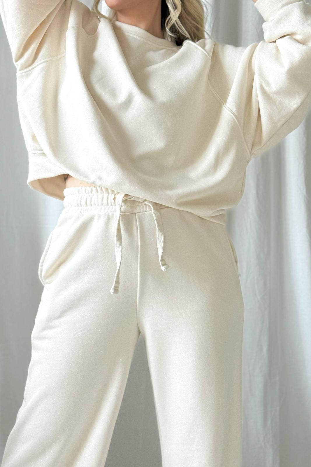 Unelmapehmeä loungewear-setti, jossa kimaltava efekti college-tyyppisessä, sileässä materiaalissa. Resorit hihoissa ja helmassa. Täydellisen rento, mutta näyttävä look!