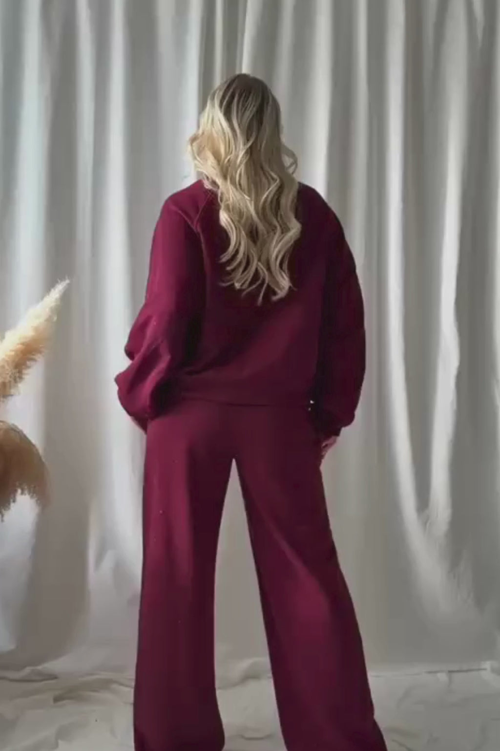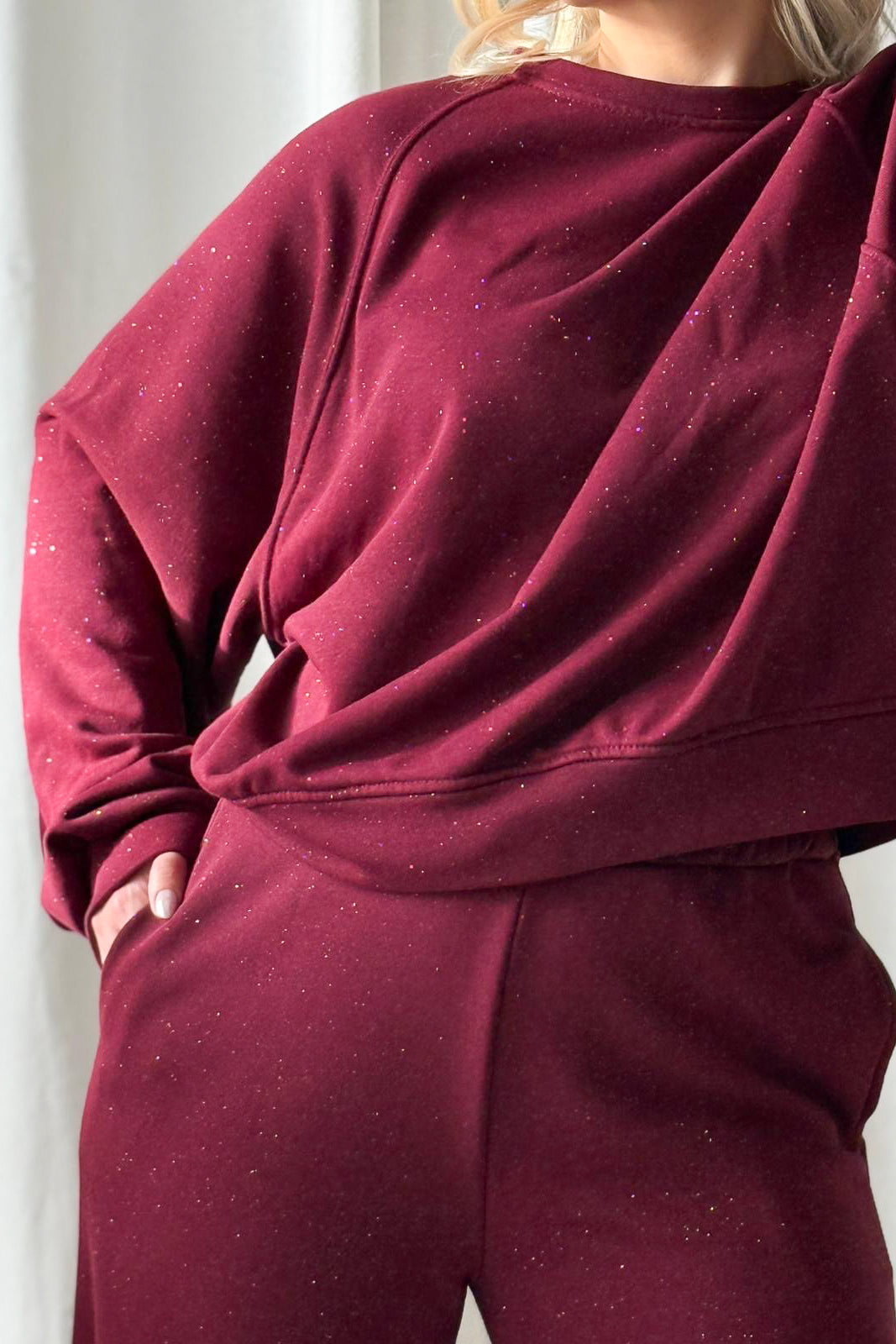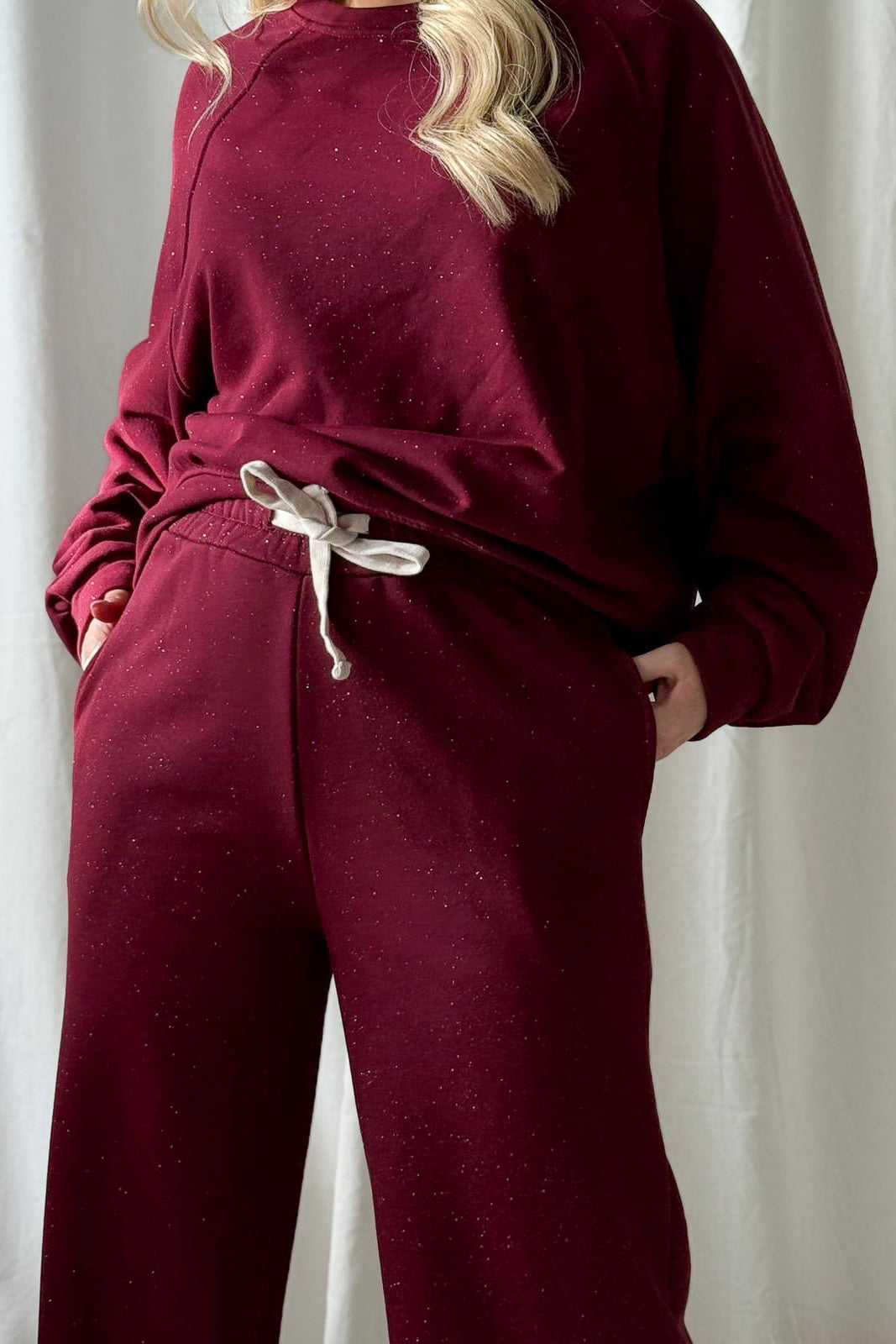 Unelmapehmeä loungewear-setti, jossa kimaltava efekti college-tyyppisessä, sileässä materiaalissa. Resorit hihoissa ja helmassa. Täydellisen rento, mutta näyttävä look!