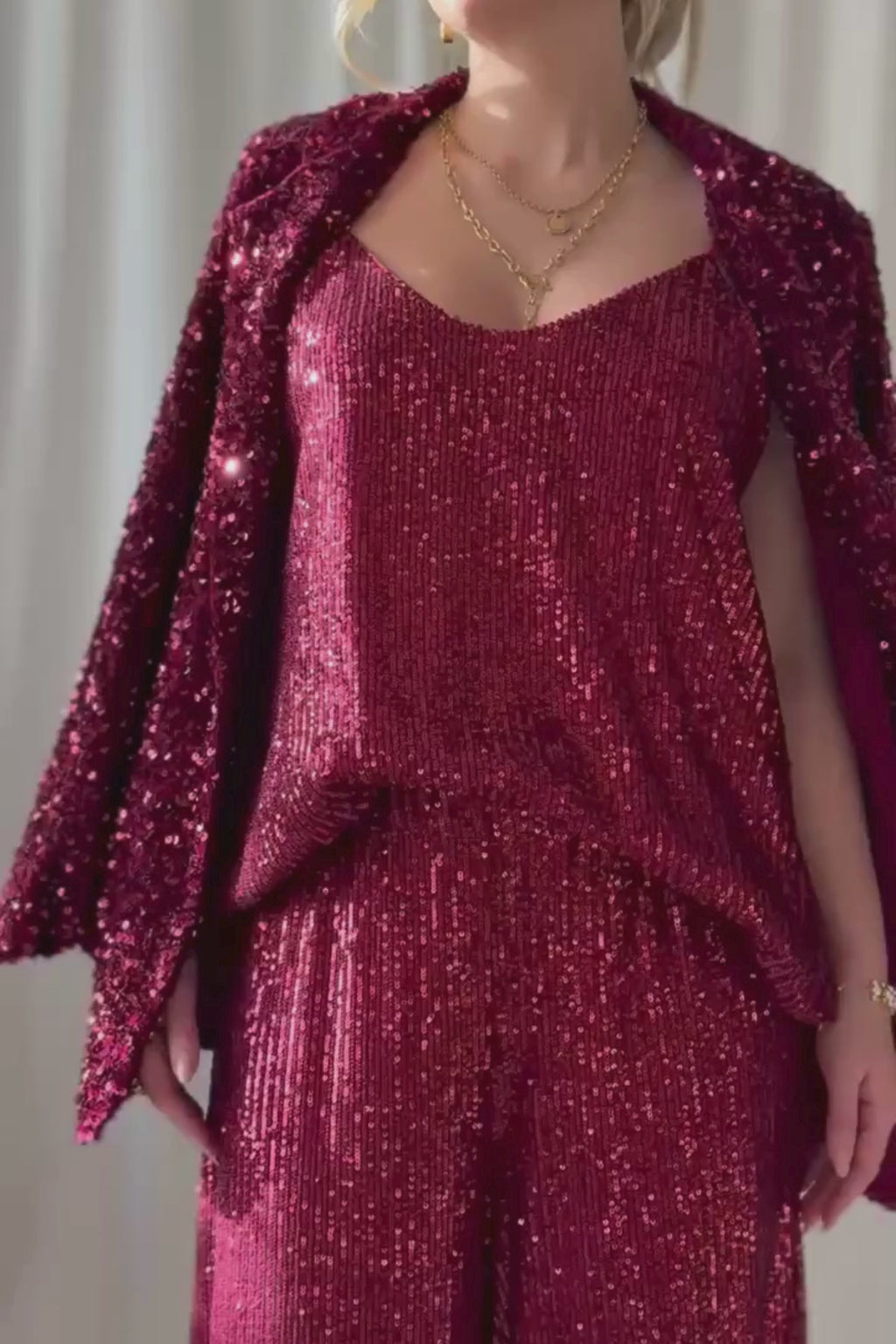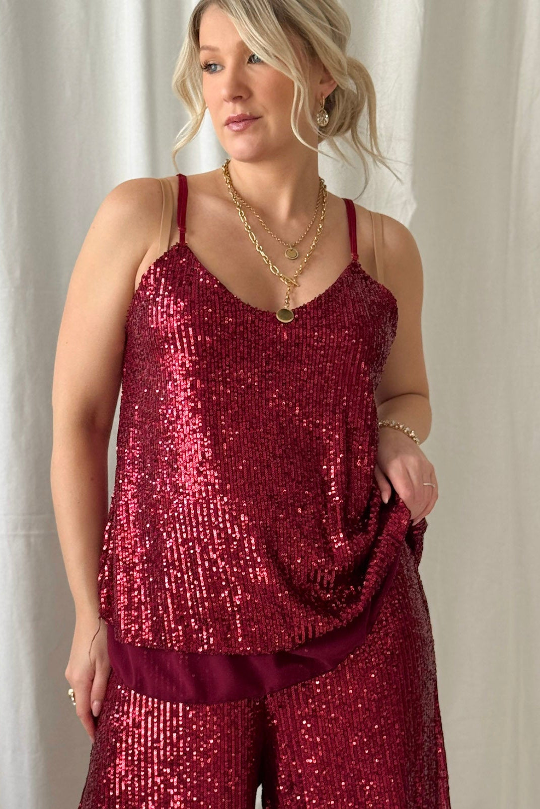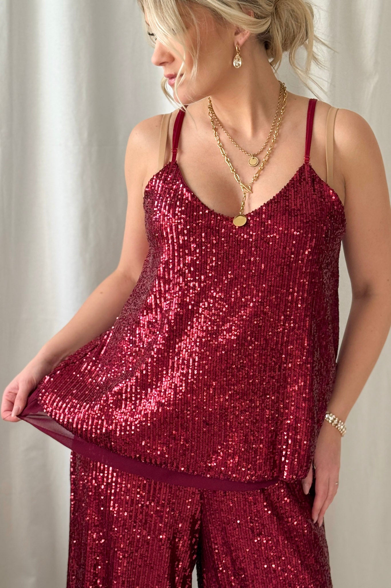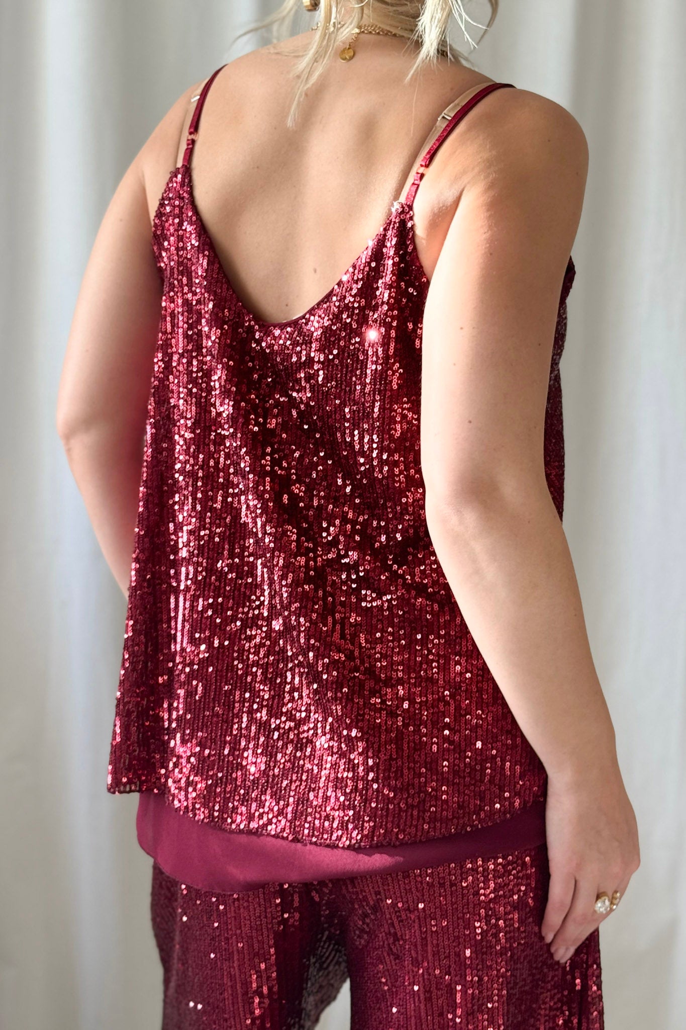 It's time to glow! Kaunis ja kimaltava paljettitoppi ohuilla säädettävillä olkaimilla. Sifonkinen aluskangas joka on hieman pidempi kuin paljettiosa. Kangas venyy hieman.