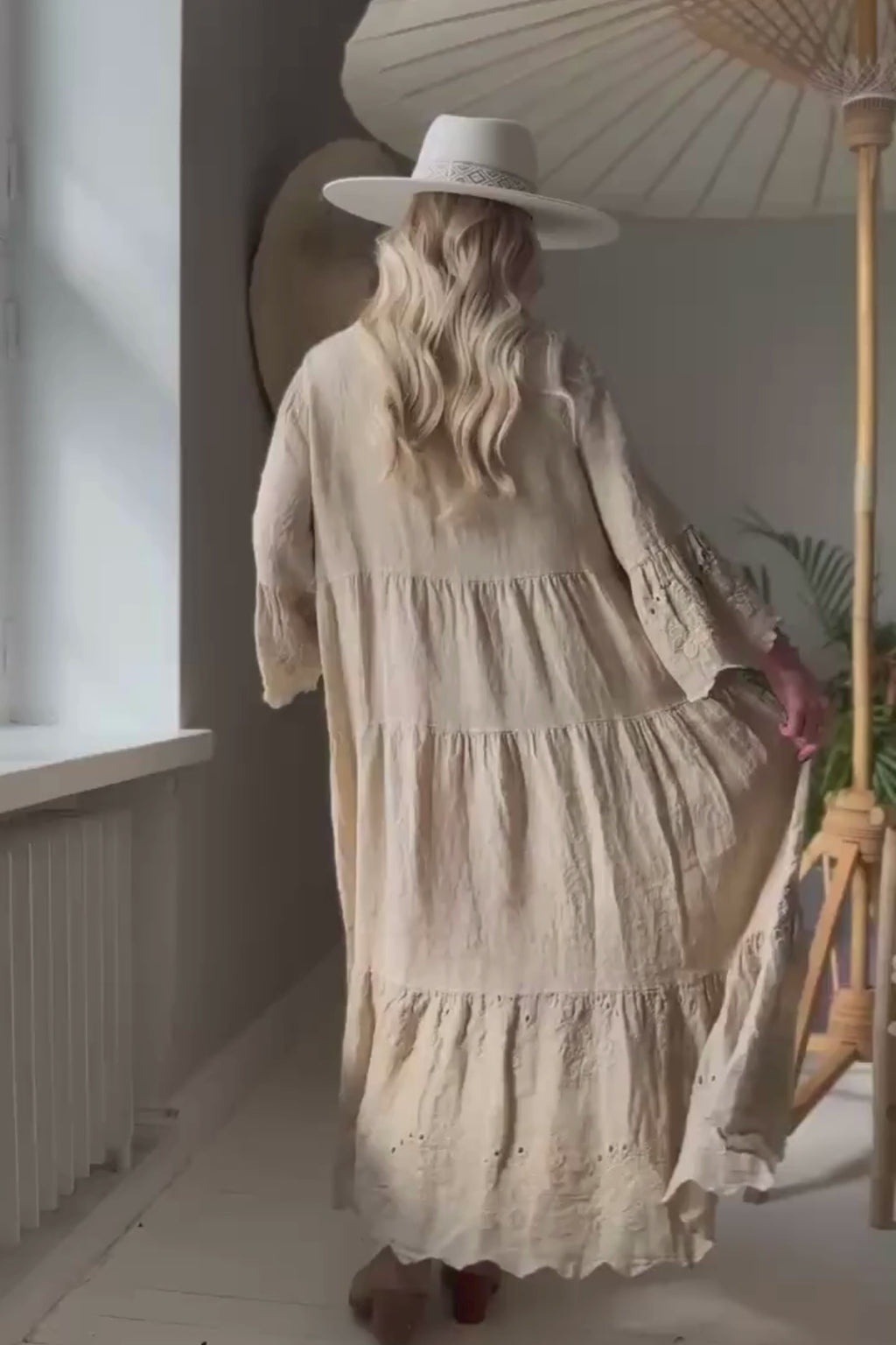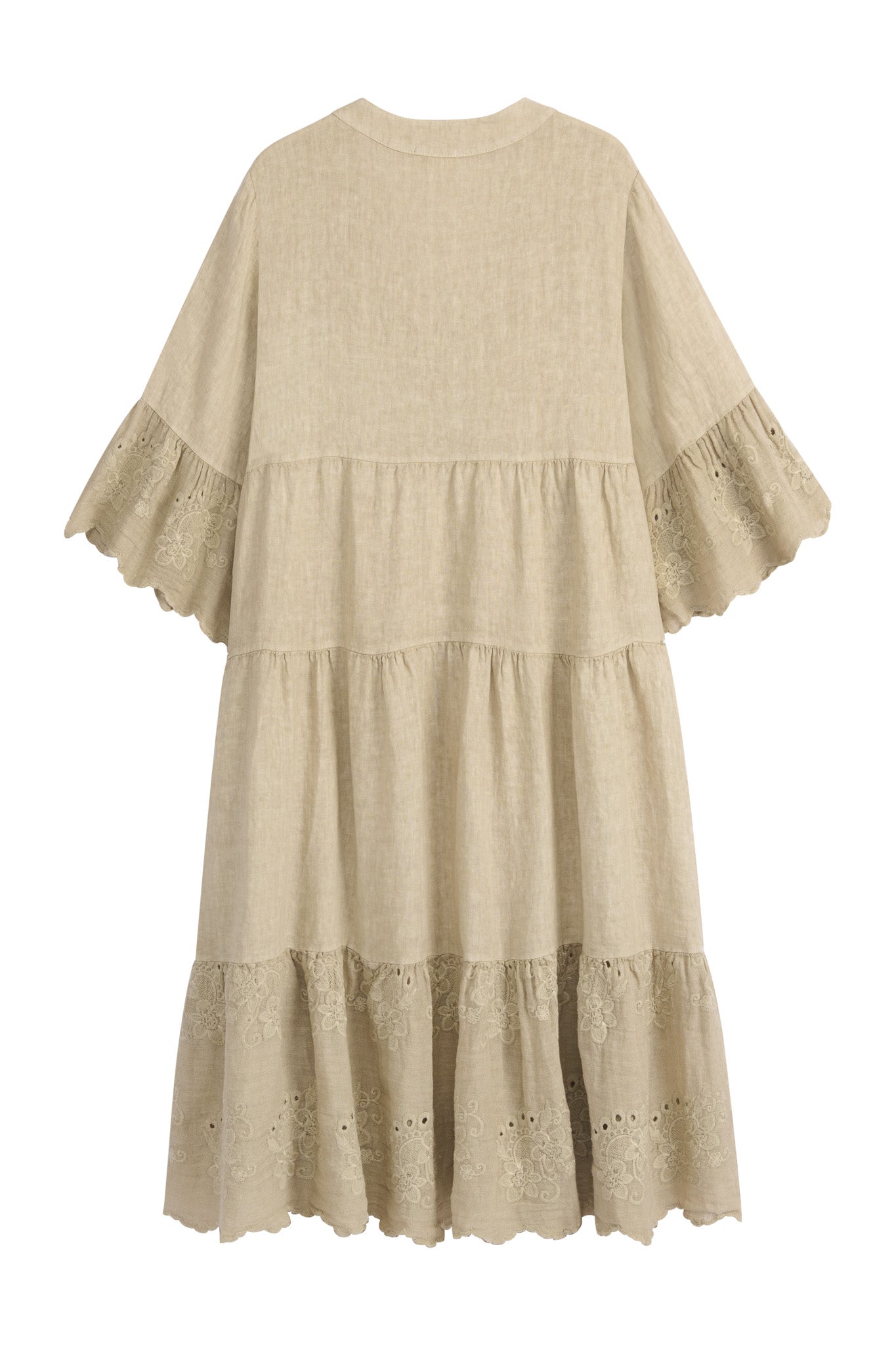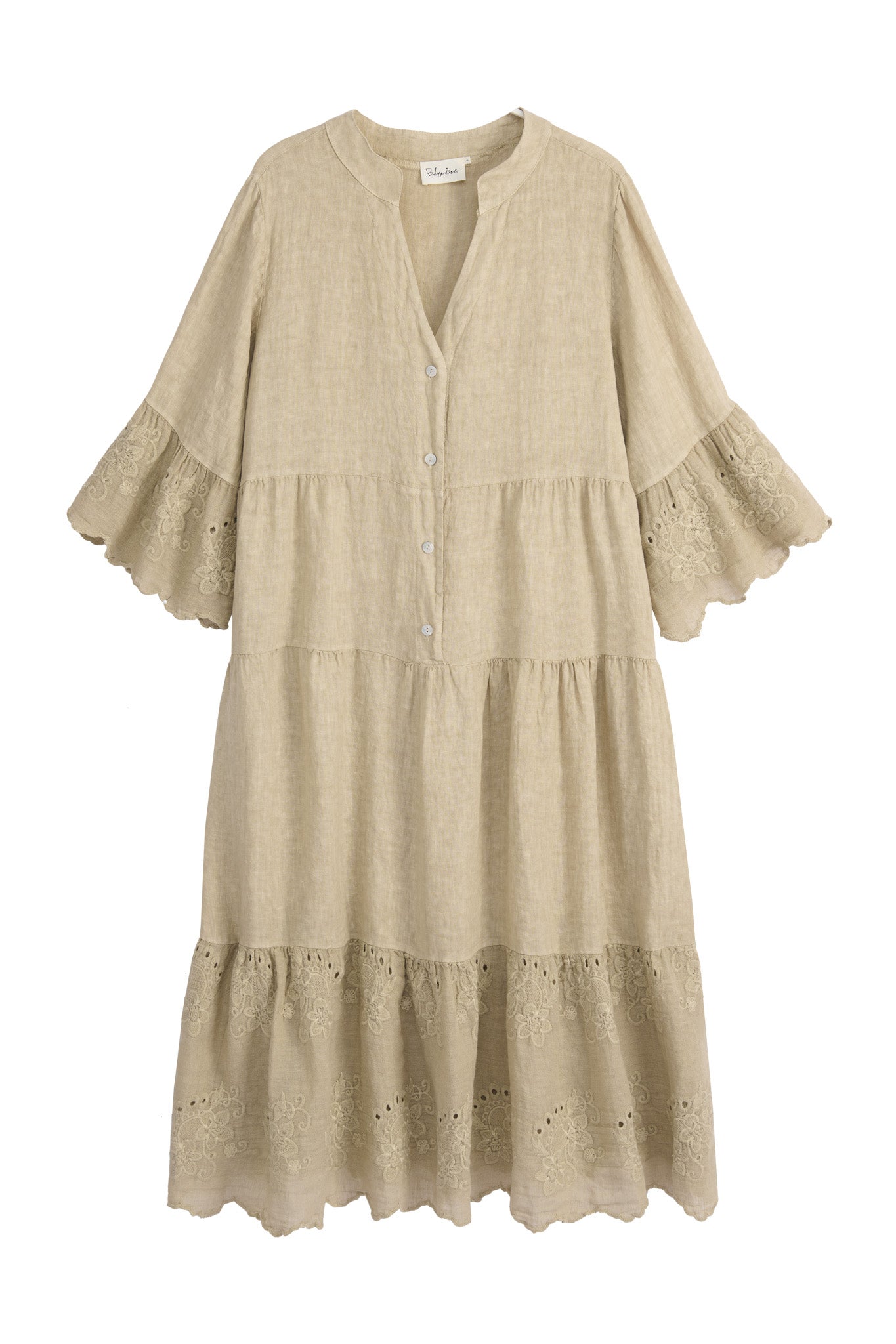 Enchanting A-line linen dress featuring a stand-up collar and V-neckline.