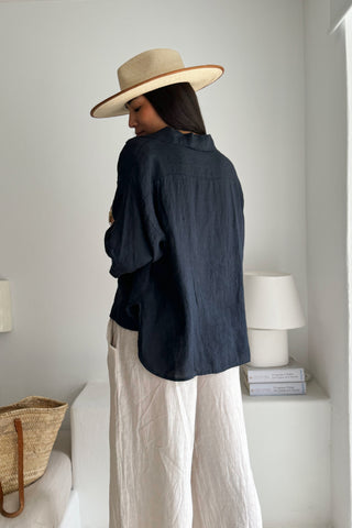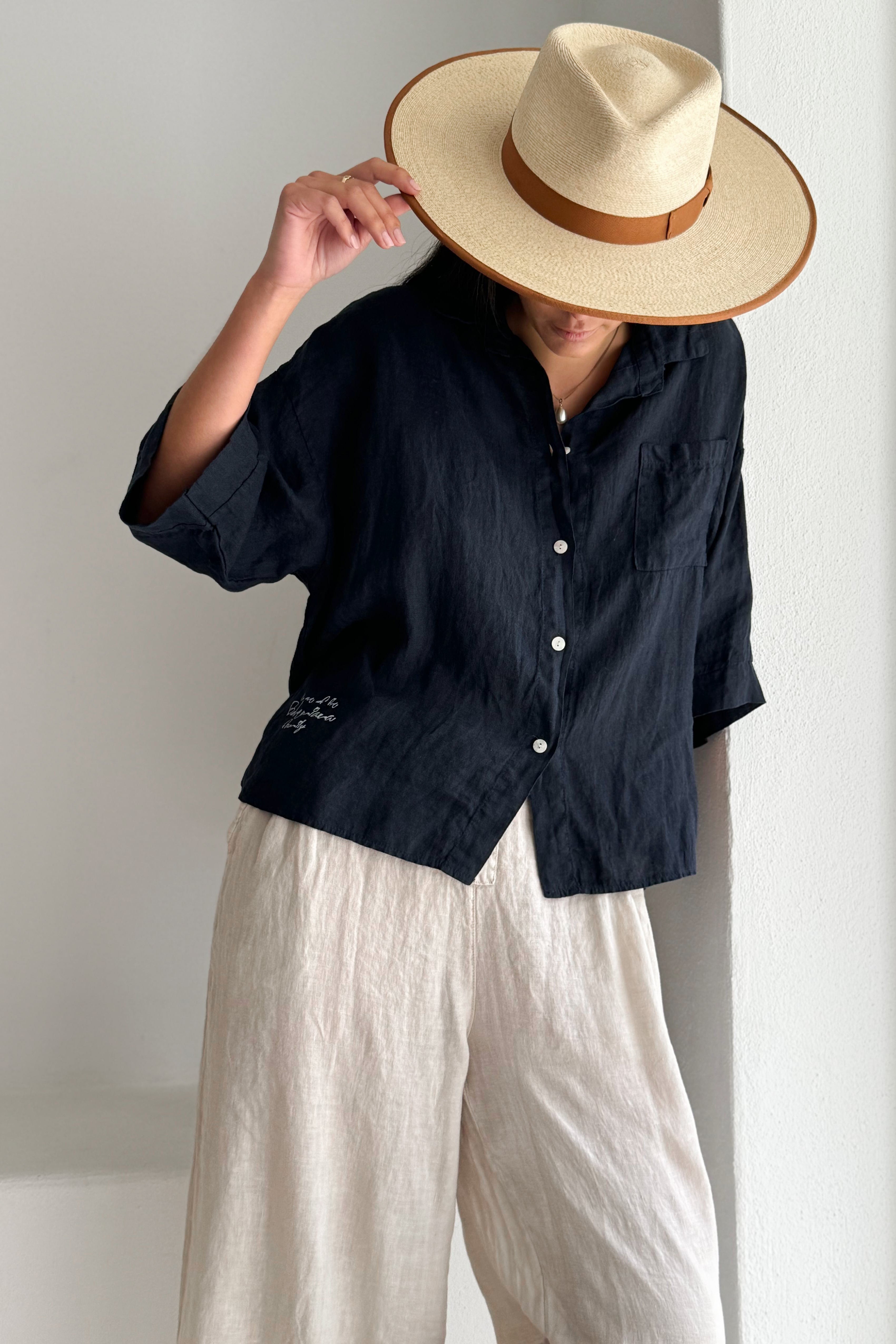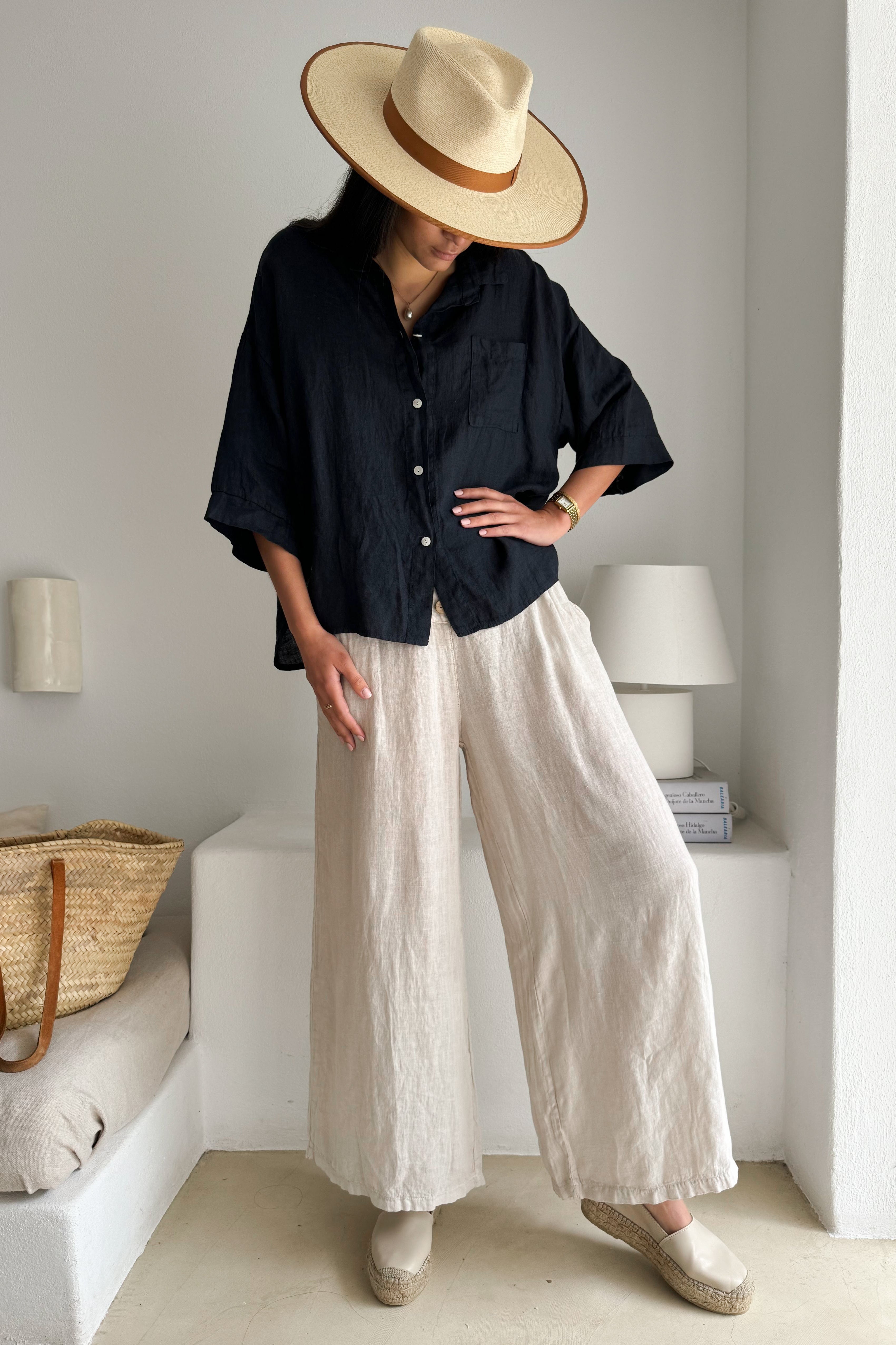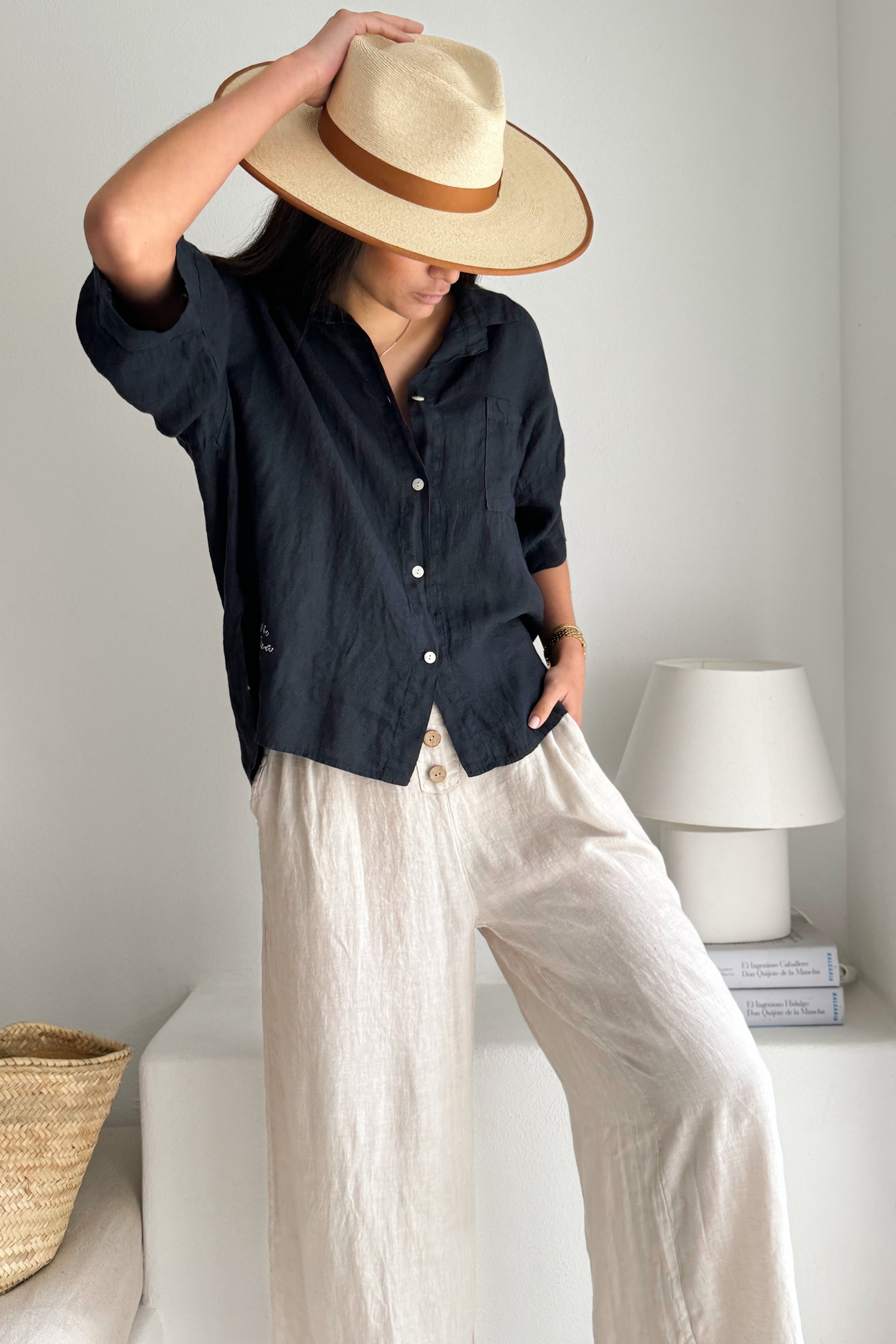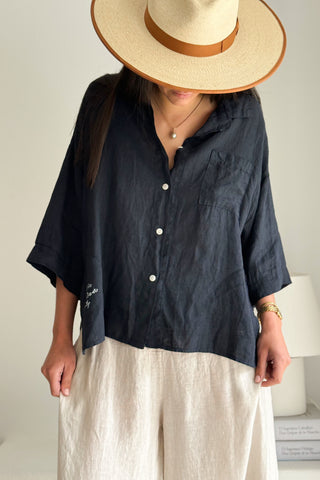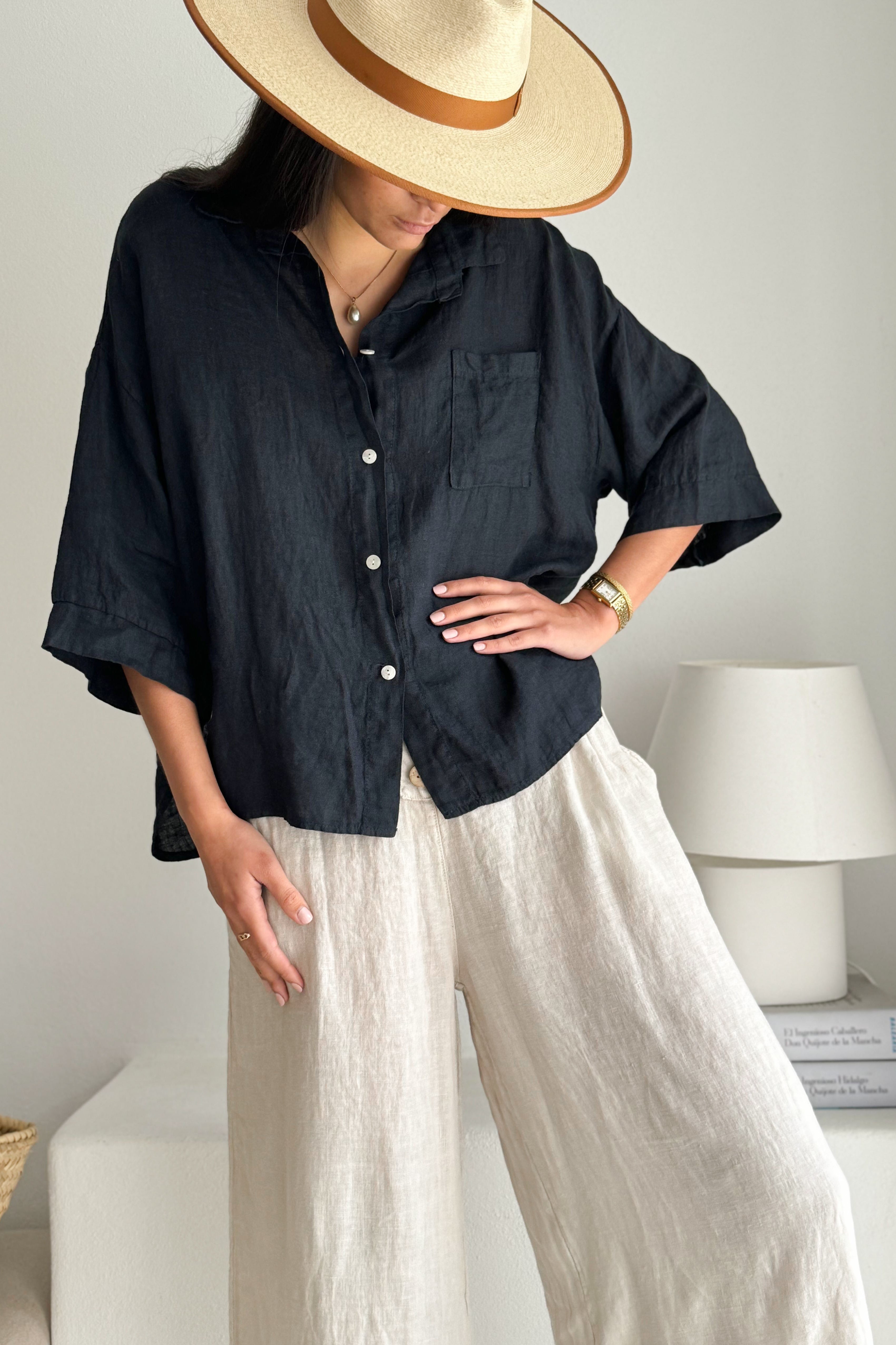 A gorgeous Bohemiana family shirt in soft and airy linen. The shirt has a dropped shoulder line and pearl buttons on the front.