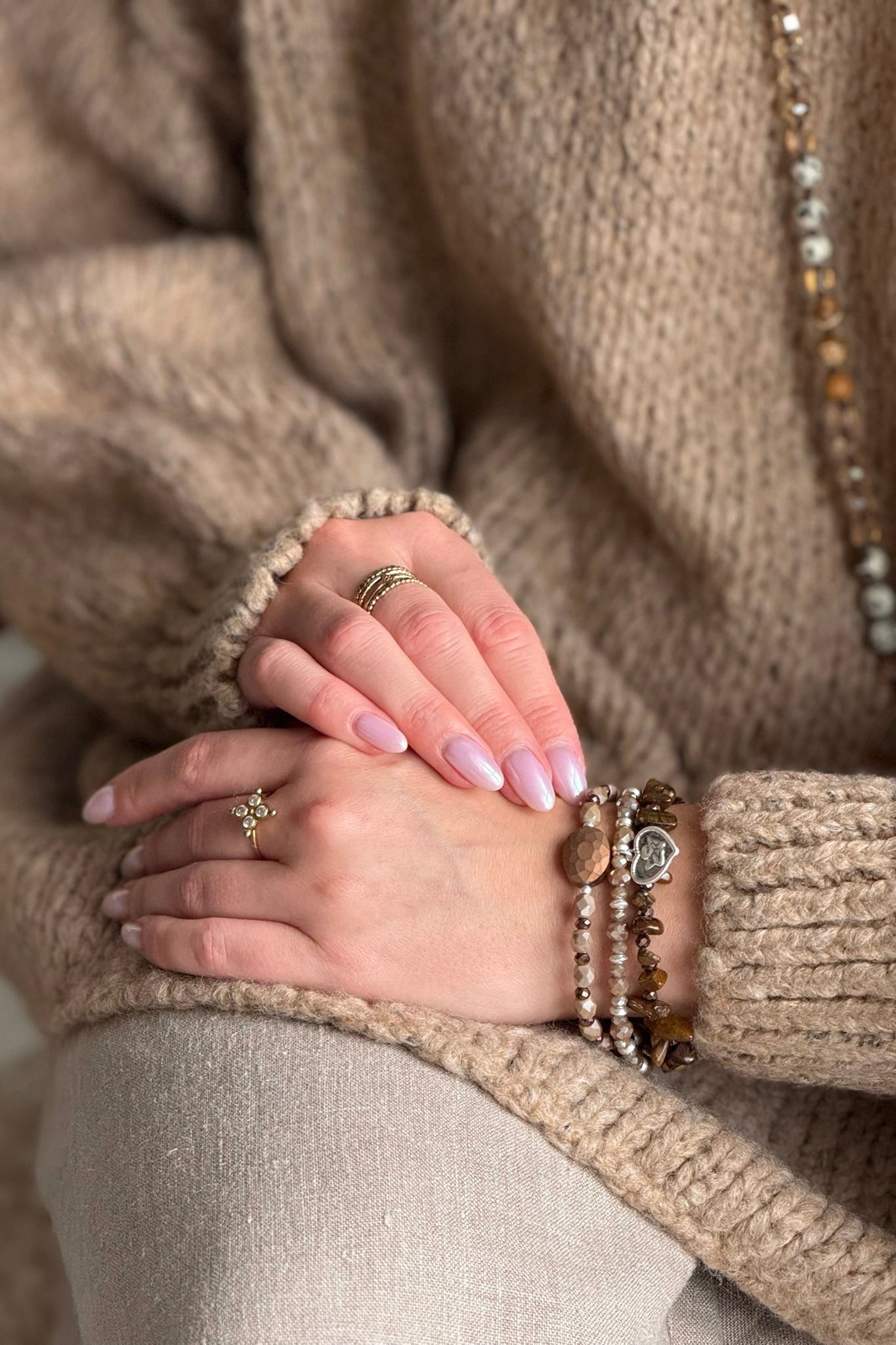 A sparkling and lightweight combination of three bracelets. The jewelry features both small pearls and small pearls that imitate stones. Lovely details include a small silver-colored heart plaque and a brown stone with a marble pattern.