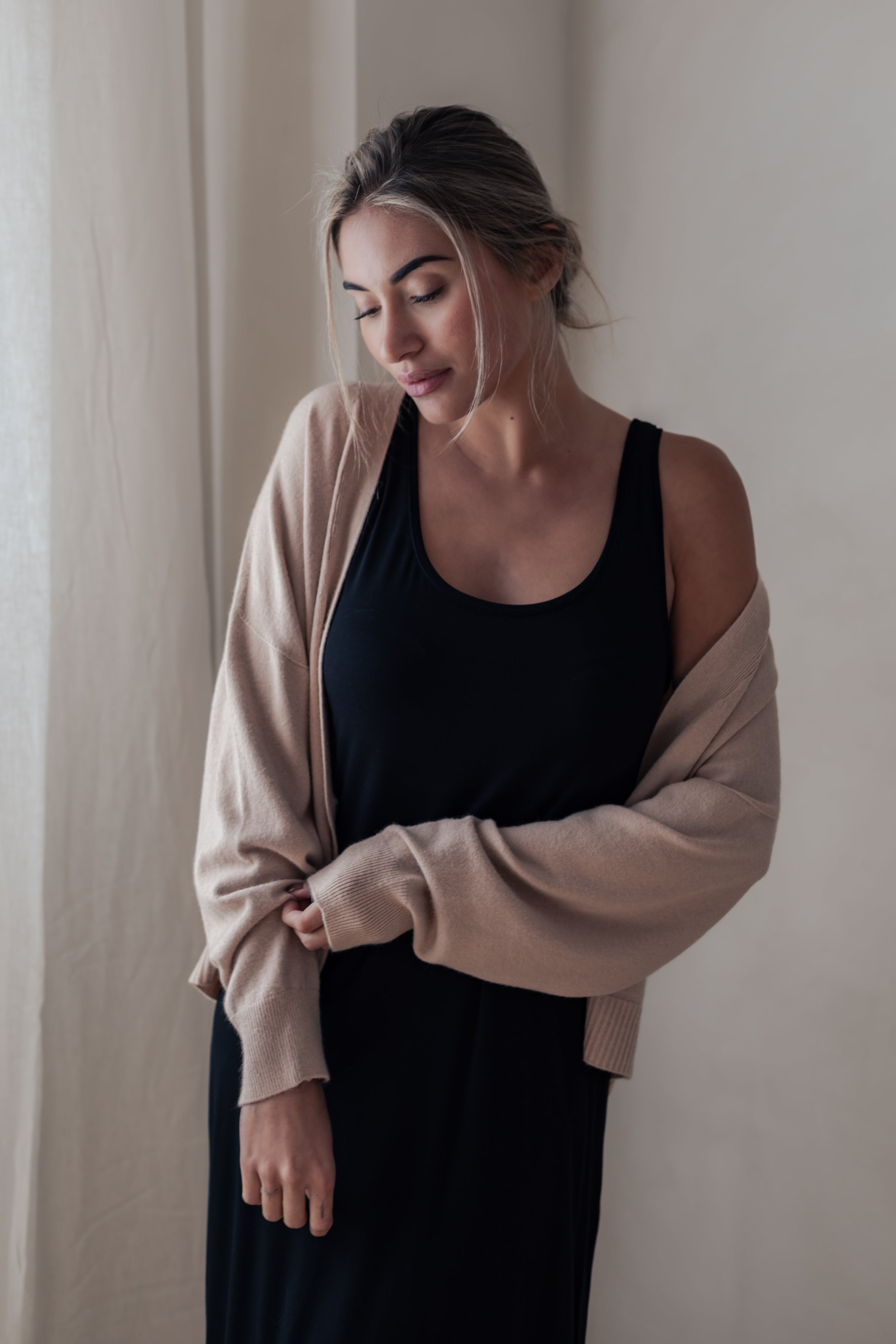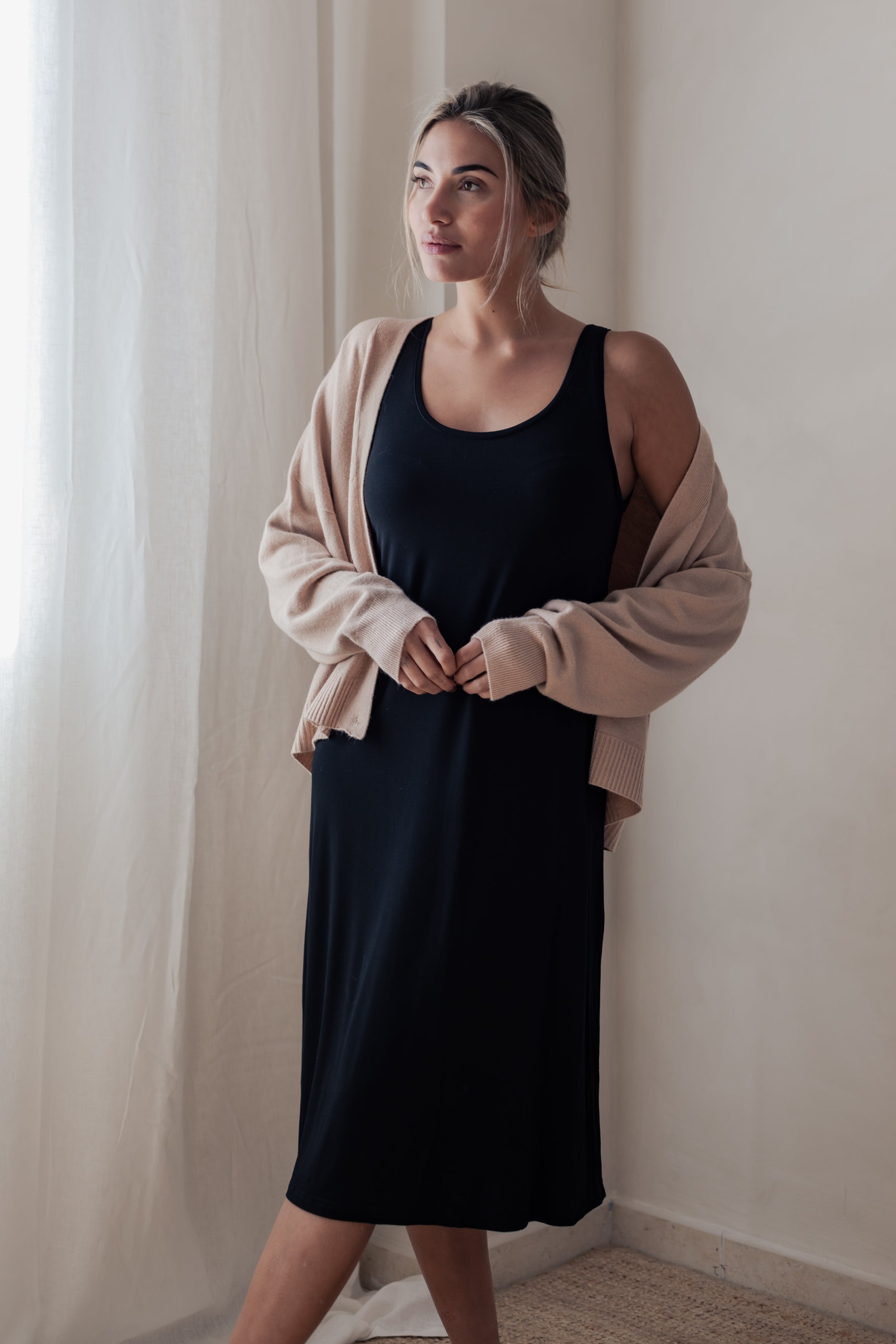 Sleeveless bamboo dress with a wide neckline. Made from luxuriously soft and breathable bamboo fabric that feels wonderfully comfortable against the skin. The material is lightweight and drapes beautifully.