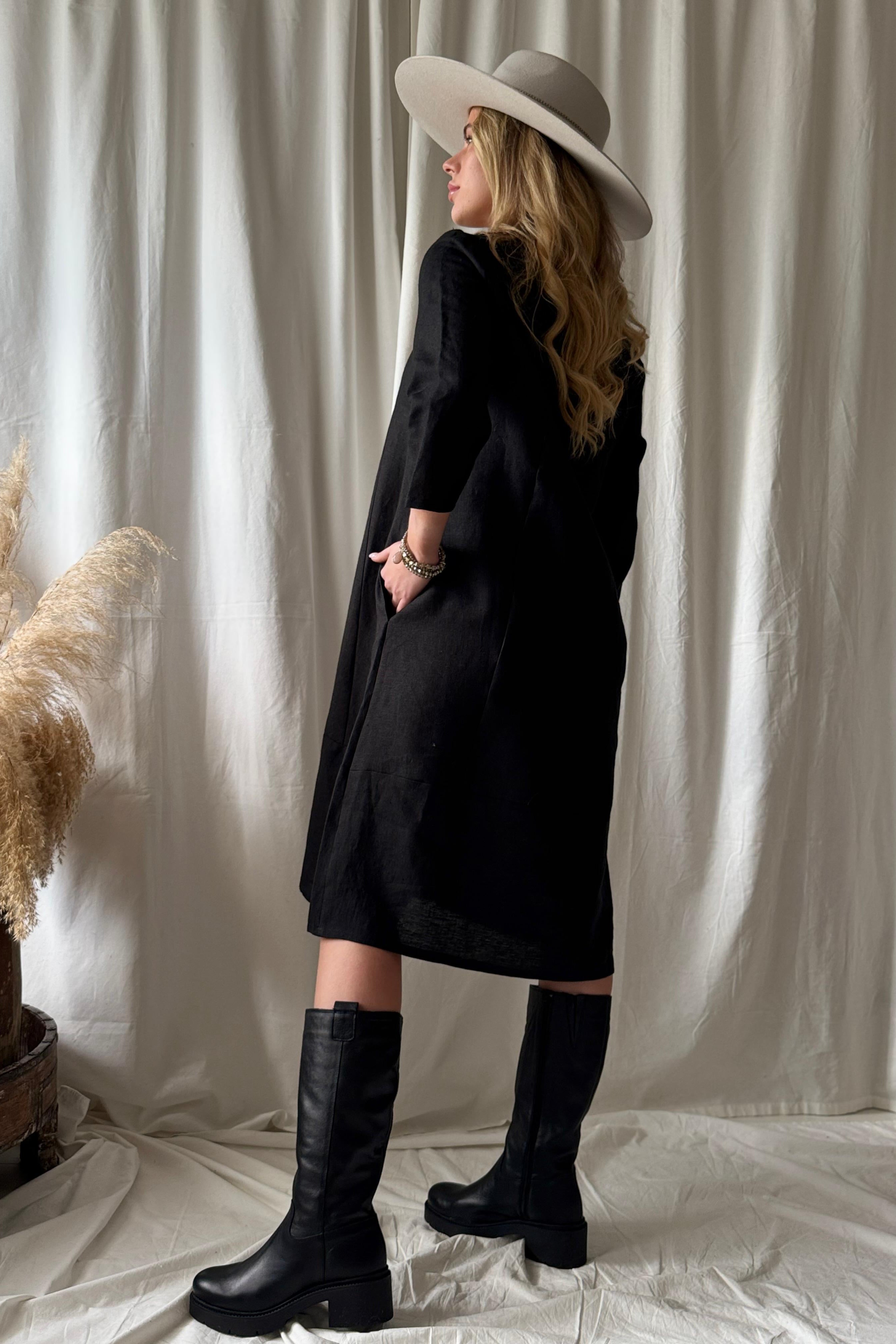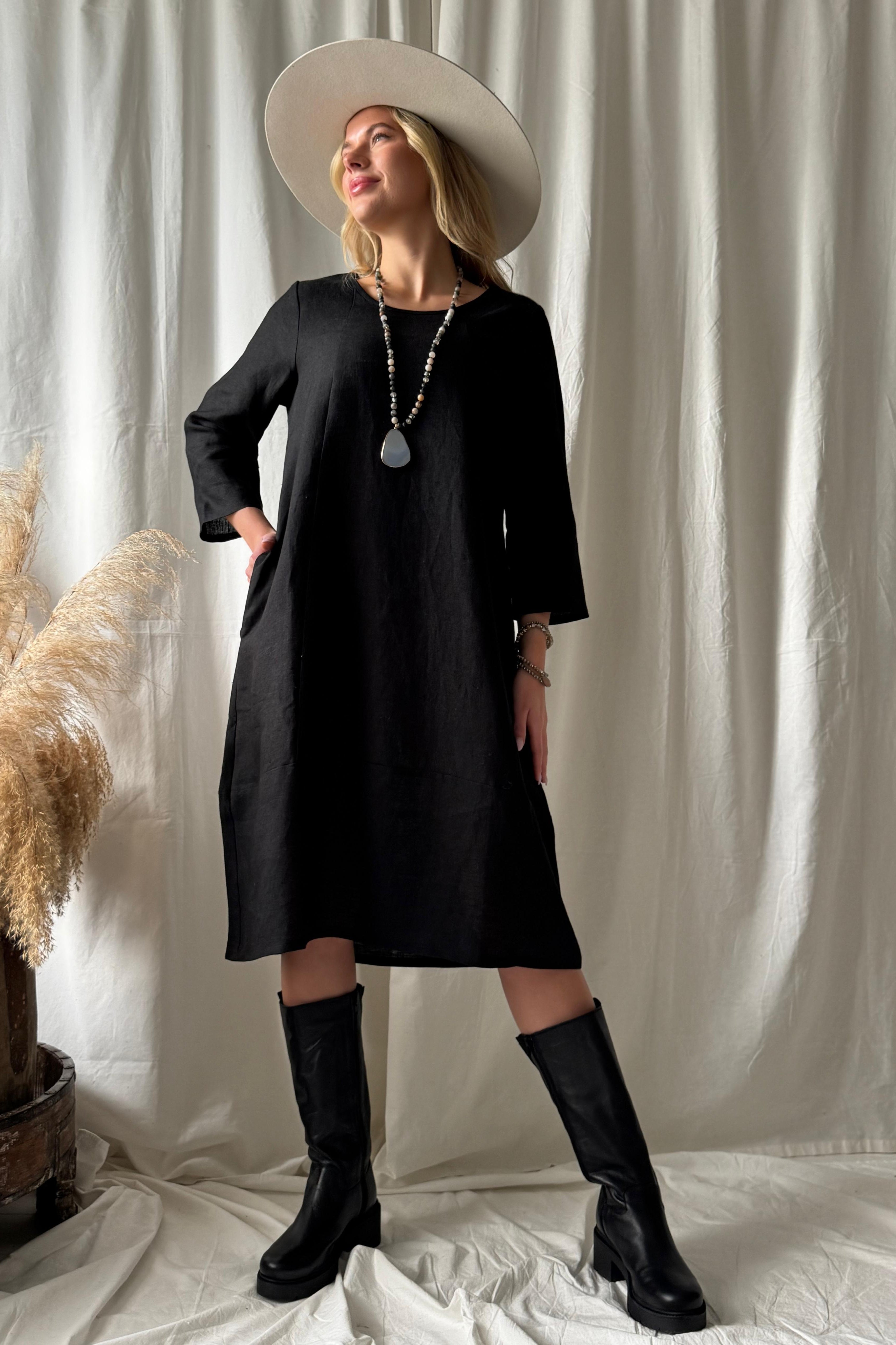 Lovely and loose linen dress with side pockets. Round neckline and decorative seam at the hem, slightly short sleeves.