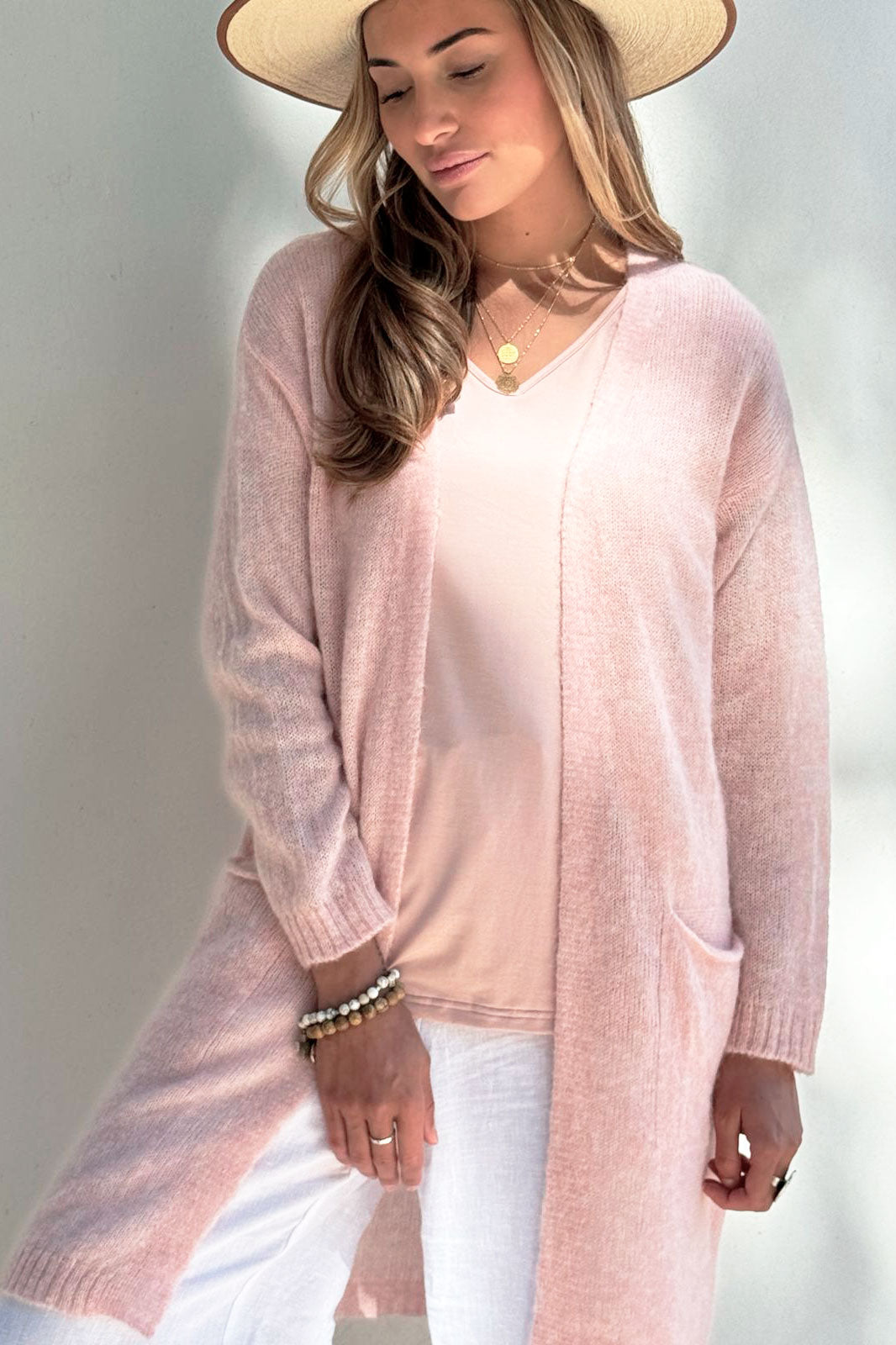 Light and soft cardigan made of a luxurious blend of alpaca and virgin wool. Front open model and front pockets on the sides. High-quality Italian yarn material.
