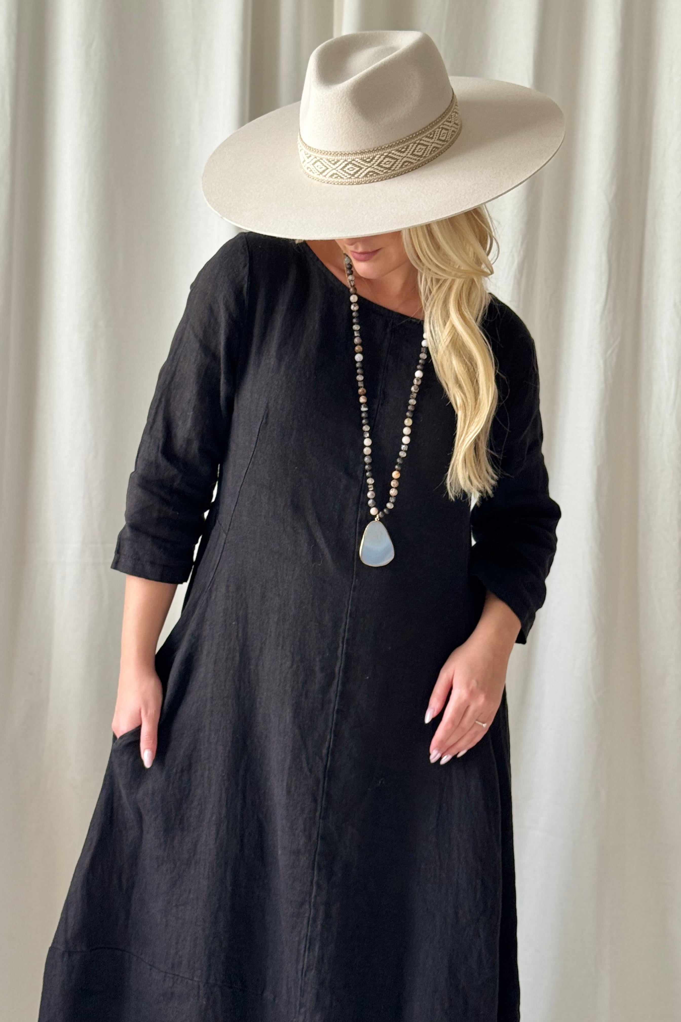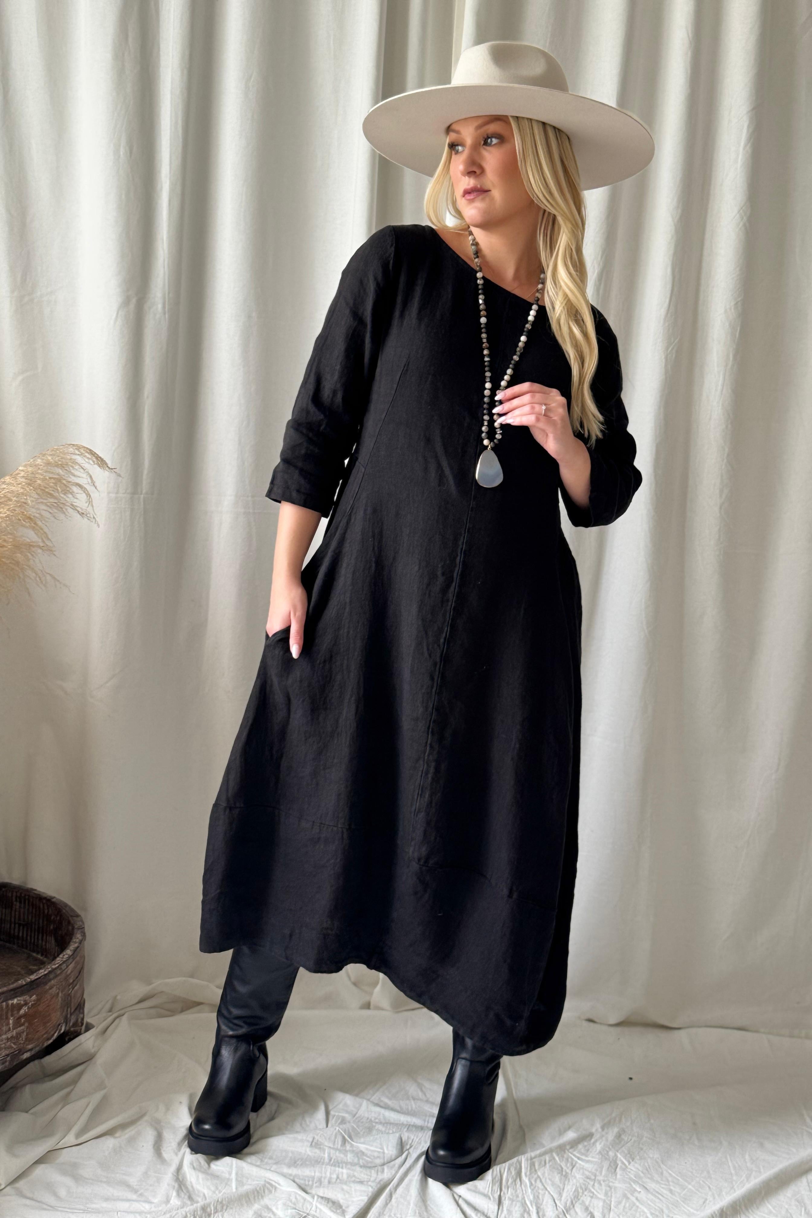Charming linen dress with round neckline and 3/4 length sleeves. Button at the back. Elasticated sides, which allows the model to fit nicely from the waist. Hidden pockets on the sides.
