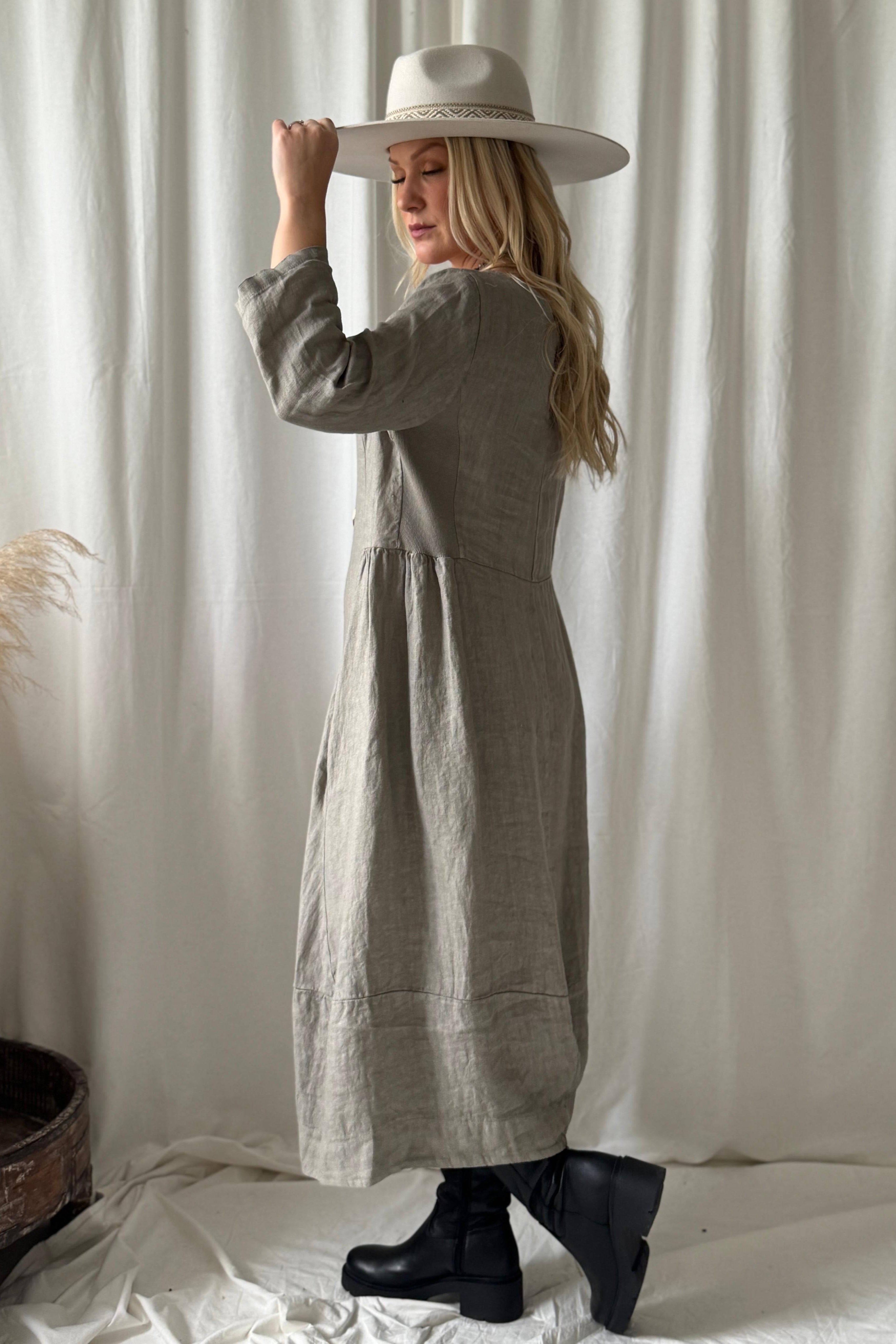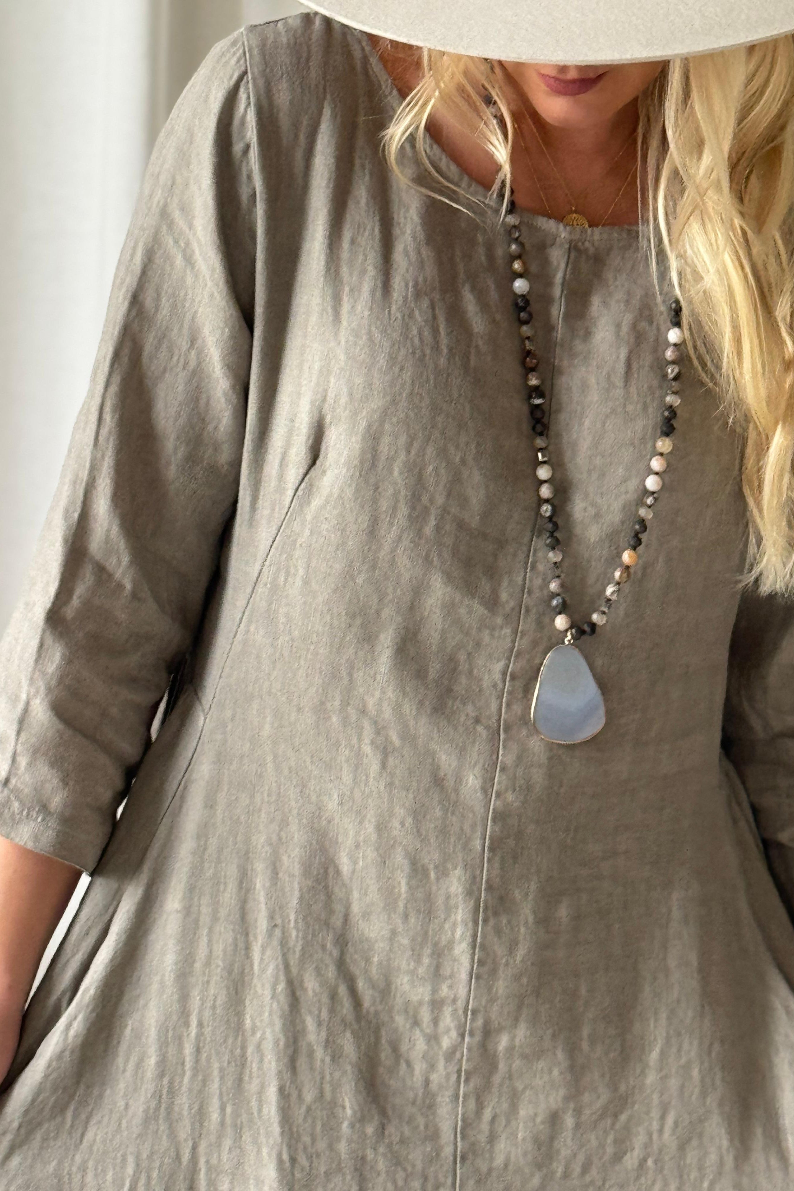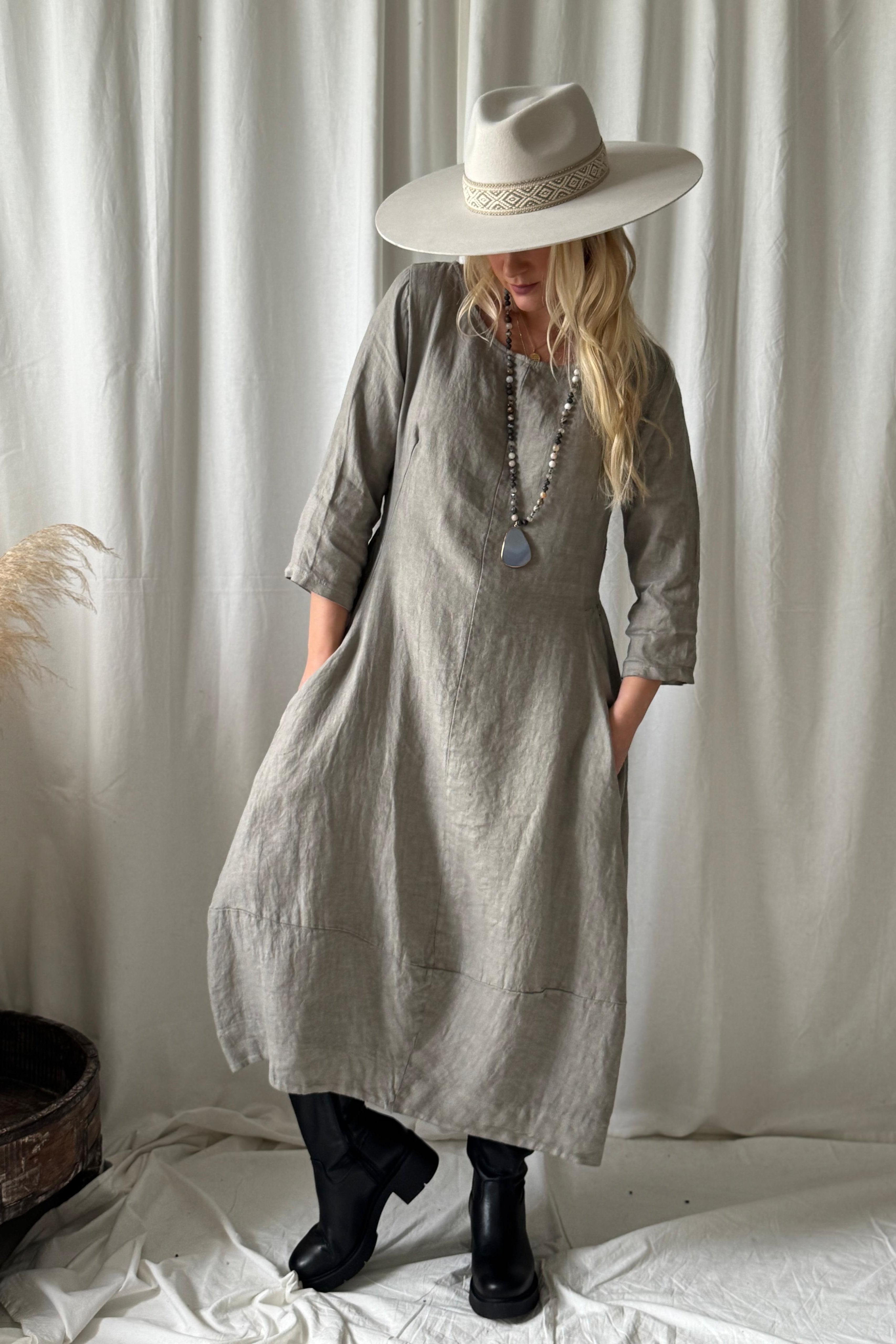 Hurmaava pellavamekko pyöreällä pääntiellä ja 3/4-pituisilla hihoilla. Pääntiessä takana nappi. Sivuilla joustava resoriosa, jonka ansiosta malli istuu kauniisti vyötäröltä. Piilotaskut sivuilla.