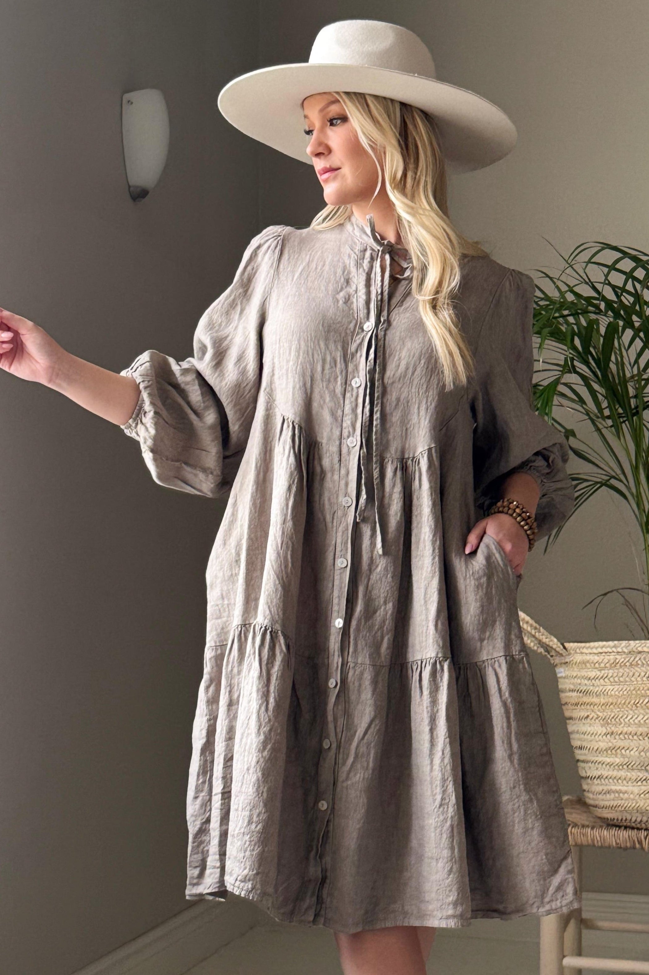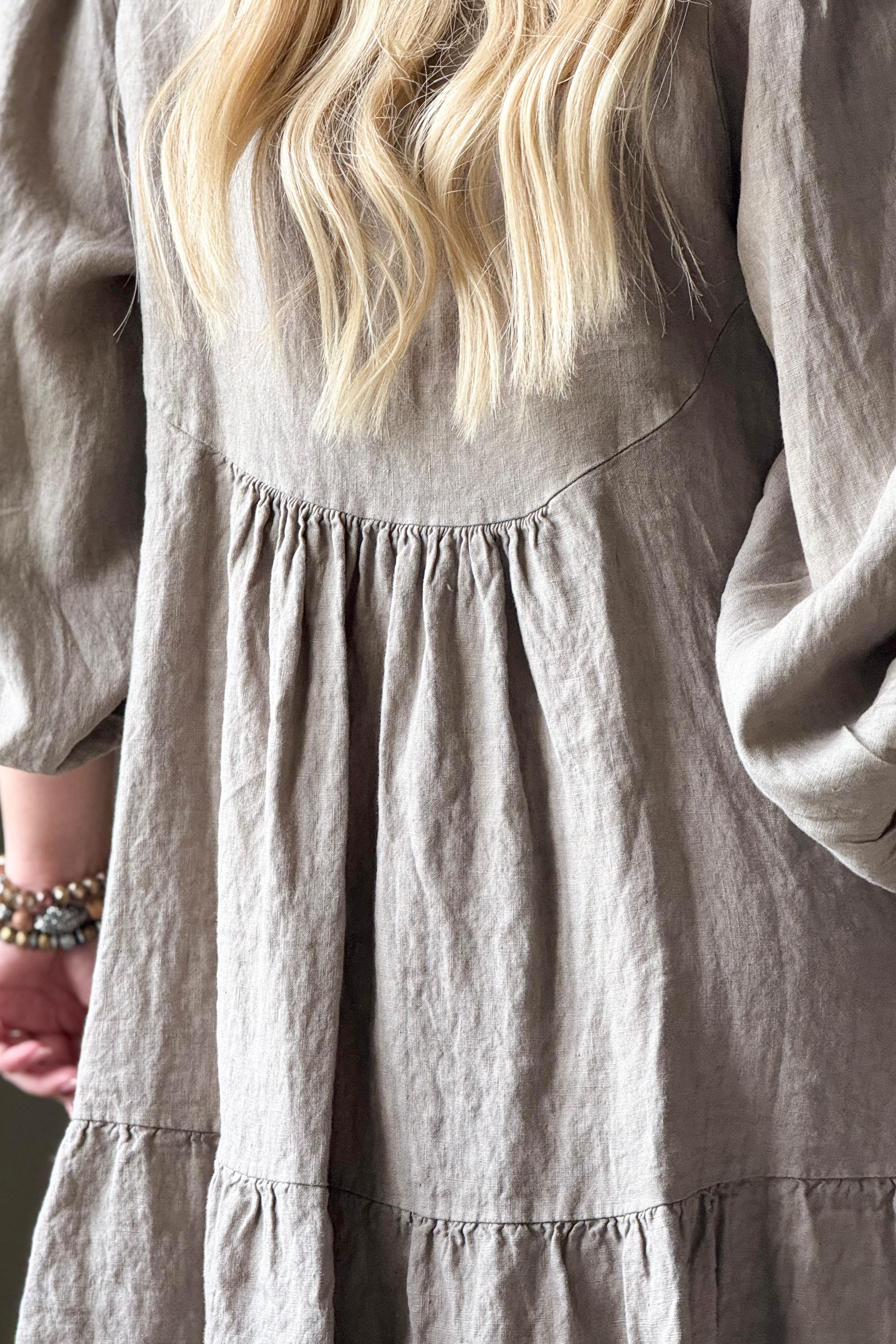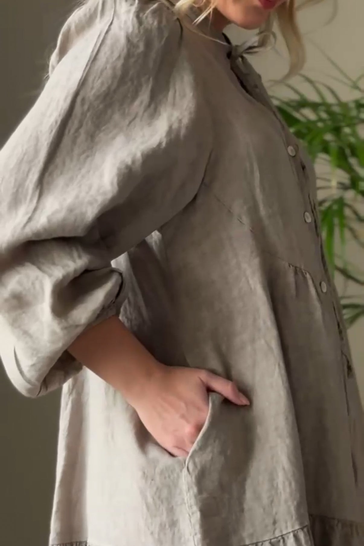 Upea pellavainen paitamekko, jossa kauniit puhvitetut hihat, helmassa frillat sekä edessä napitus. Sivuilla käytännölliset piilotaskut.