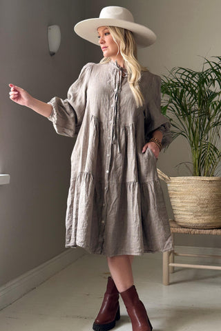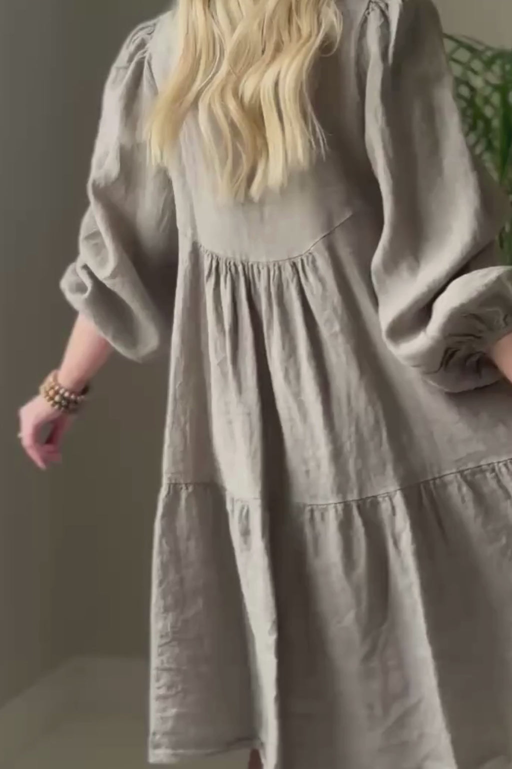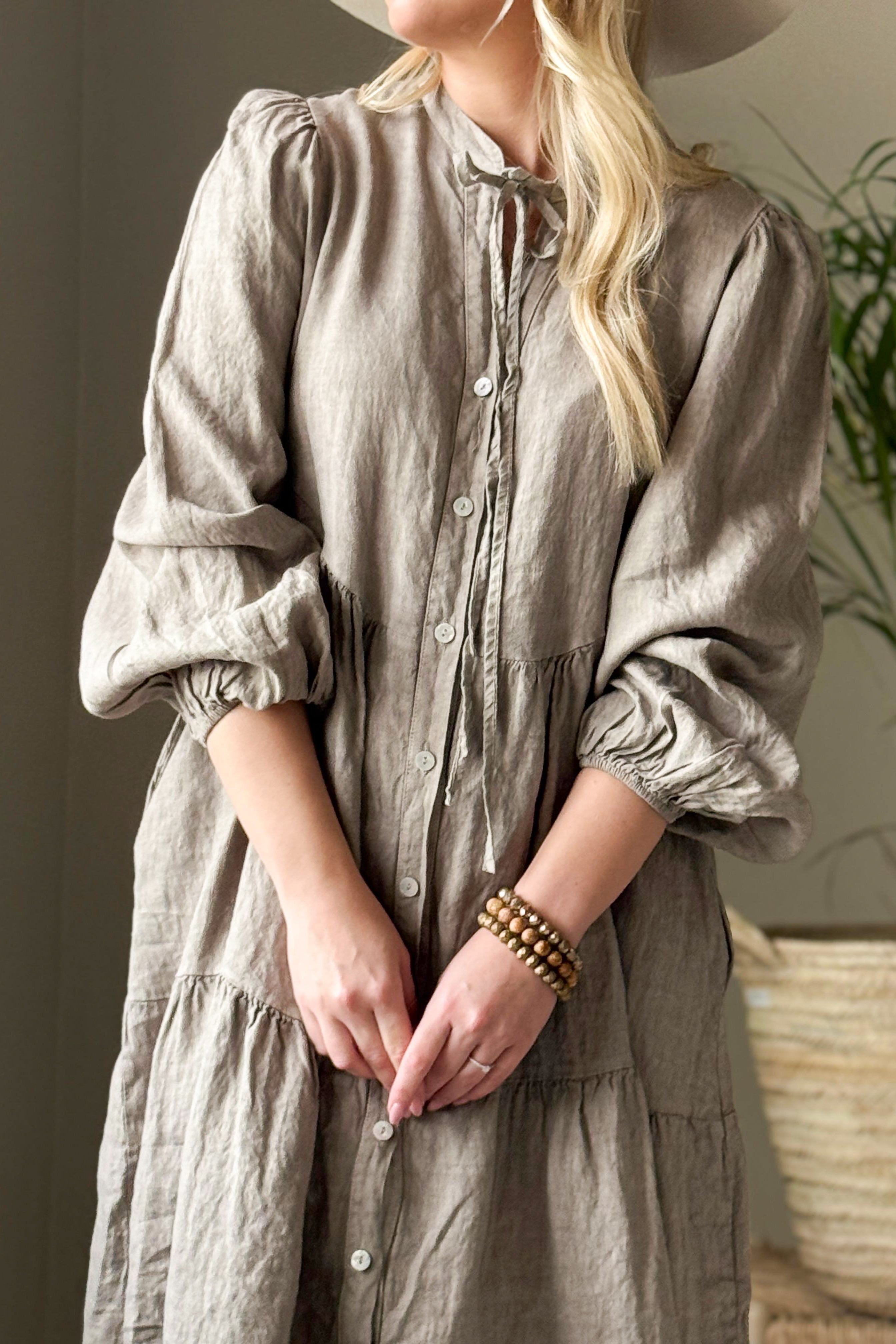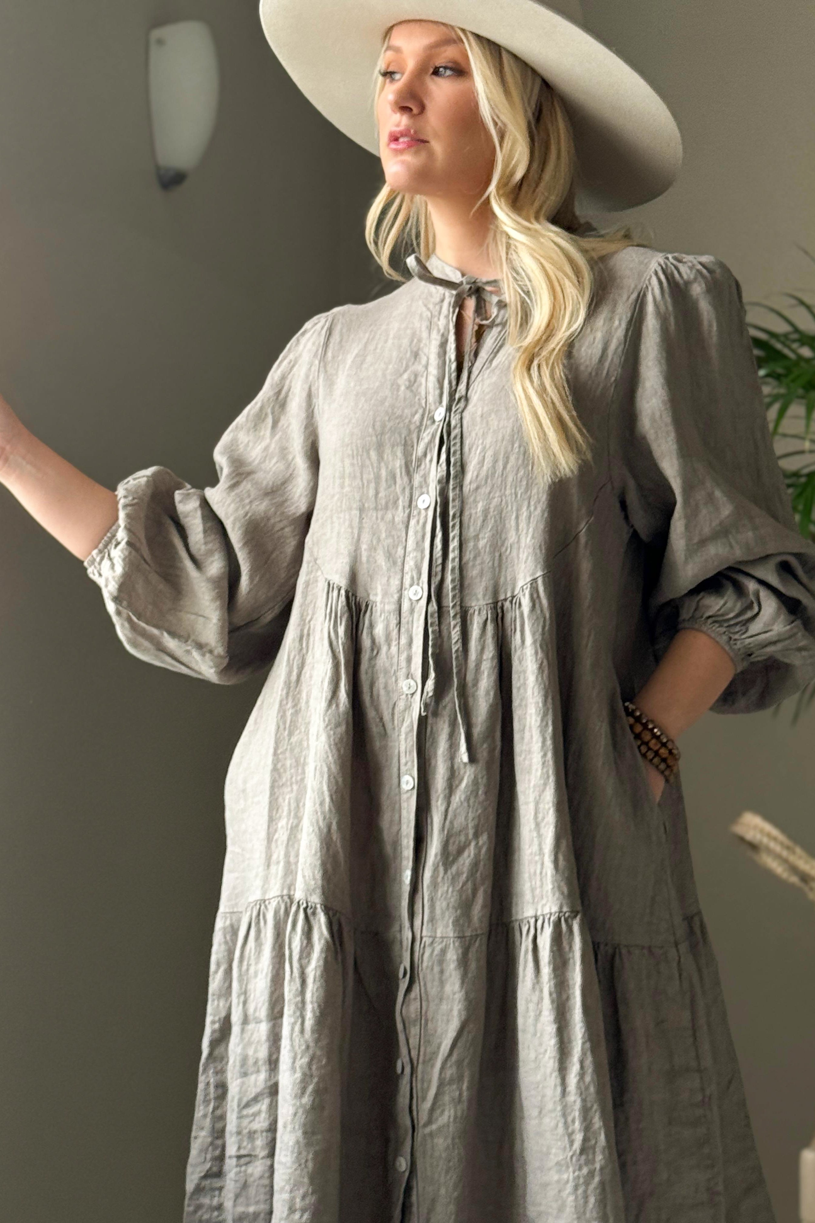 Upea pellavainen paitamekko, jossa kauniit puhvitetut hihat, helmassa frillat sekä edessä napitus. Sivuilla käytännölliset piilotaskut.