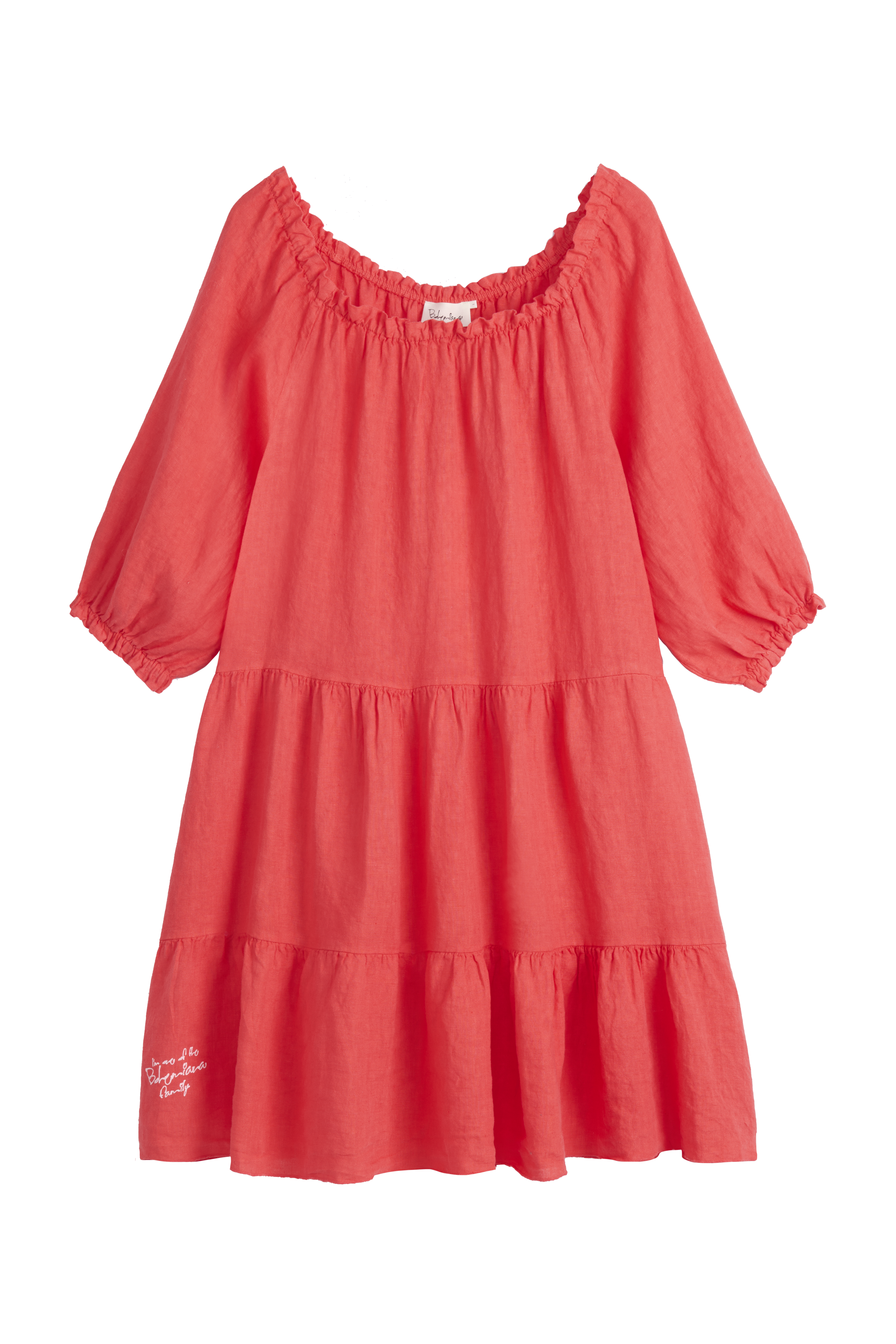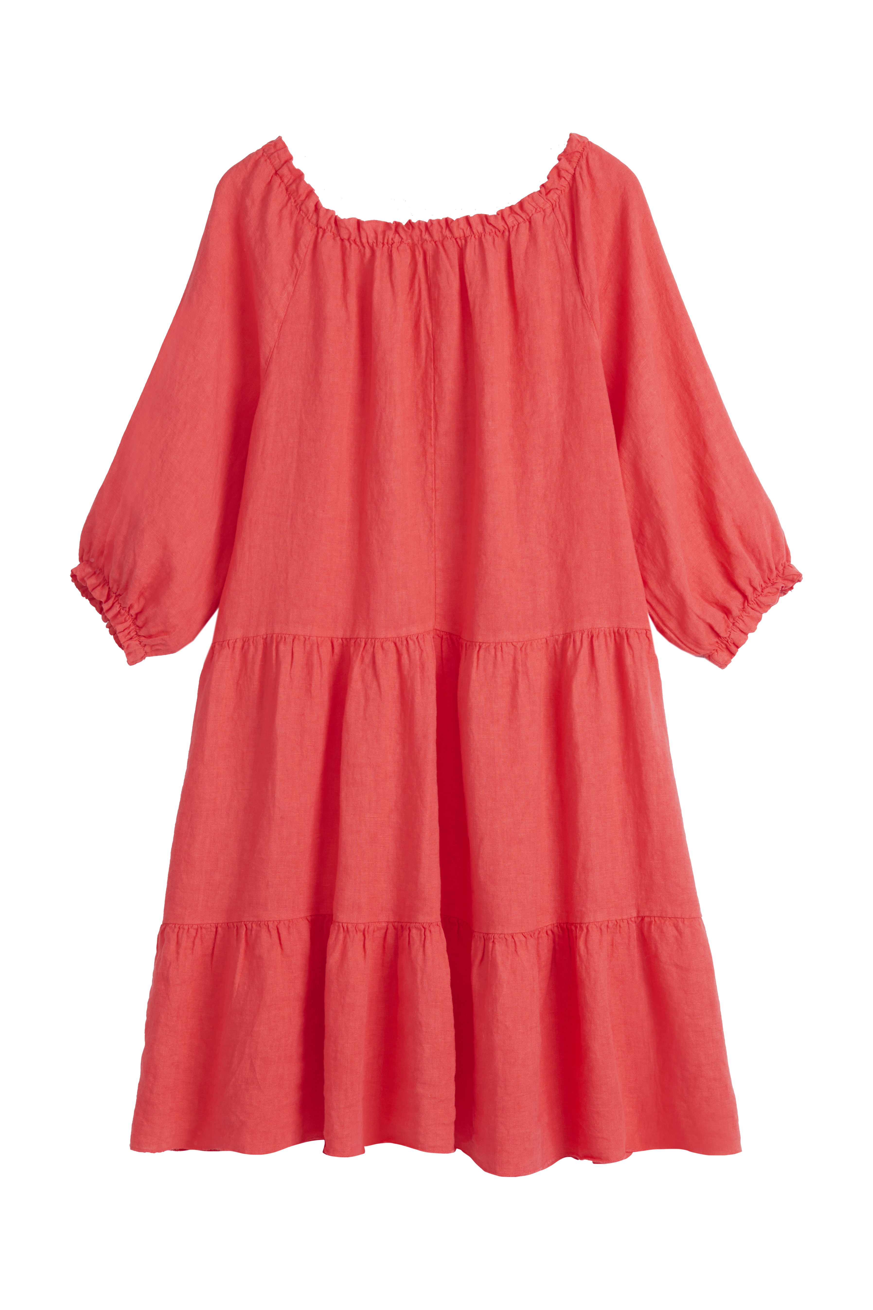 The Abby linen dress drapes beautifully and thanks to the flexible neckline, you can also wear it as an off-shoulder dress. Light elastic creasing on the cuffs and neckline.