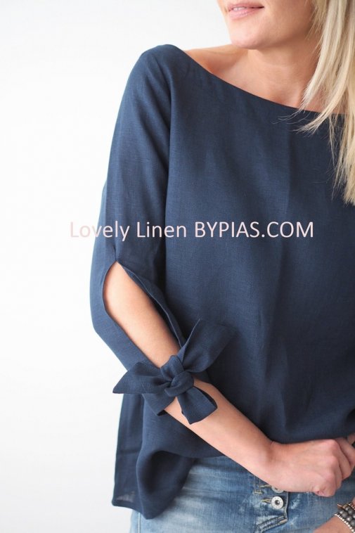 Stylish linen shirt with a boat-shaped neckline and beautiful slits in the sleeves with tie cuffs. This shirt is suitable for both everyday and festive occasions.