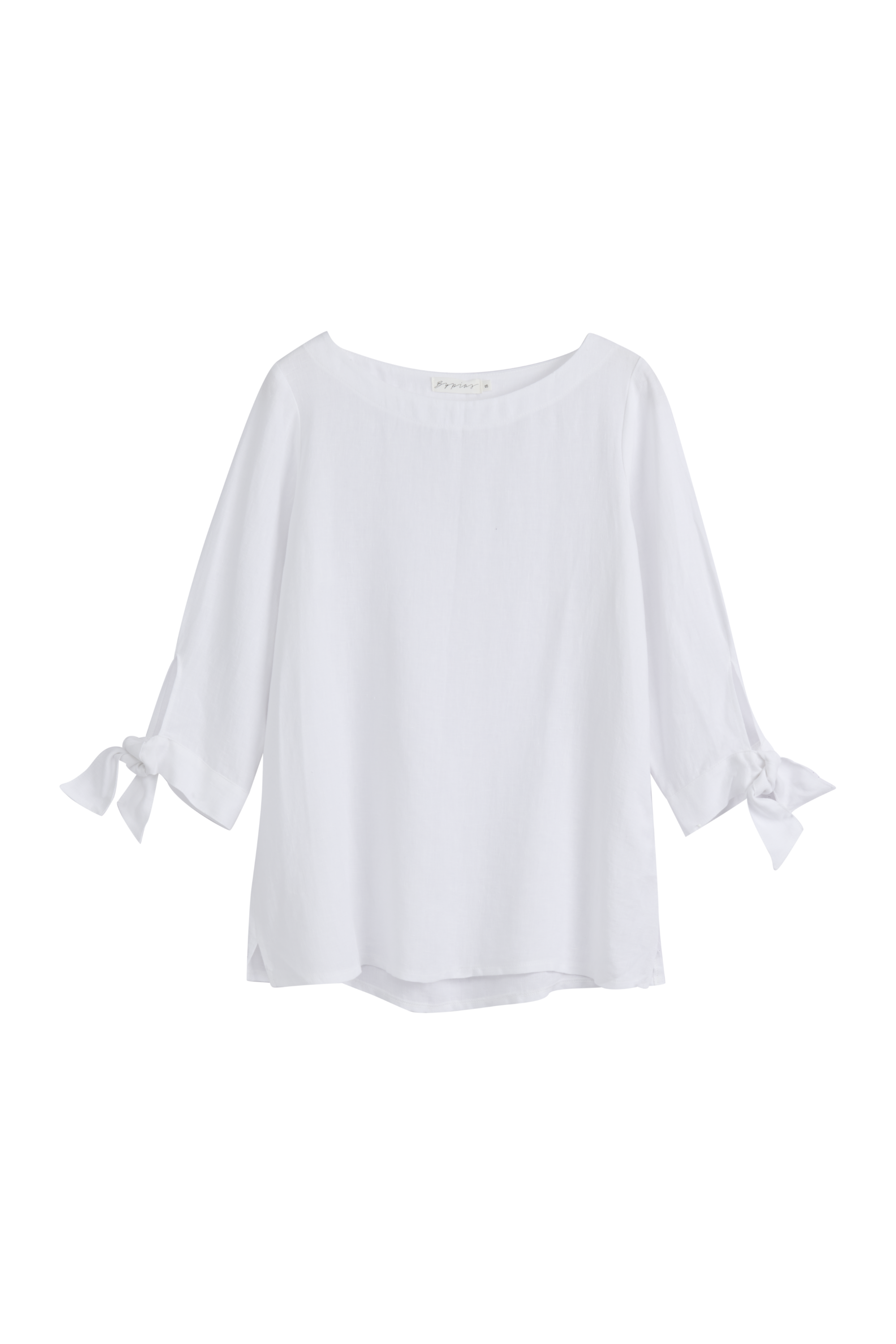 Stylish linen shirt with a boat-shaped neckline and beautiful slits in the sleeves with tie cuffs. This shirt is suitable for both everyday and festive occasions.