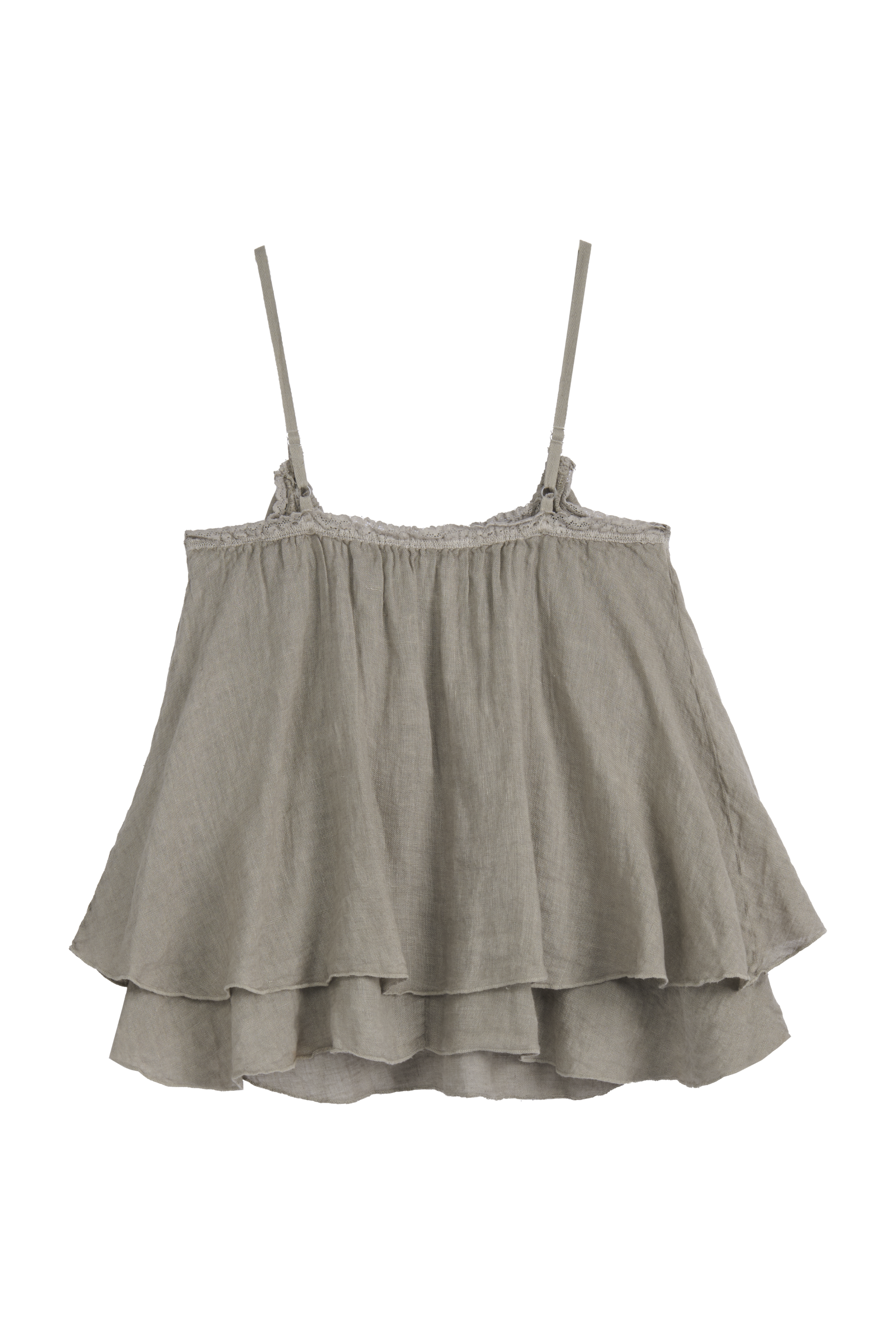 Lovely hemline top with lace and strap ties in the front. The top is double-layered, with a tie at the front and lace trim at the neckline on the inner layer. Adjustable straps, the top is slightly longer at the sides. Elasticated neckline.