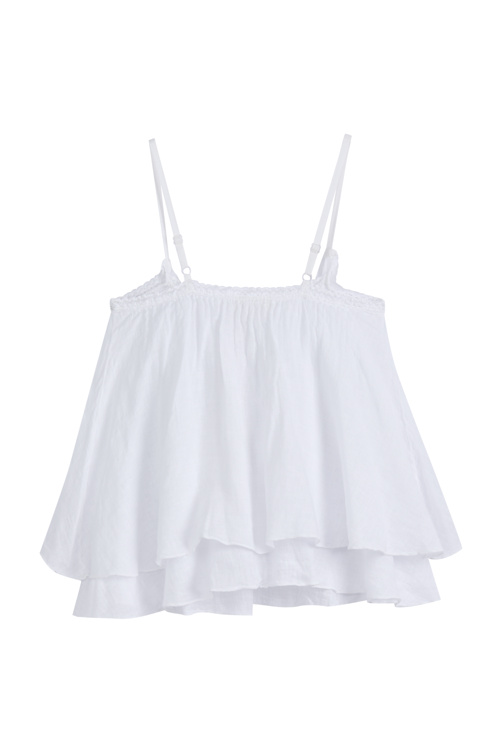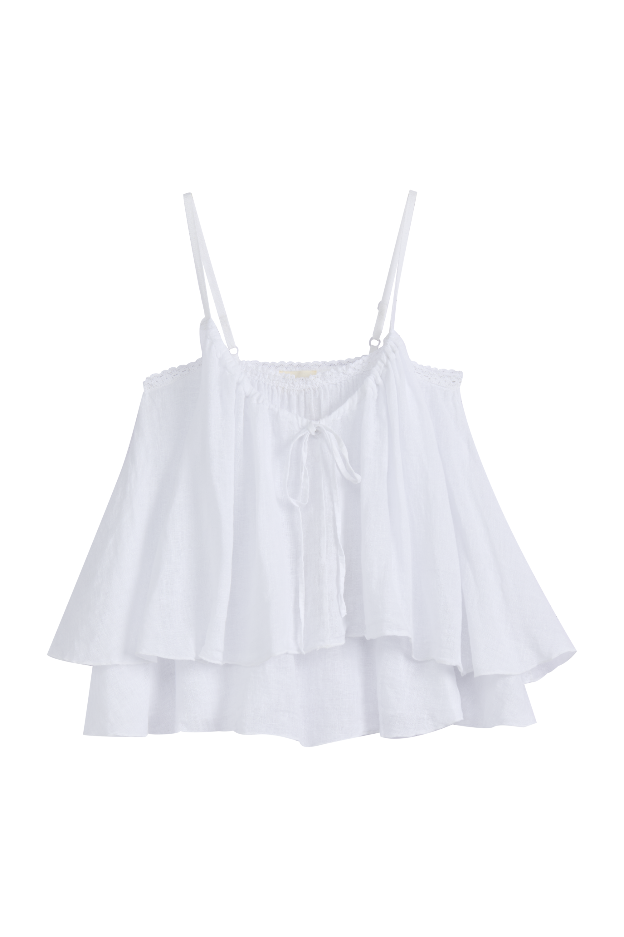 Lovely hemline top with lace and strap ties in the front. The top is double-layered, with a tie at the front and lace trim at the neckline on the inner layer. Adjustable straps, the top is slightly longer at the sides. Elasticated neckline.