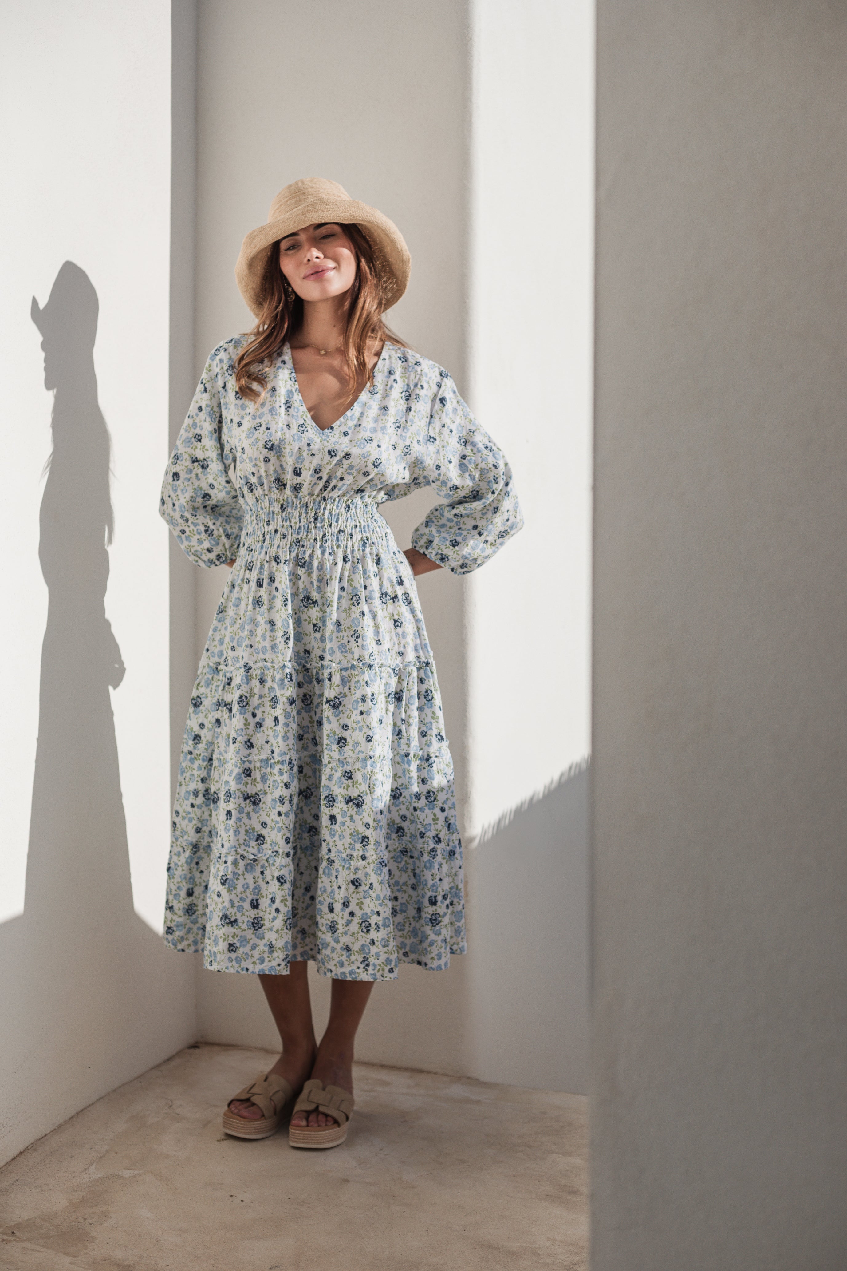 Charming feminine linen dress with striking frills at the hem in three layers. The wide elasticated waistband creates a beautiful silhouette. Half-length sleeves with gathered elastic detailing. Flattering V-neckline.