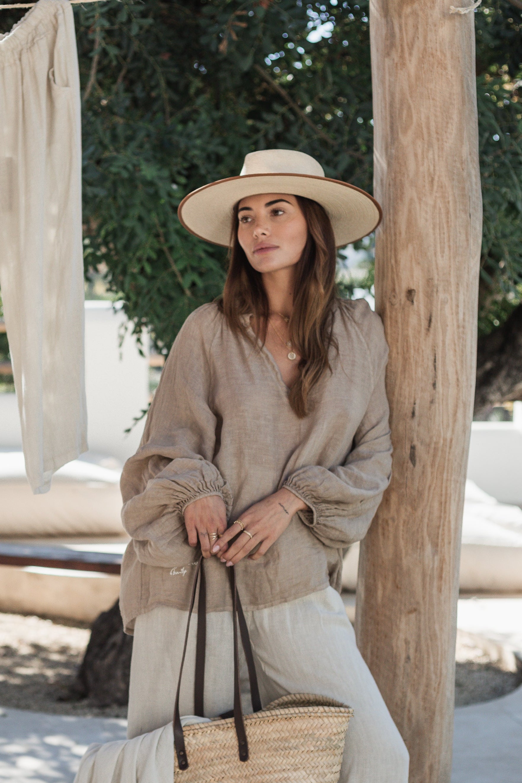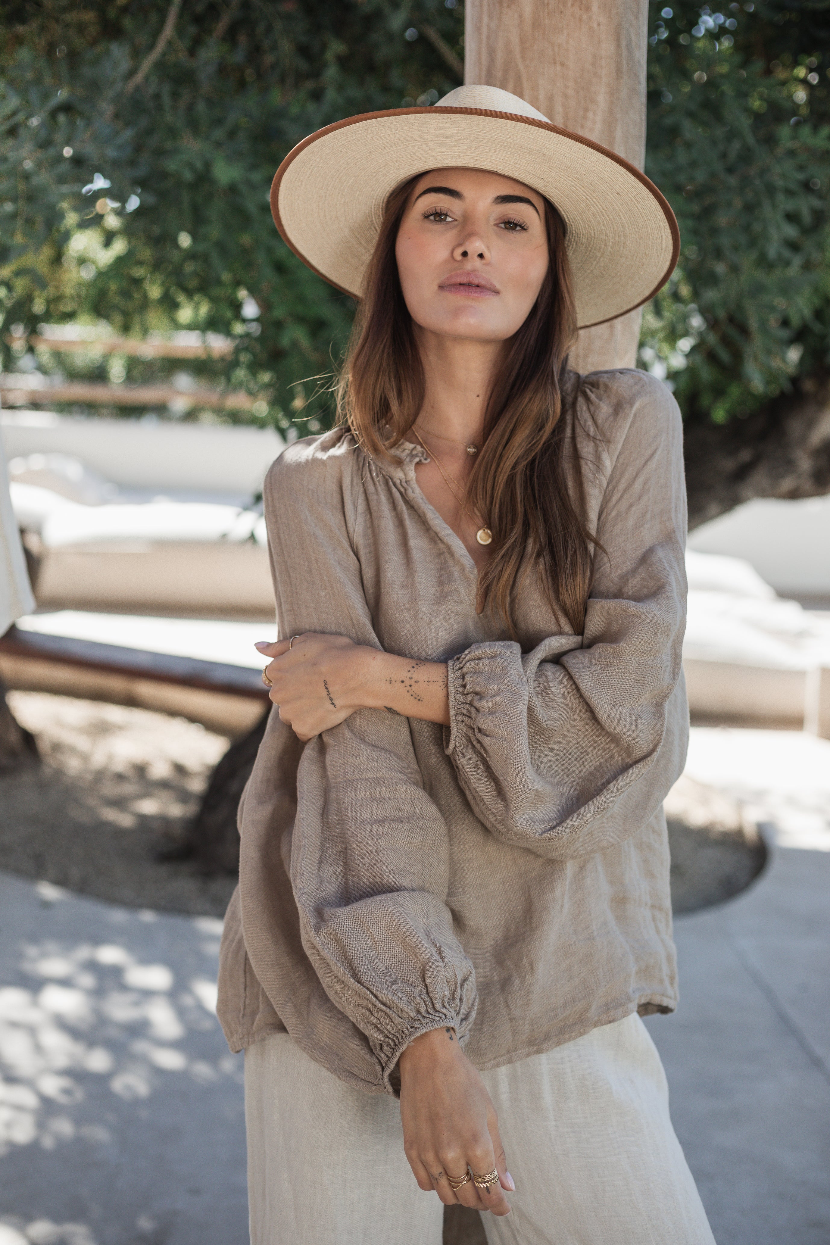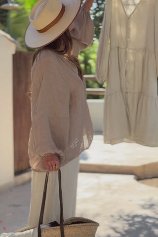 A lovely linen top with a deep v-neck and a ruffle collar. Wide puff-sleeves bring freedom to your movement, elastic cuffs.