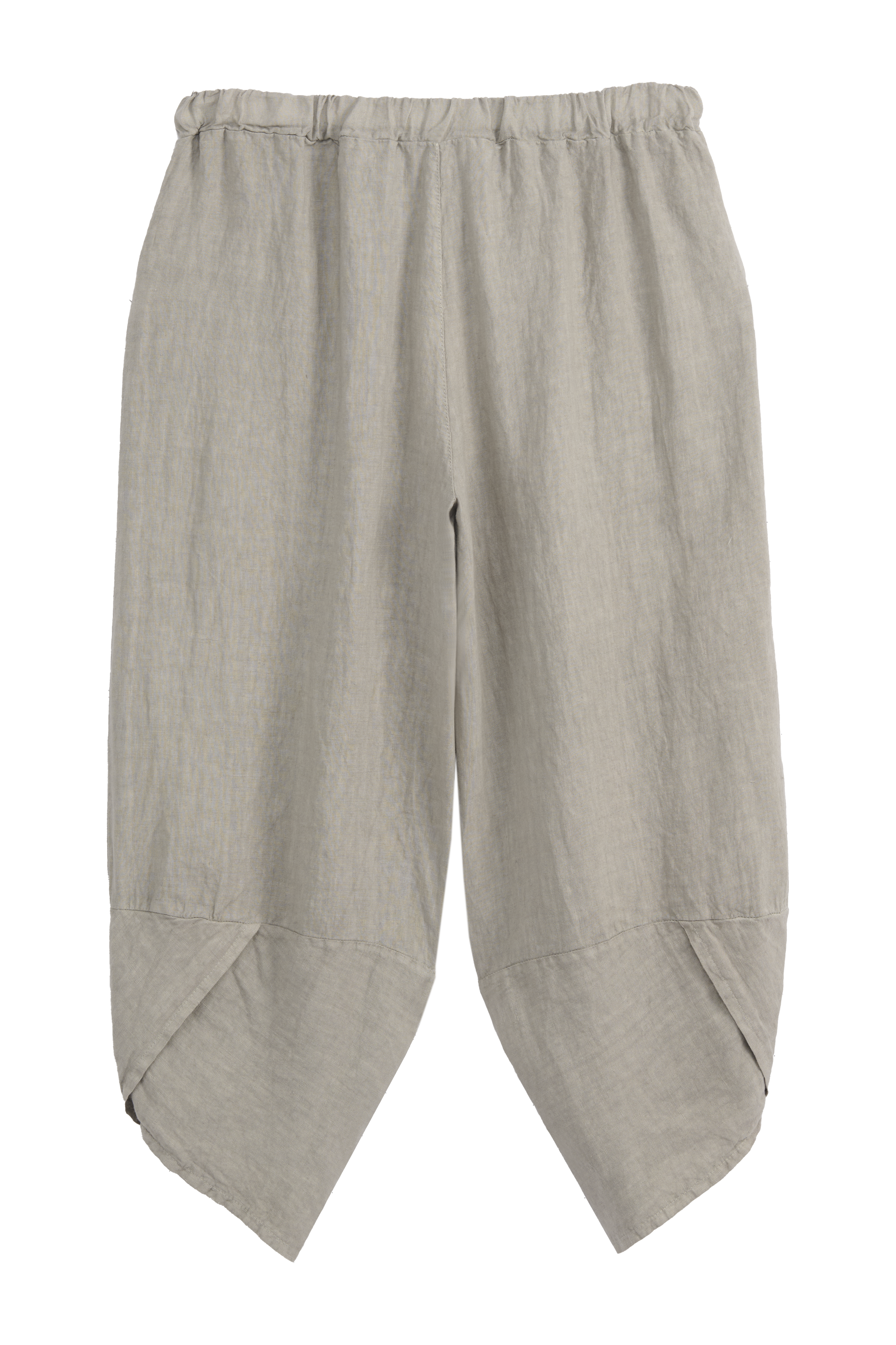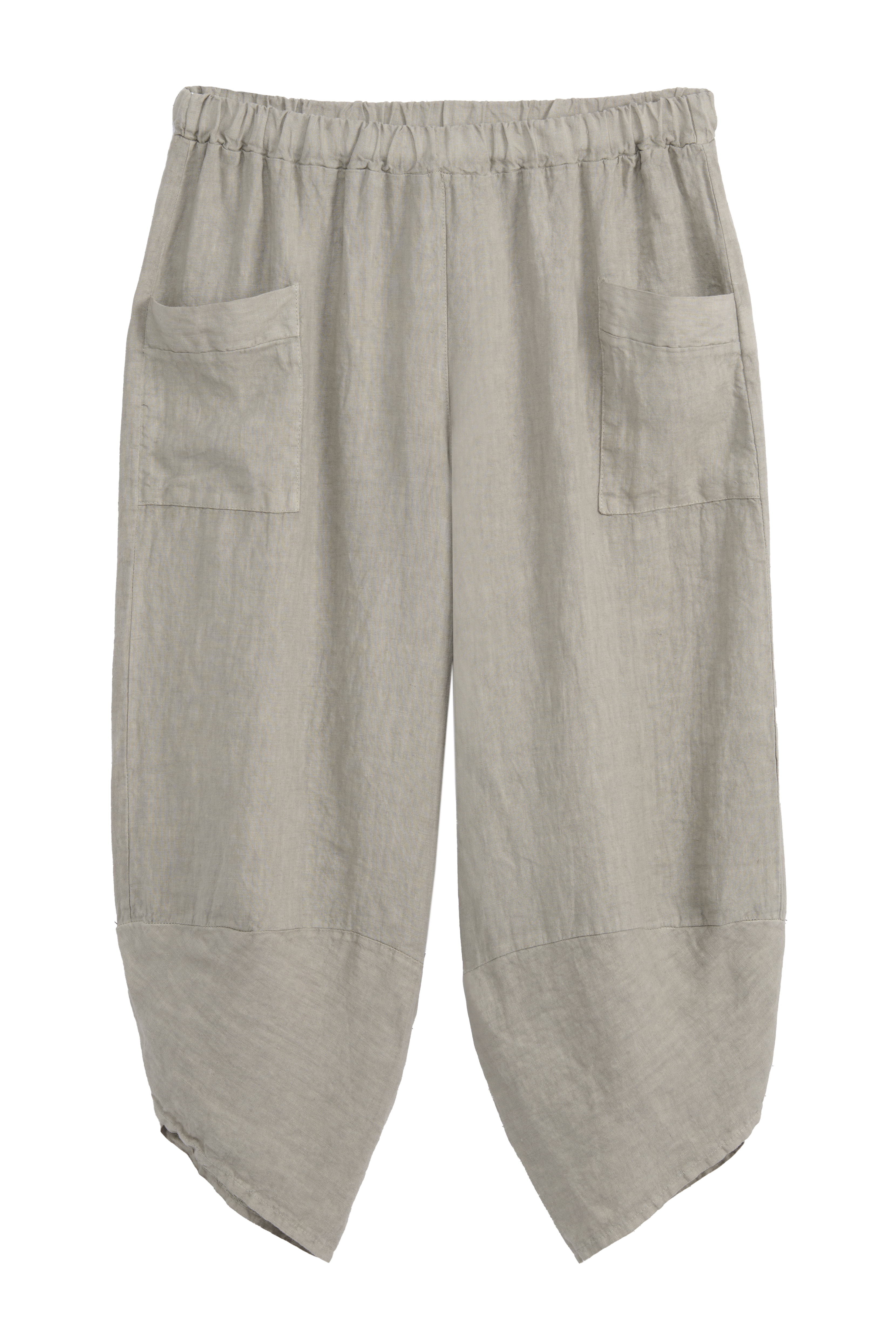Wonderfully bohemian linen pants that pair beautifully with a variety of outfits. The trousers feature a comfortable elastic waistband and unique, playful leg detailing. Practical side pockets add functionality.