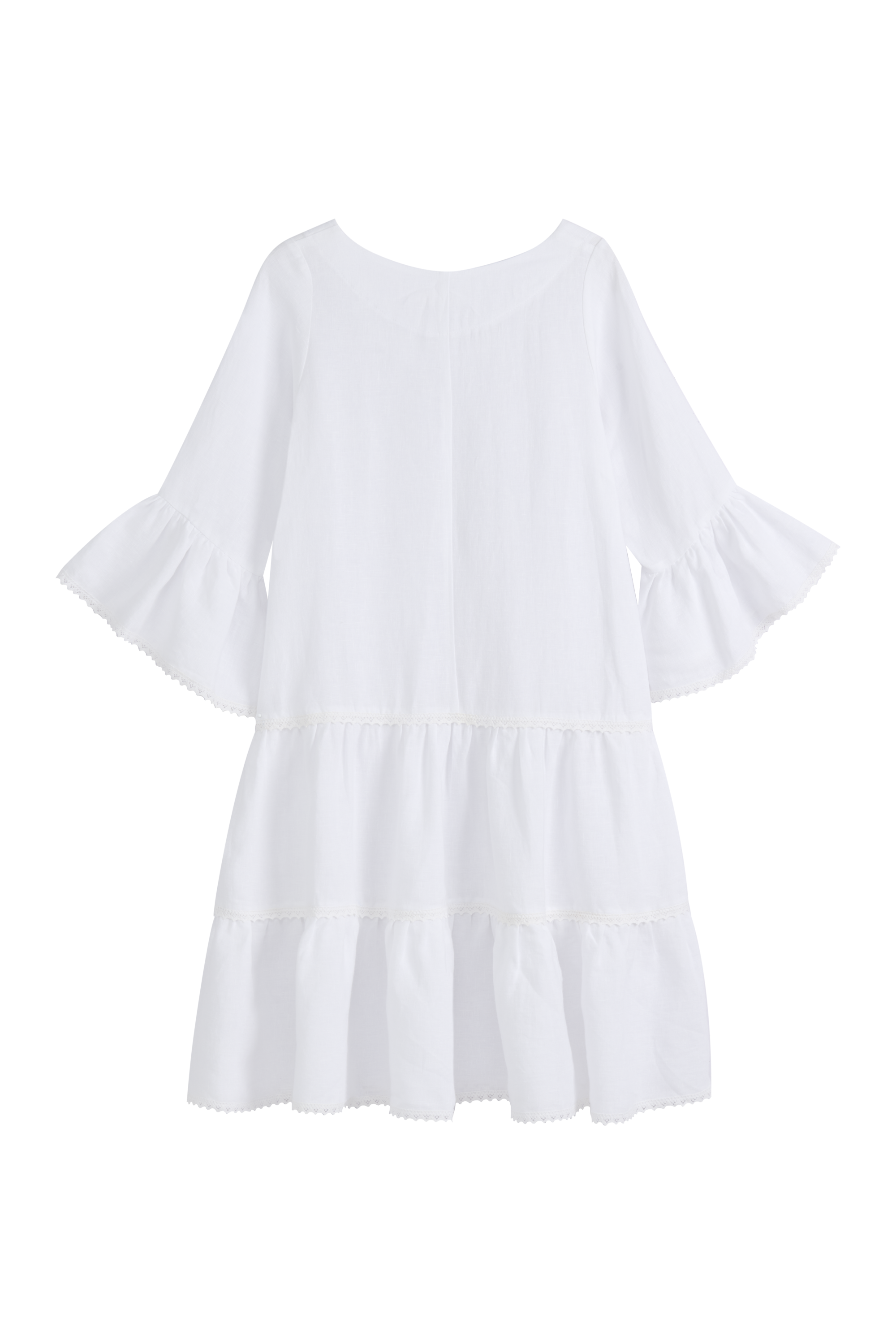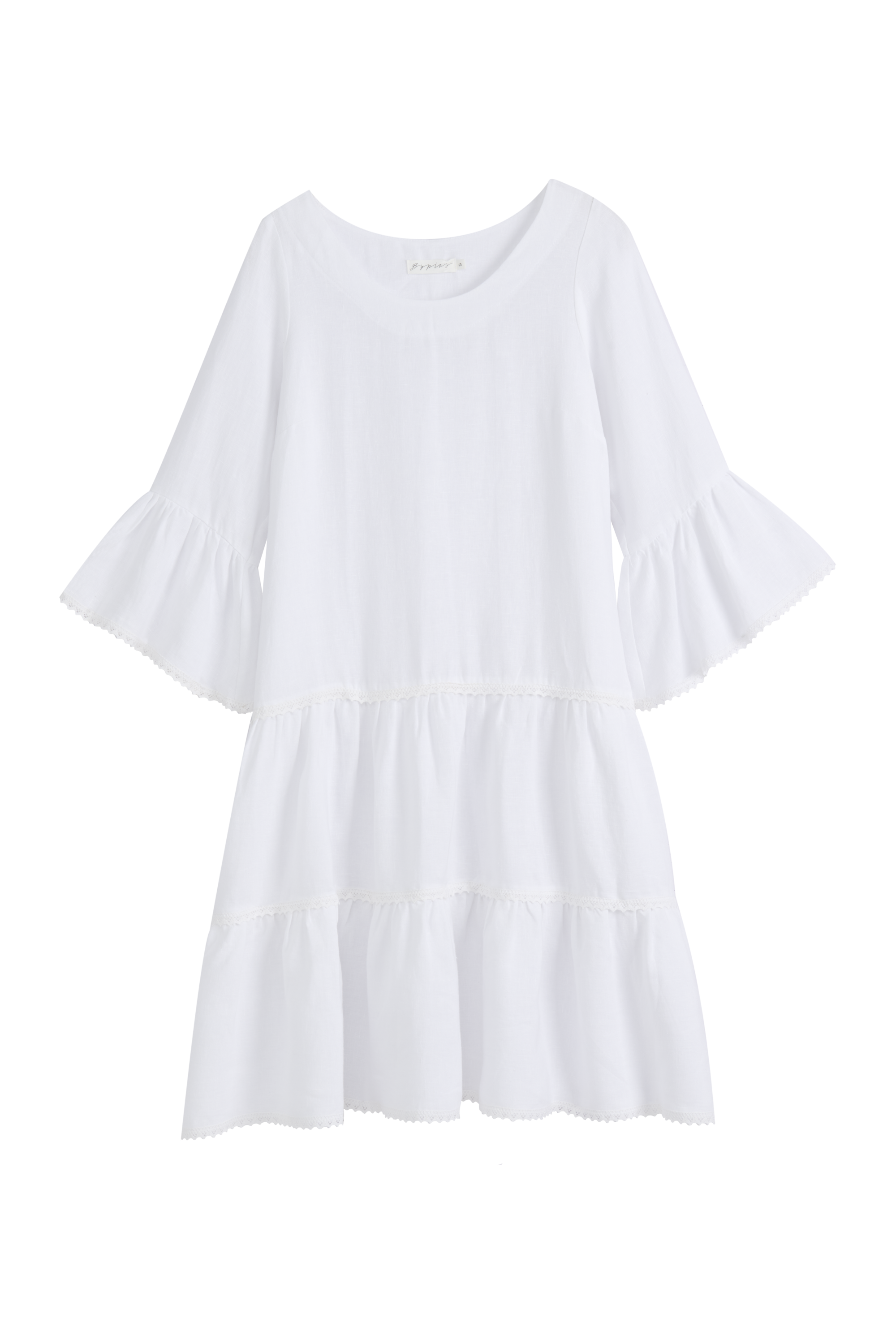 A beautiful and versatile dress dream from BYPIAS in linen, combining romantic details with a timeless silhouette. The dress features a round neckline and three-quarter sleeves adorned with delicate frills and high-quality linen lace details. The hem has a light lace trim that adds an elegant sense of airiness. The A-line shape drapes beautifully and flatters a variety of body types.