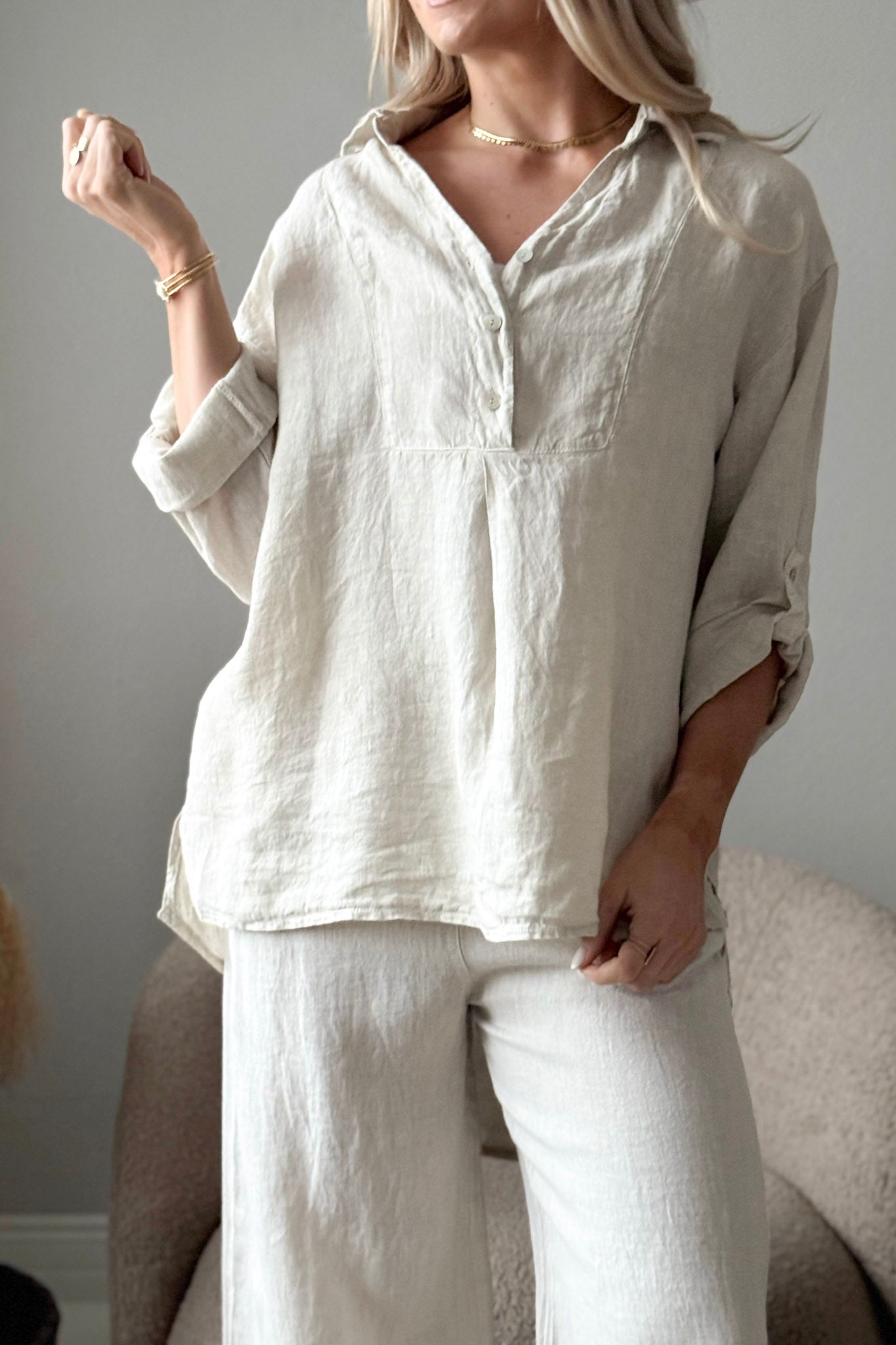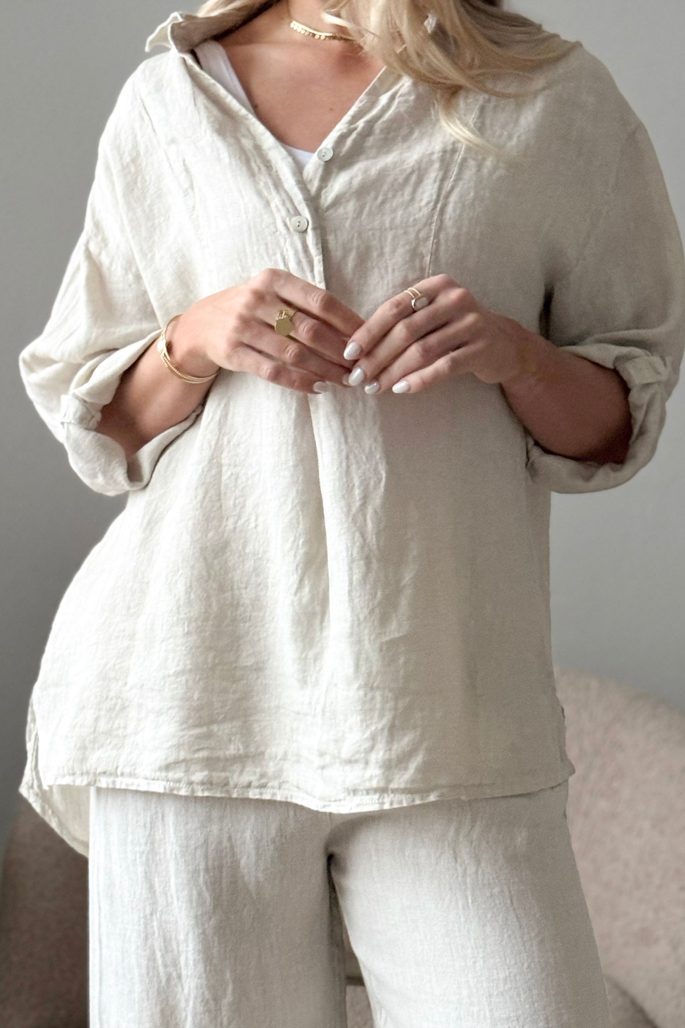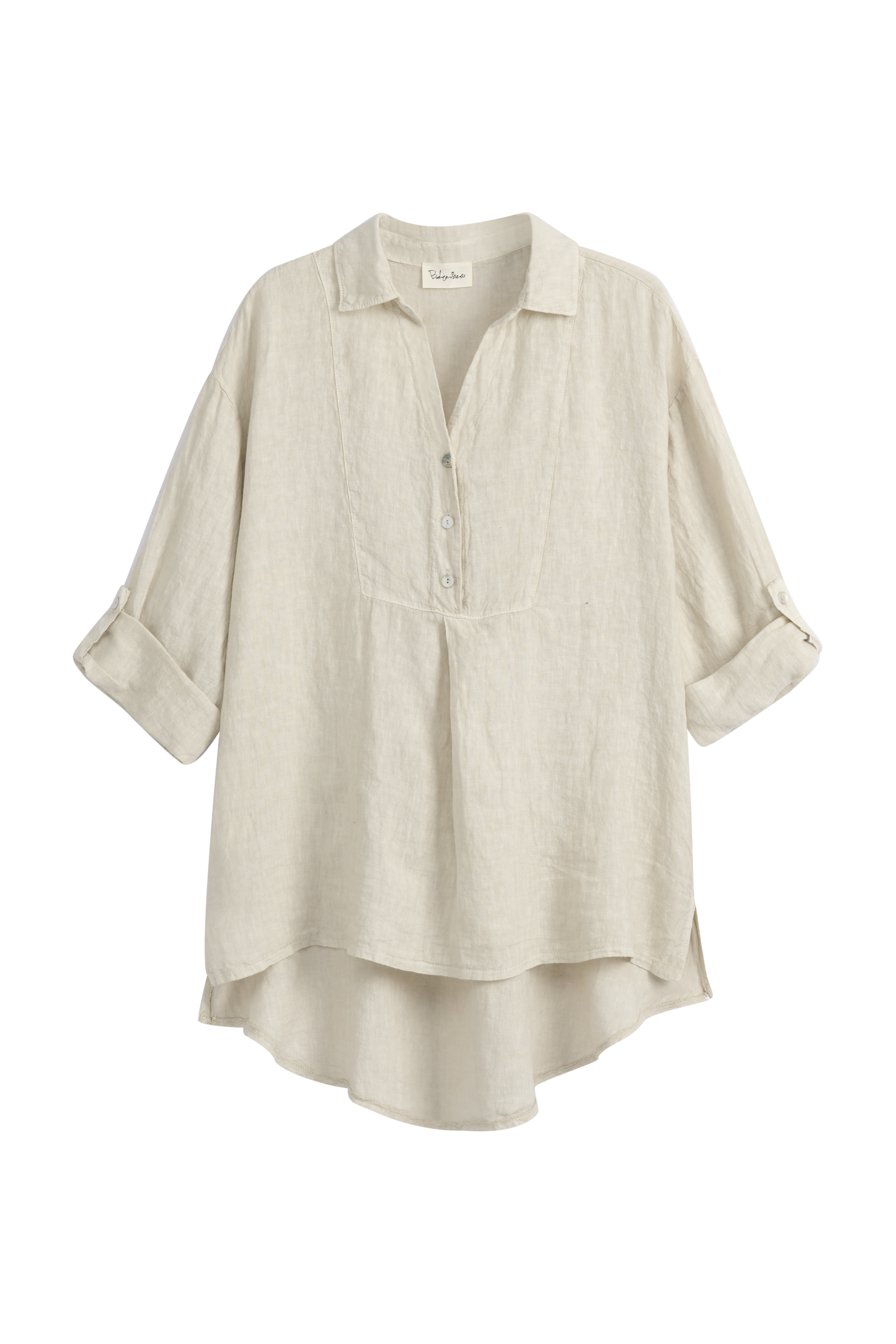 A playful linen shirt featuring a beautiful front panel with mother-of-pearl buttons as a charming detail. The sleeves can be rolled up and secured with a button, or worn open for a three-quarter length. The longer back hem adds comfort and a relaxed look. Soft and breathable linen feels pleasant against the skin, making this shirt a perfect choice for everyday wear and leisure time.