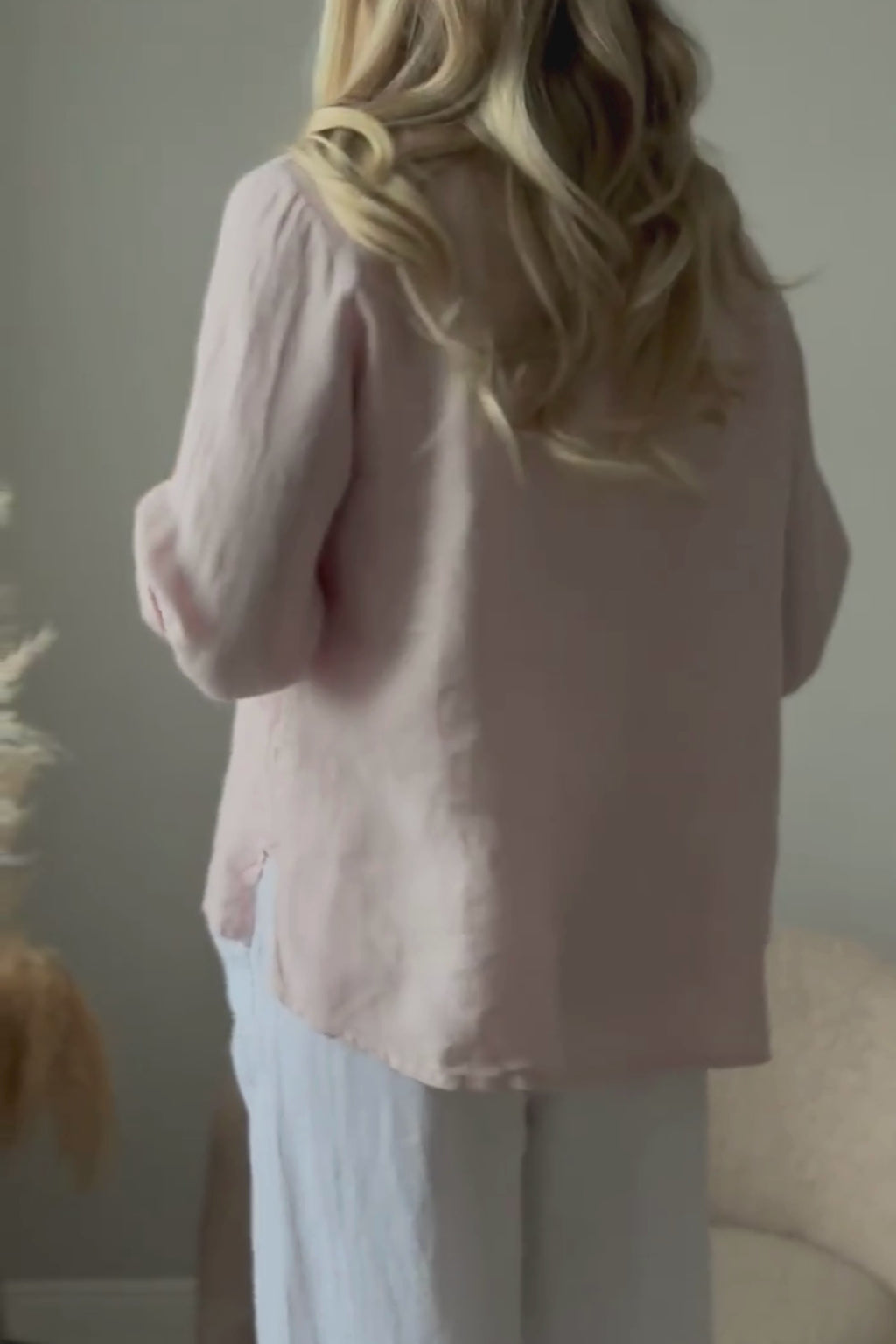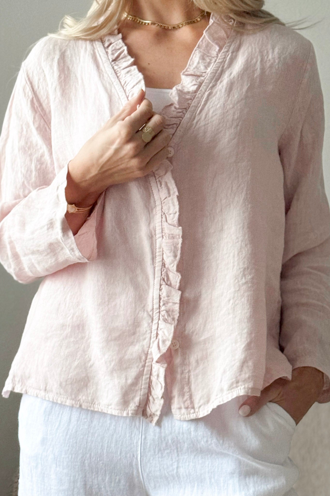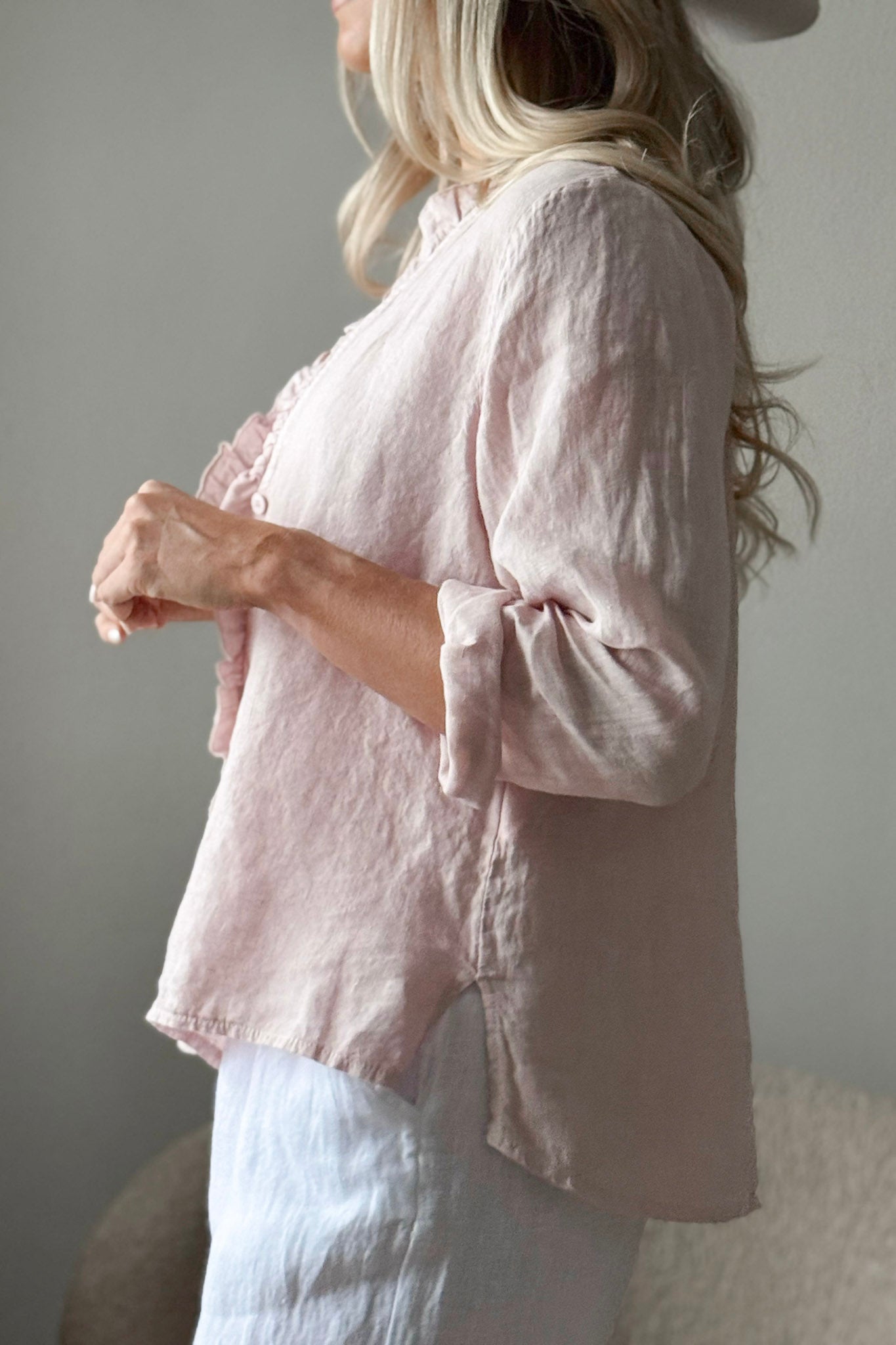 A linen shirt with a romantic ruffled collar and front button closure, highlighted by beautiful ruffle details. The 3/4-length rolled sleeves create a relaxed look, while the longer back hem adds comfort. Lightweight and breathable linen makes this shirt a pleasant choice for everyday wear and leisure time.