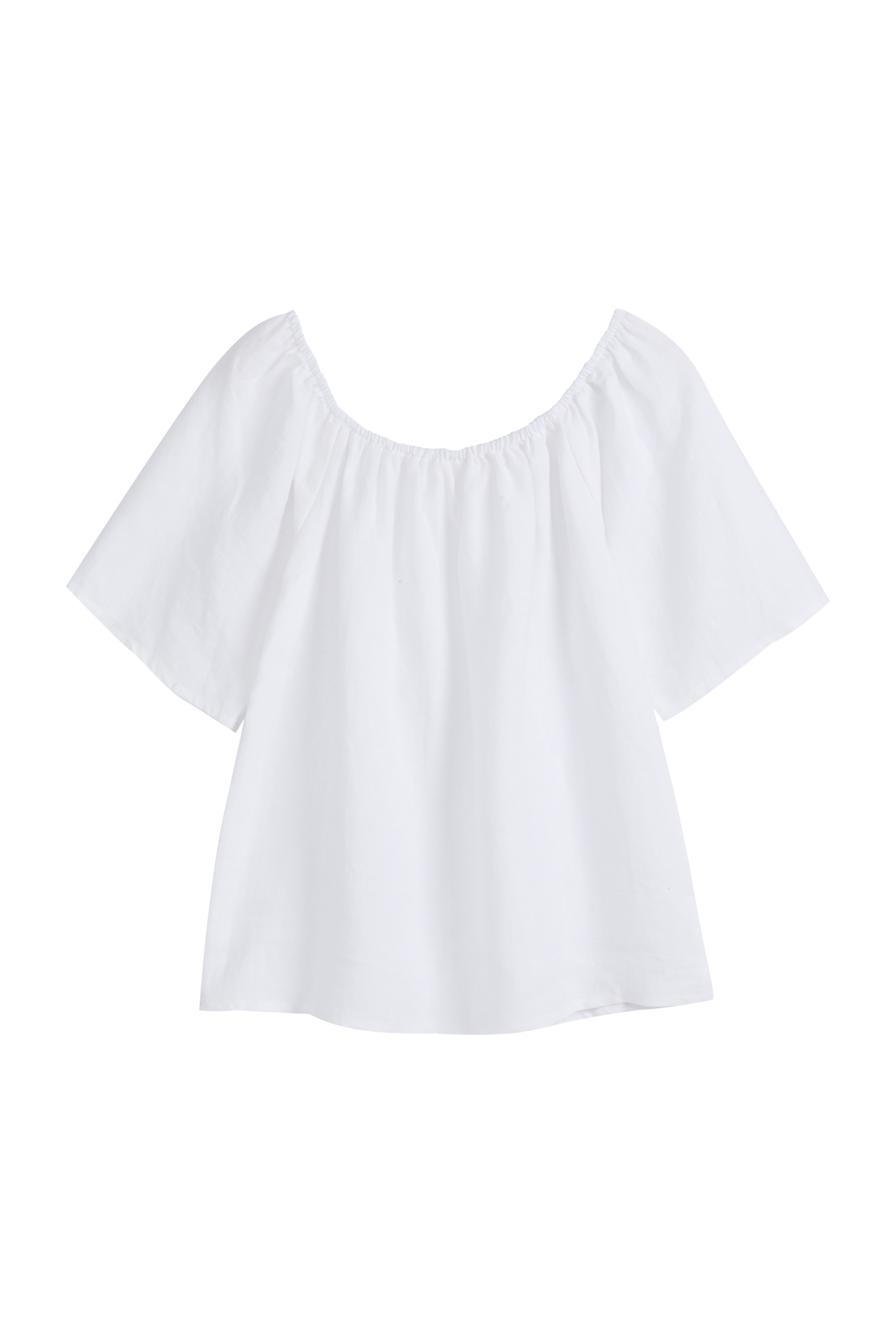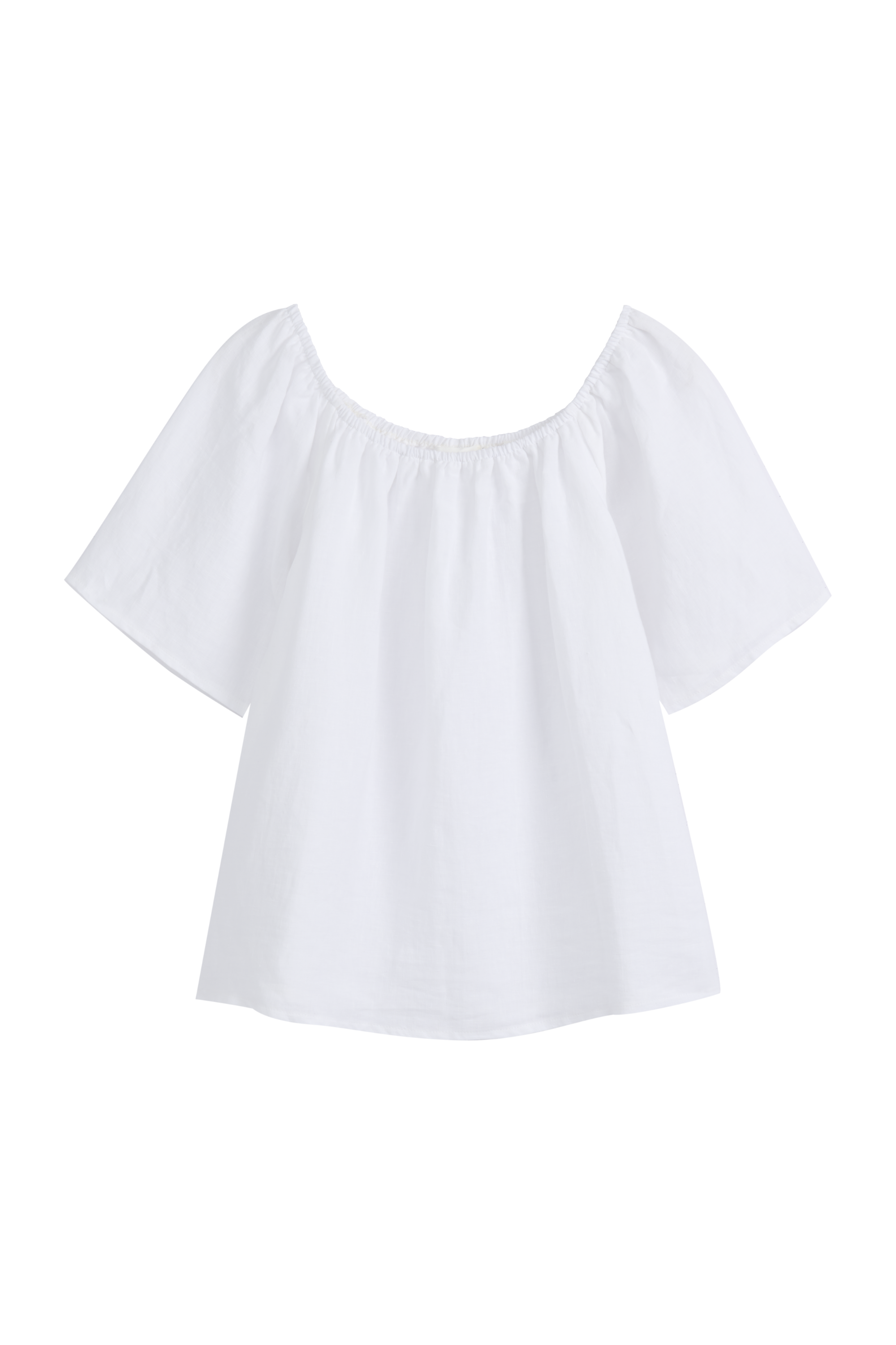 Light and airy linen off-the-shoulder top with an A-line silhouette. Features loose, slightly flared half-length sleeves. Lightweight and beautifully draped, making it an easy choice for summer outfits.