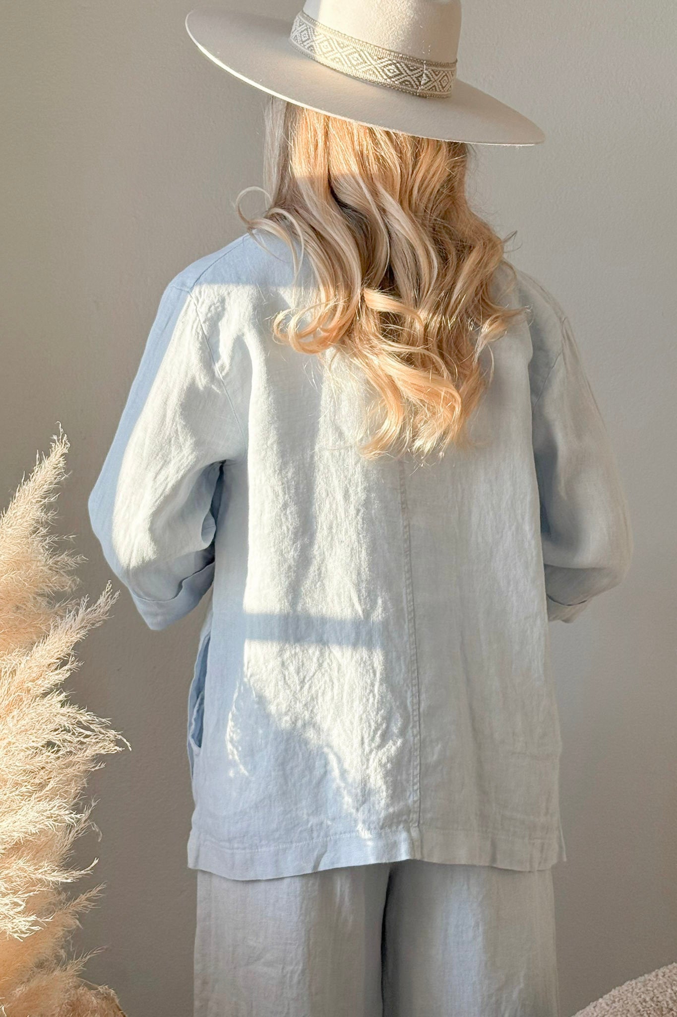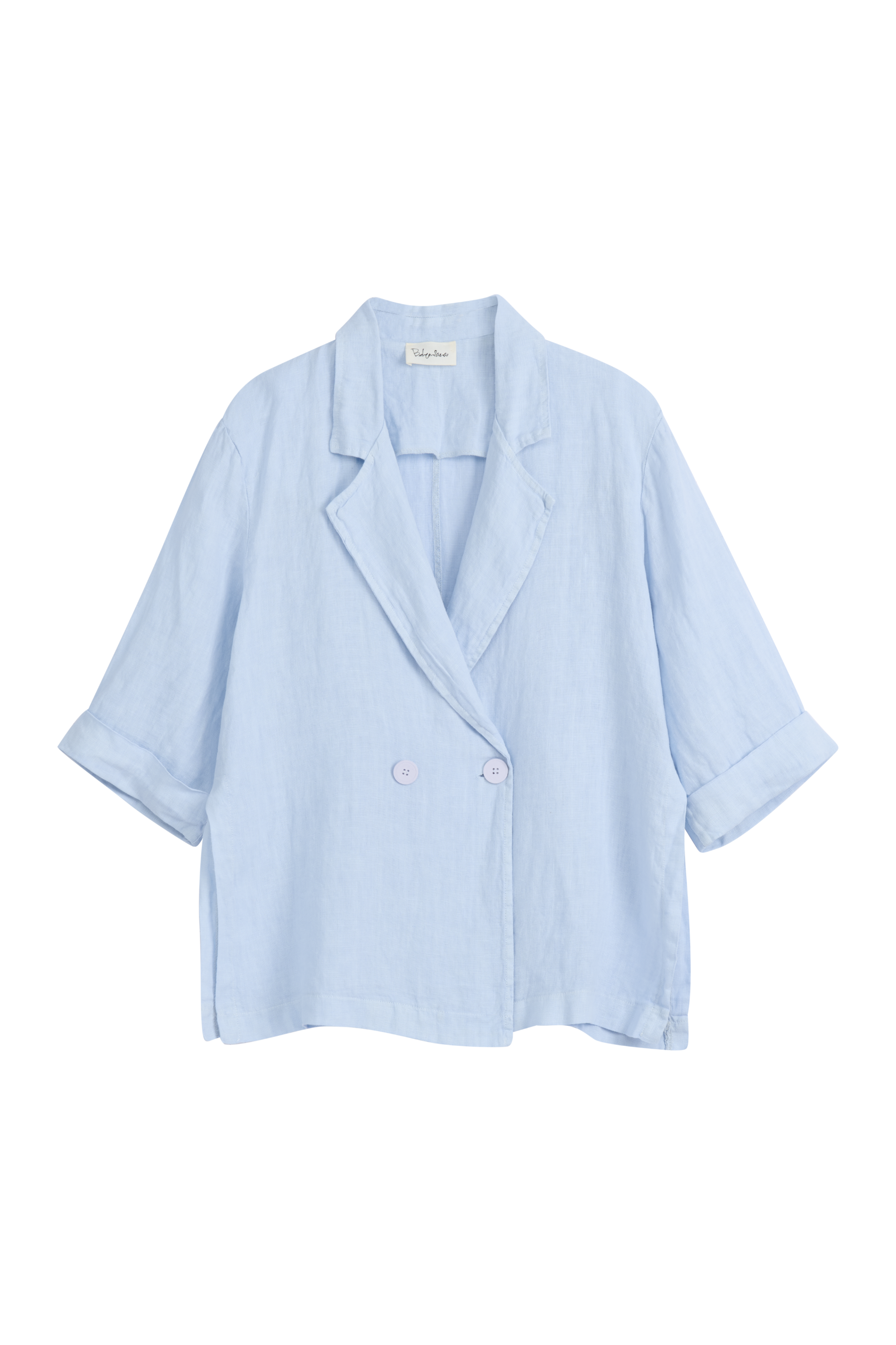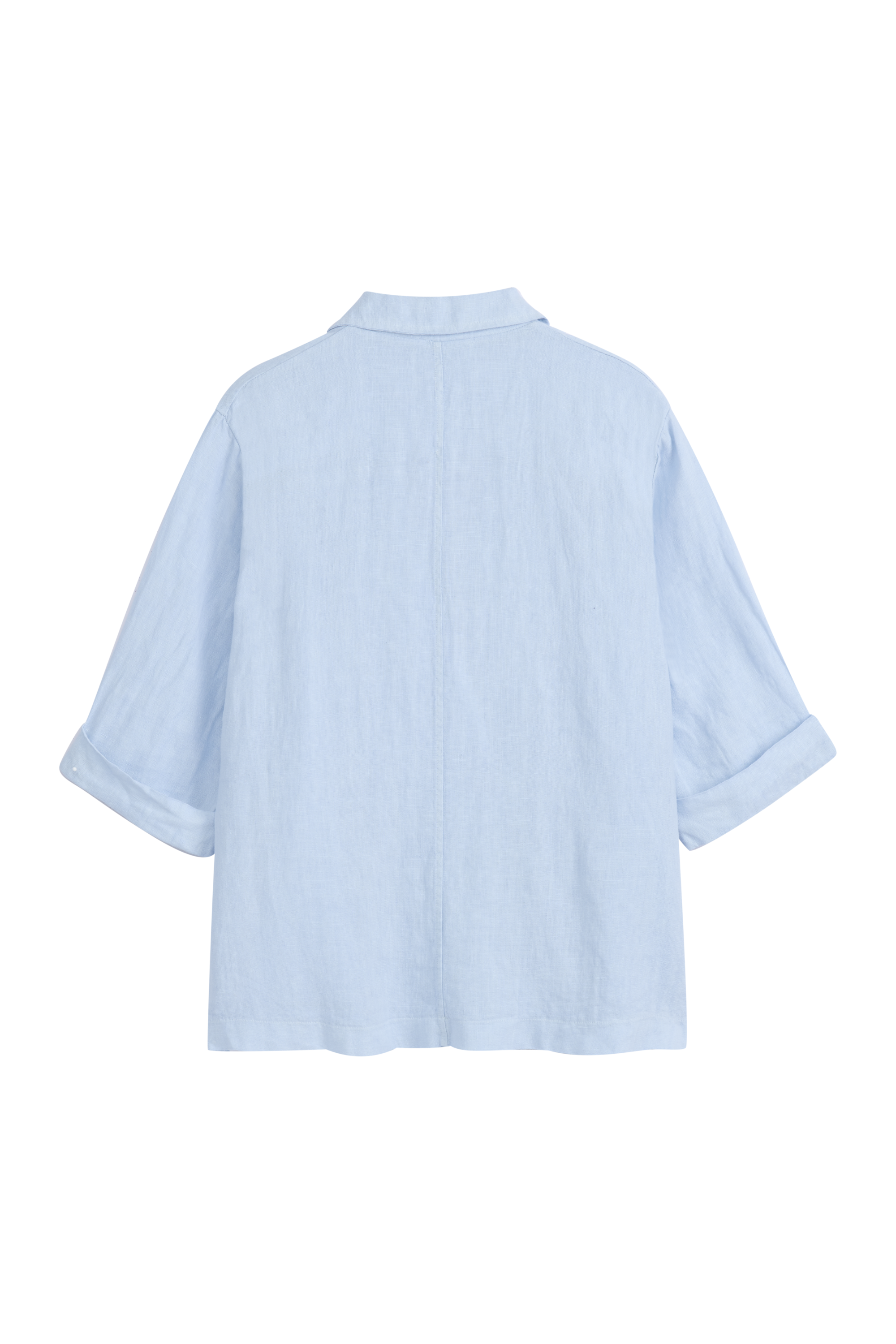 This stylish, casual linen blazer is a staple item in your wardrobe. Classic turn-down collar and two-button front closure. Deep slits on the sides. Rolled-up sleeves, 3/4 length.
