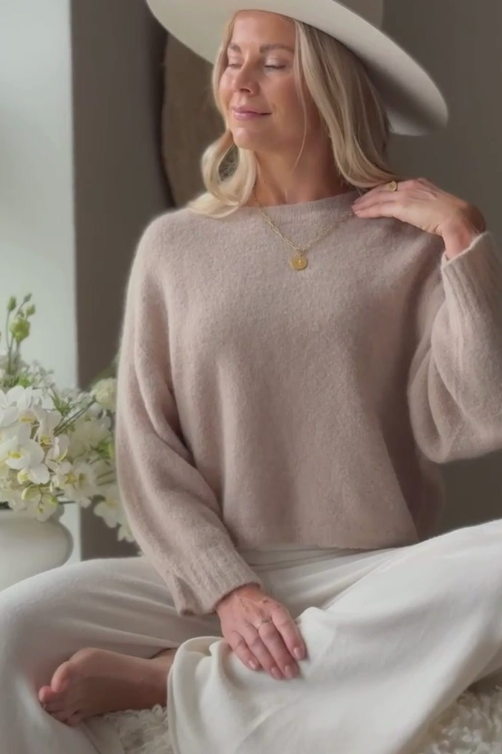Luxuriously soft and warm alpaca knit with a round neckline. Ribbed knit at the collar, hem, and cuffs adds comfort, while relaxed raglan sleeves create an easy, casual look. The shorter oversized fit works beautifully with a variety of outfits and is ideal for sizes 36–44. A longer bamboo top with or without lace can be layered underneath for added coverage and a stylish layered effect.