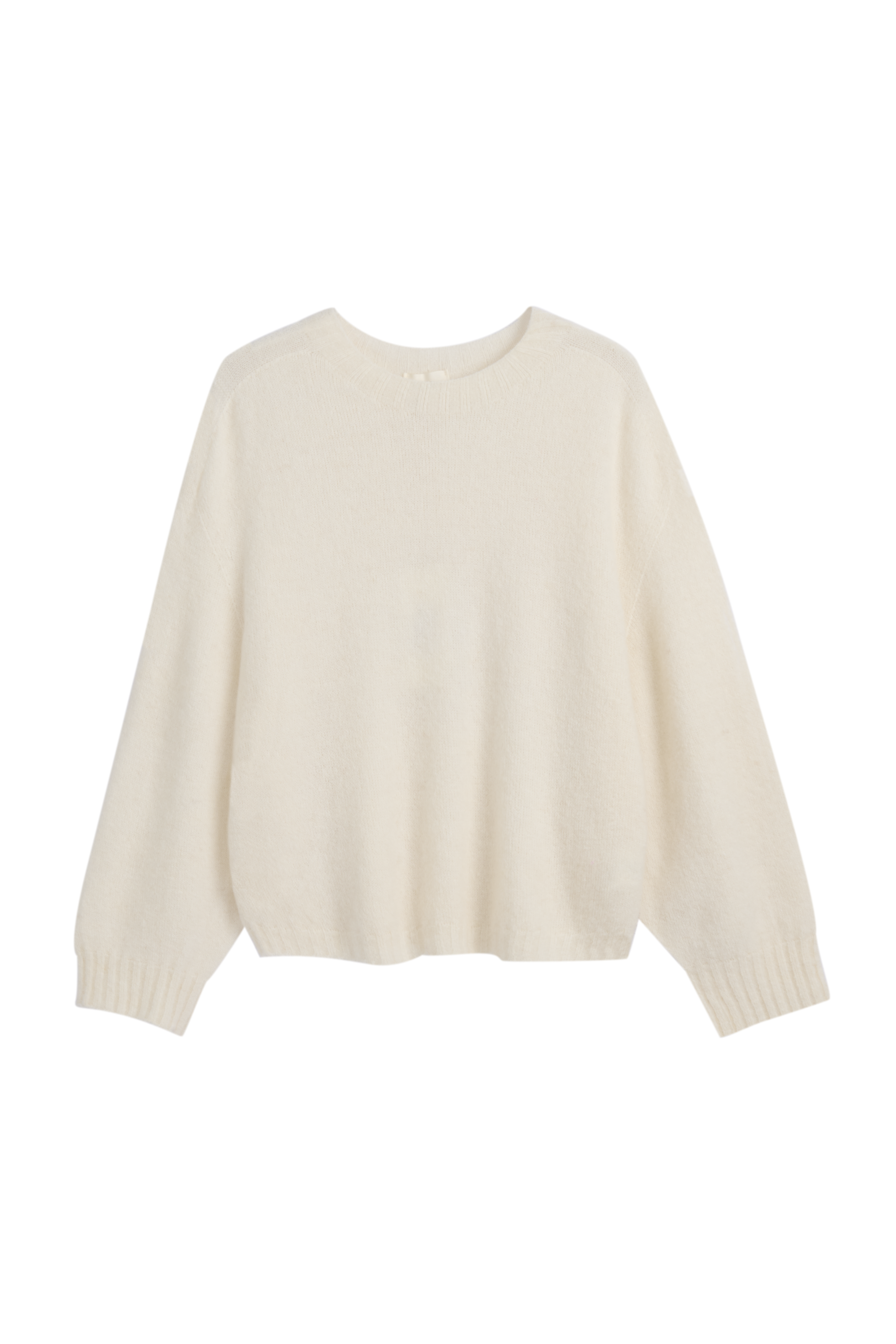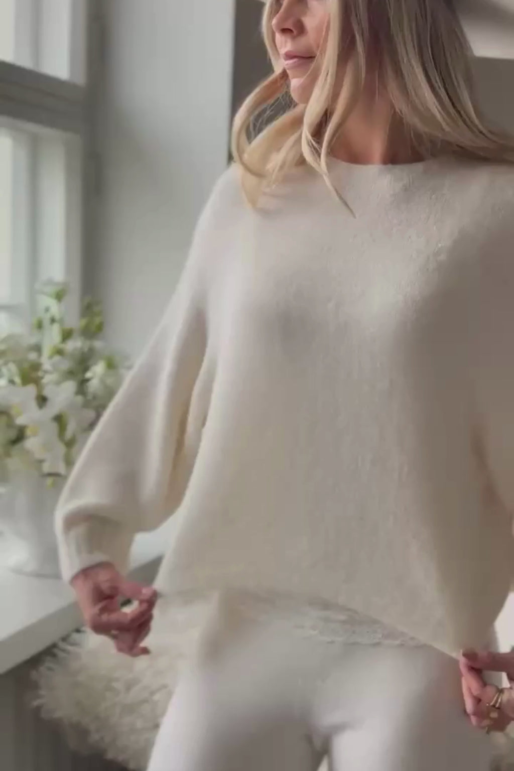 Luxuriously soft and warm alpaca knit with a round neckline. Ribbed knit at the collar, hem, and cuffs adds comfort, while relaxed raglan sleeves create an easy, casual look. The shorter oversized fit works beautifully with a variety of outfits and is ideal for sizes 36–44. A longer bamboo top with or without lace can be layered underneath for added coverage and a stylish layered effect.
