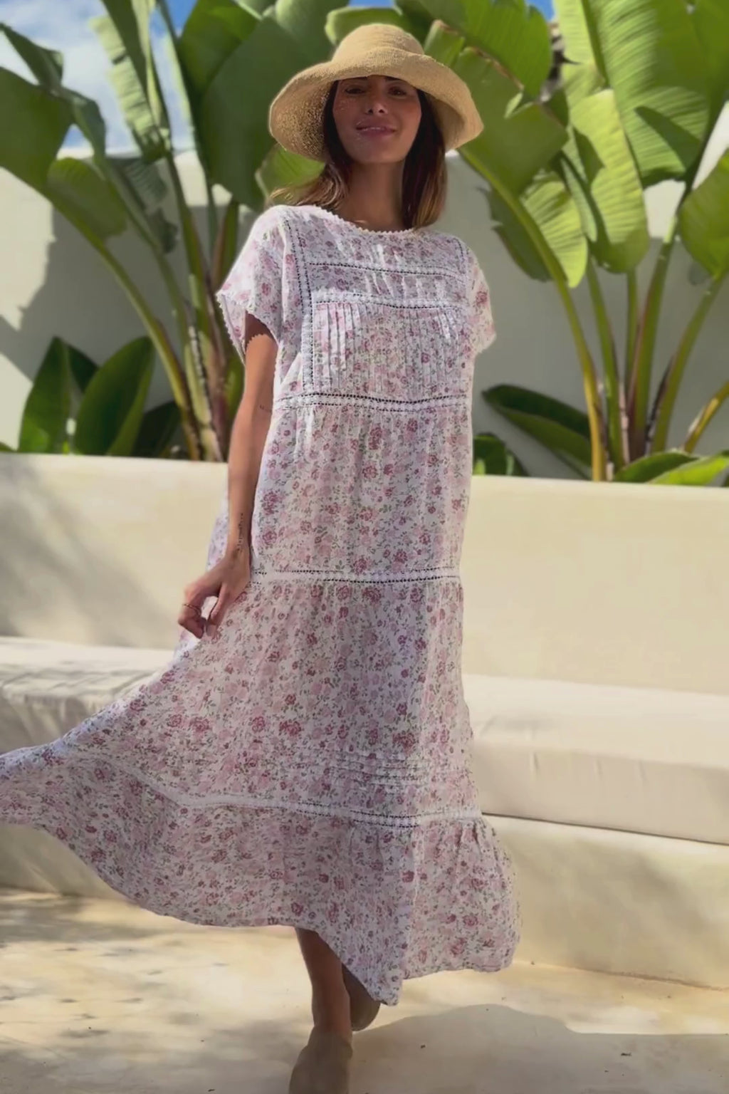 A romantic linen dress adorned with beautiful embroidery and stunning details. The dress features a lovely round neckline edged with charming embroidery, short sleeves, and frills at the hem.