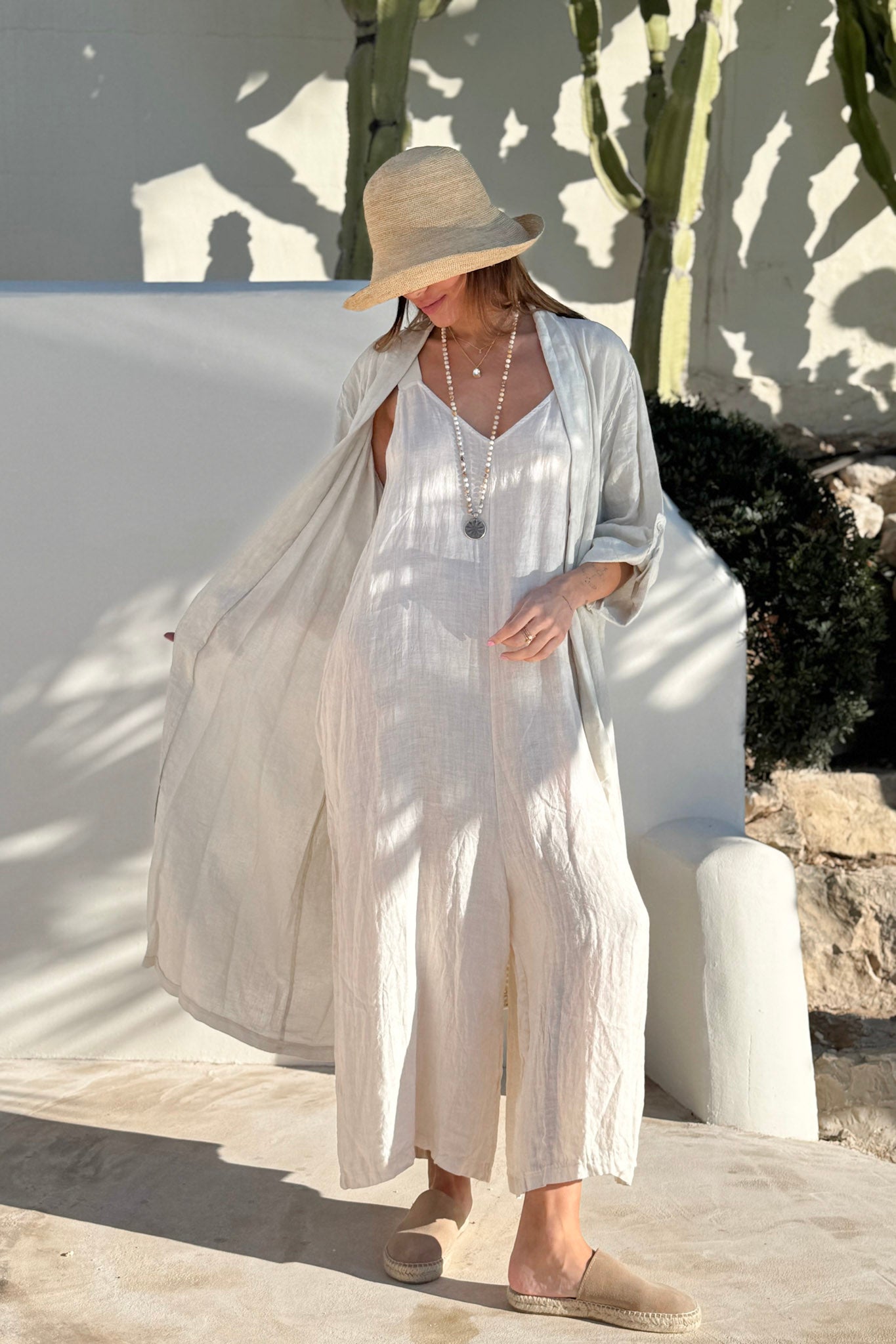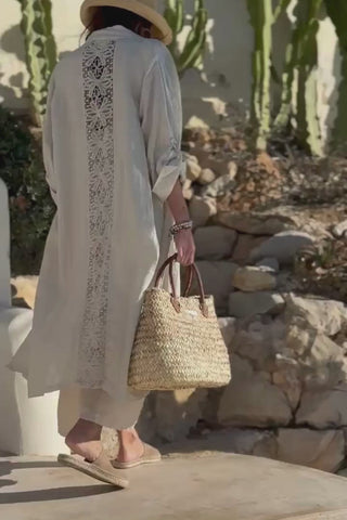 Lightweight and airy linen jacket combines relaxed elegance with refined details. The breathable linen fabric feels comfortable to wear, while the striking crocheted lace detail on the back adds a feminine touch. Rolled-up, mid-length sleeves with button fastening and a loose, beautifully draped cut create an effortlessly stylish silhouette.